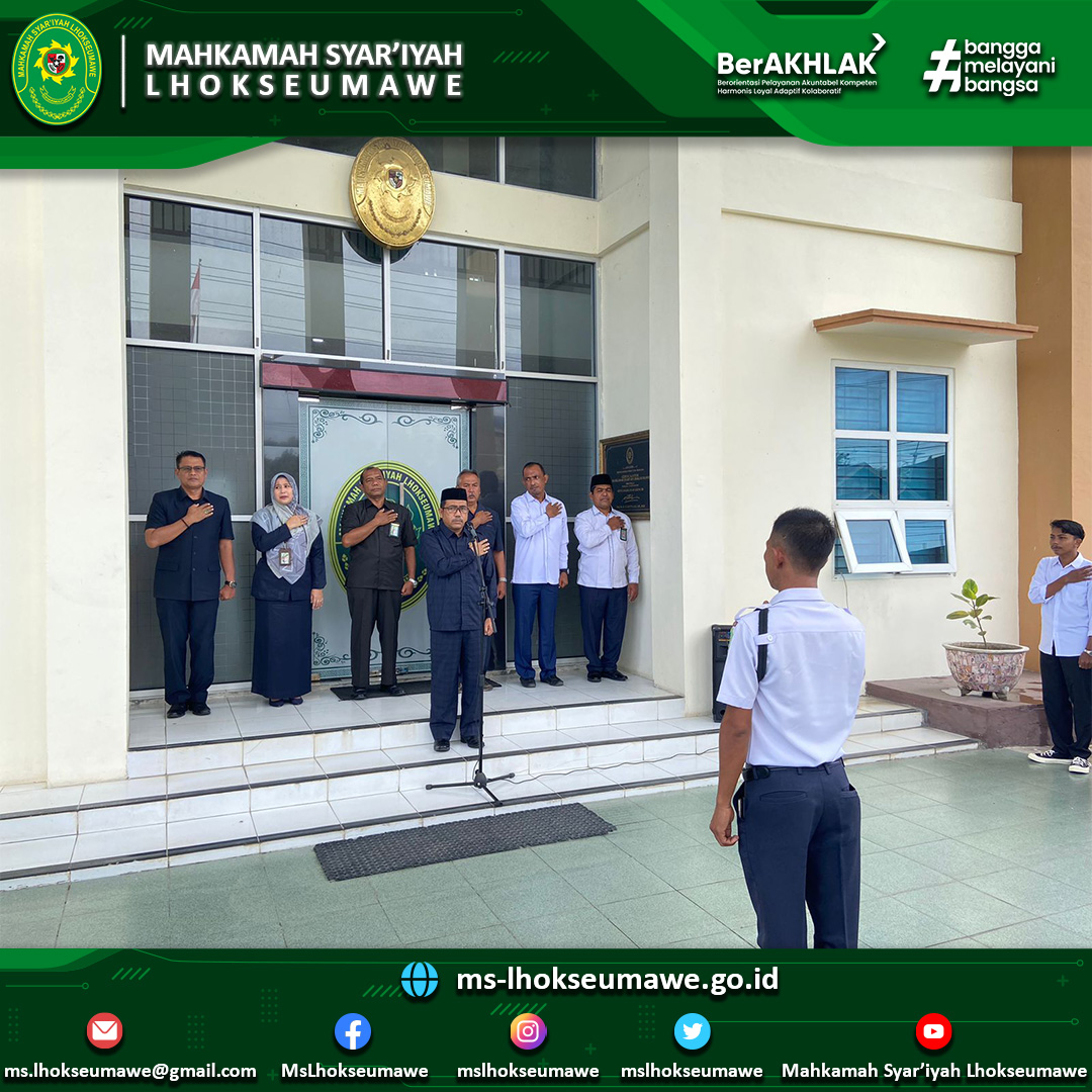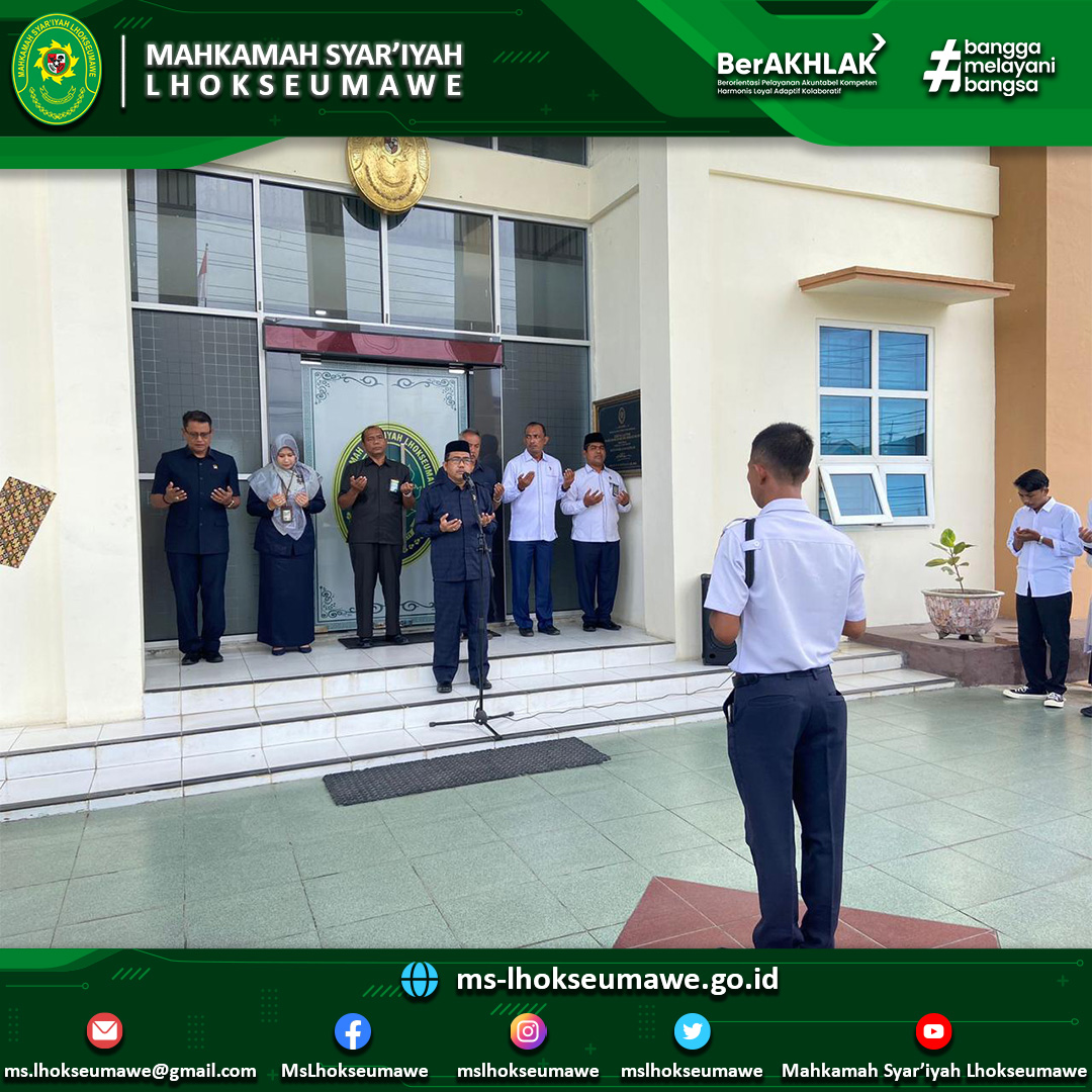 ms-lhokseumawe.go.id | Senin, 03 Oktober 2022 – Bertempat di halaman utama Mahkamah Syar’iyah Lhokseumawe (MS Lhokseumawe), tepat pukul 08.00 WIB seluruh aparatur Mahkamah Syar’iyah Lhokseumawe dan seluruh mahasiswa/i OJT berkumpul untuk melaksanakan kegiatan rutin apel pagi. Bertindak sebagai Pembina Apel Wakil Ketua Mahkamah Syar’iyah Lhokseumawe Bapak Amrin Salim, S.Ag., M.A. dan sebagai Komandan Apel Bapak Ivanda Juniardi (PPNPN) serta sebagai Pembaca Doa Bapak Safrizal, S.H.I (PPNPN) dan sebagai Pemandu 8 Nilai Mahkamah Agung Bapak Mulawarman, S.H. (CPNS).