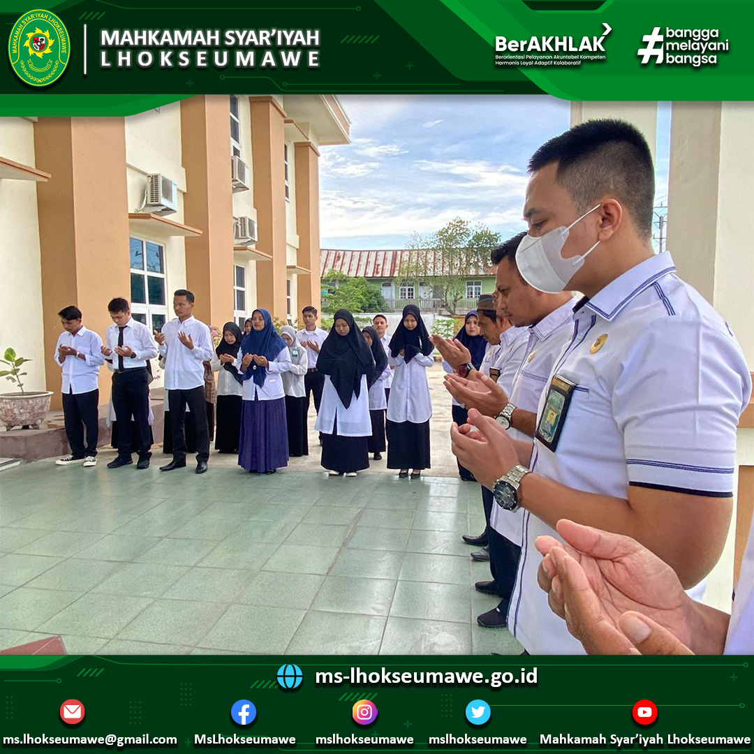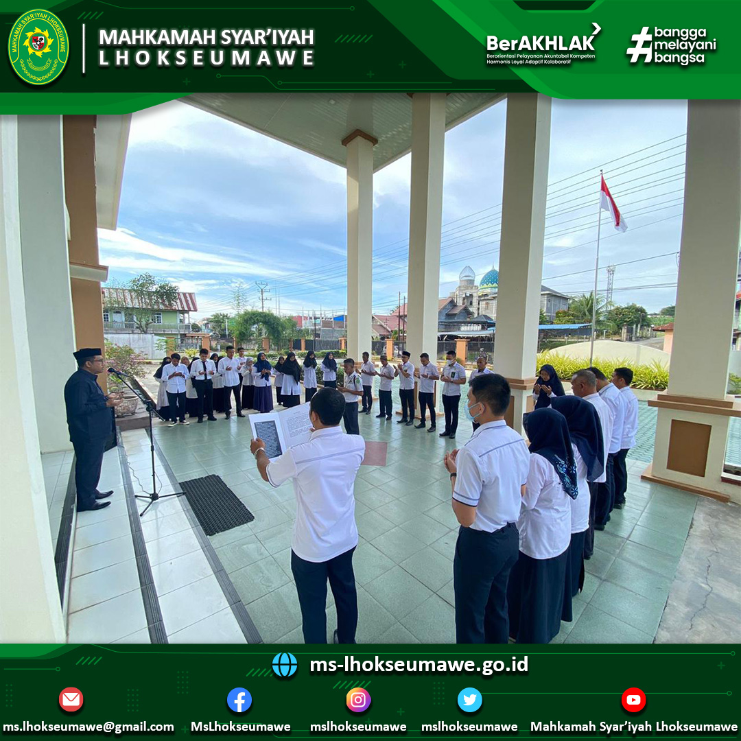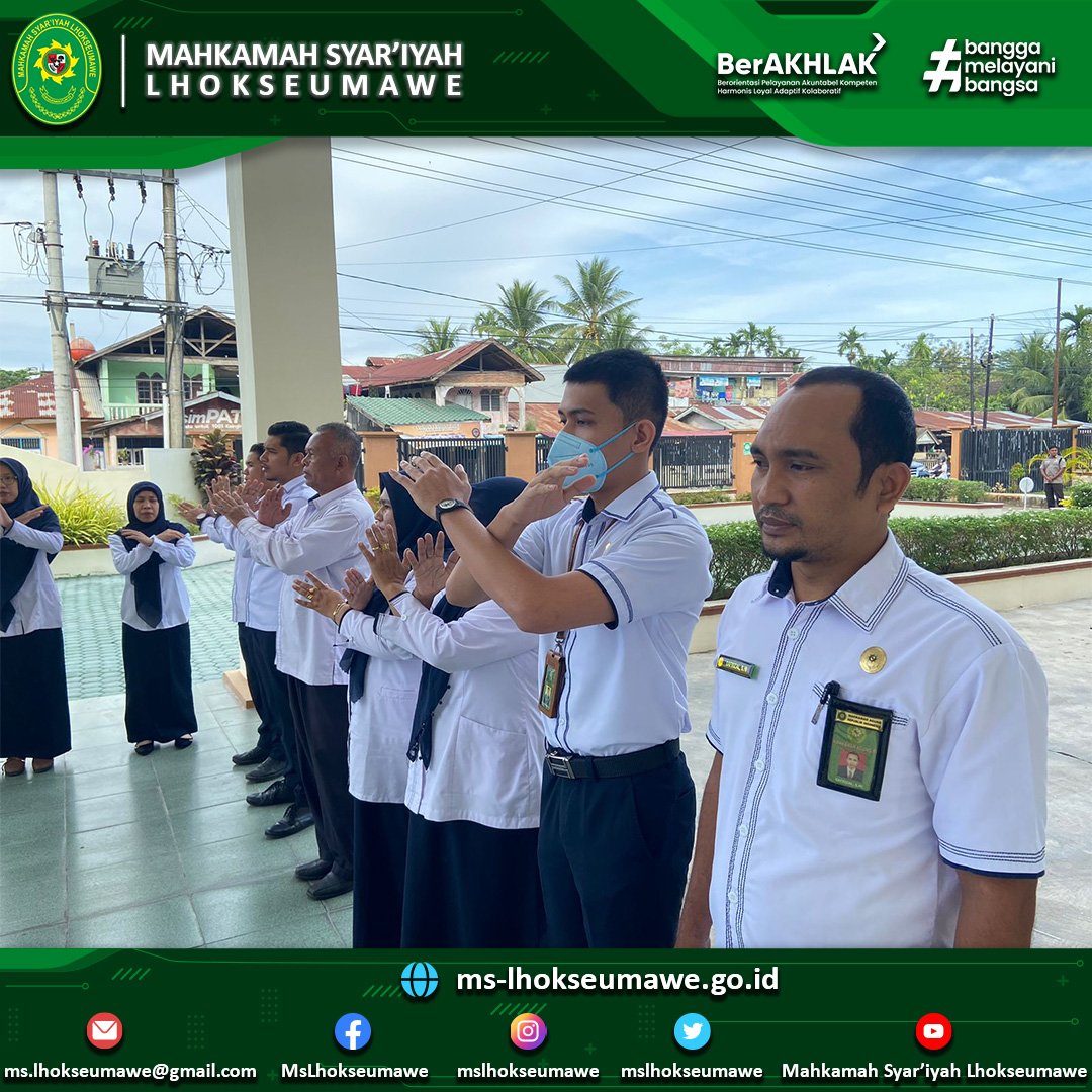 Sesuai dengan kegiatan rutin yang dilakukan, apel pagi tepat dilakukan pukul 08.00 WIB dimulai dengan persiapan peserta oleh komandan apel. kegiatan dilanjutkan dengan pembacaan doa dan dilanjutkan dengan peragaan 8 Nilai Utama Mahkamah Agung oleh seluruh peserta Apel yang dipandu oleh Bapak Fauzan Prasetya. Dalam amanat apel, ada beberapa point yang menjadi perhatian penting bagi pimpinan dan seluruh aparatur mahkamah Syar’iyah Lhokseumawe.