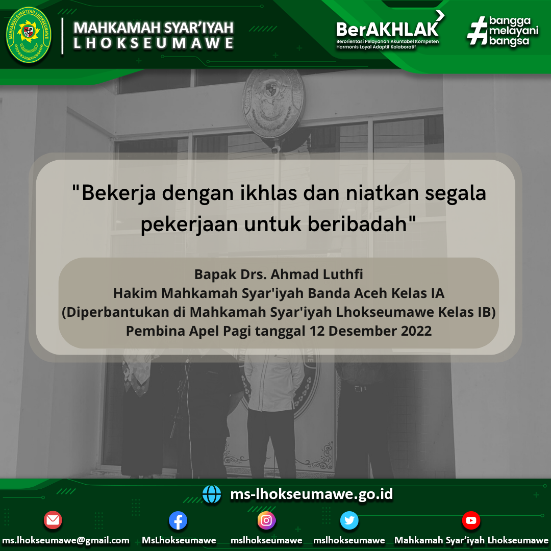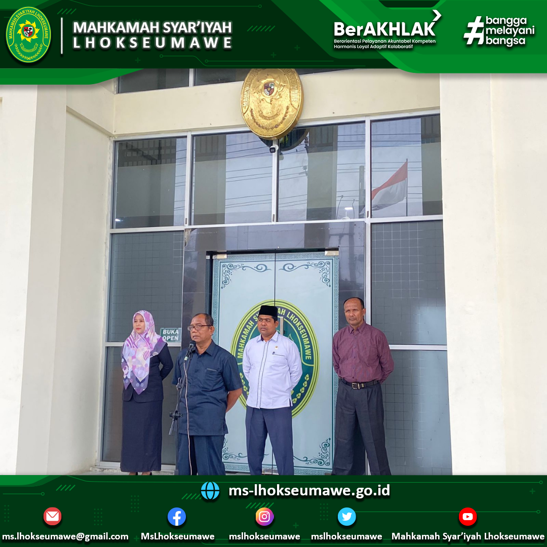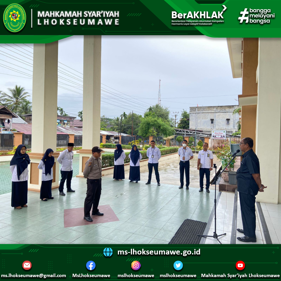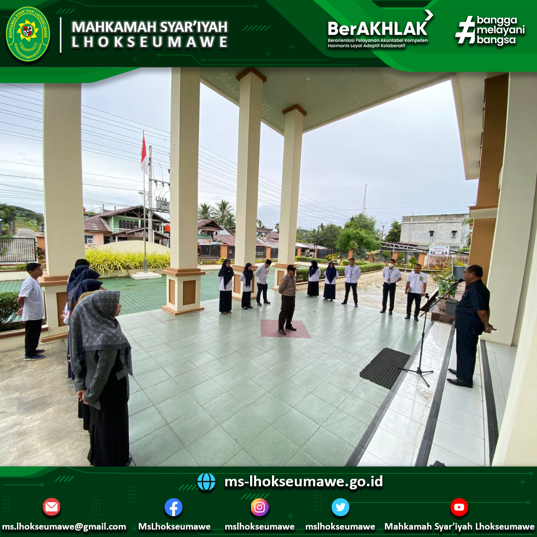 Apel Pagi Mahkamah Syar’iyah Lhokseumawe, 12 Desember 2022 Mon, 12 December 2022 Apel Pagi Mahkamah Syar’iyah Lhokseumawe, 12 Desember 2022 Pembina Apel: Drs. Ahmad Luthfi (Hakim) Komandan Apel: Razali (PPNPN) Pembaca Do’a: Safrizal, S.H.I (PPNPN) Pembaca Nilai Utama MARI: Mula Warman Harahap, S.H. (CPNS) Previous Post MS Lhokseumawe ikuti Bimtek Peningkatan Kompetensi Tenaga Teknis di Lingkungan Peradilan Agama Secara Online Next Post Ketua MS Lhokseumawe hadiri undangan Rapat Evaluasi Pelaksanaan Syariat Islam