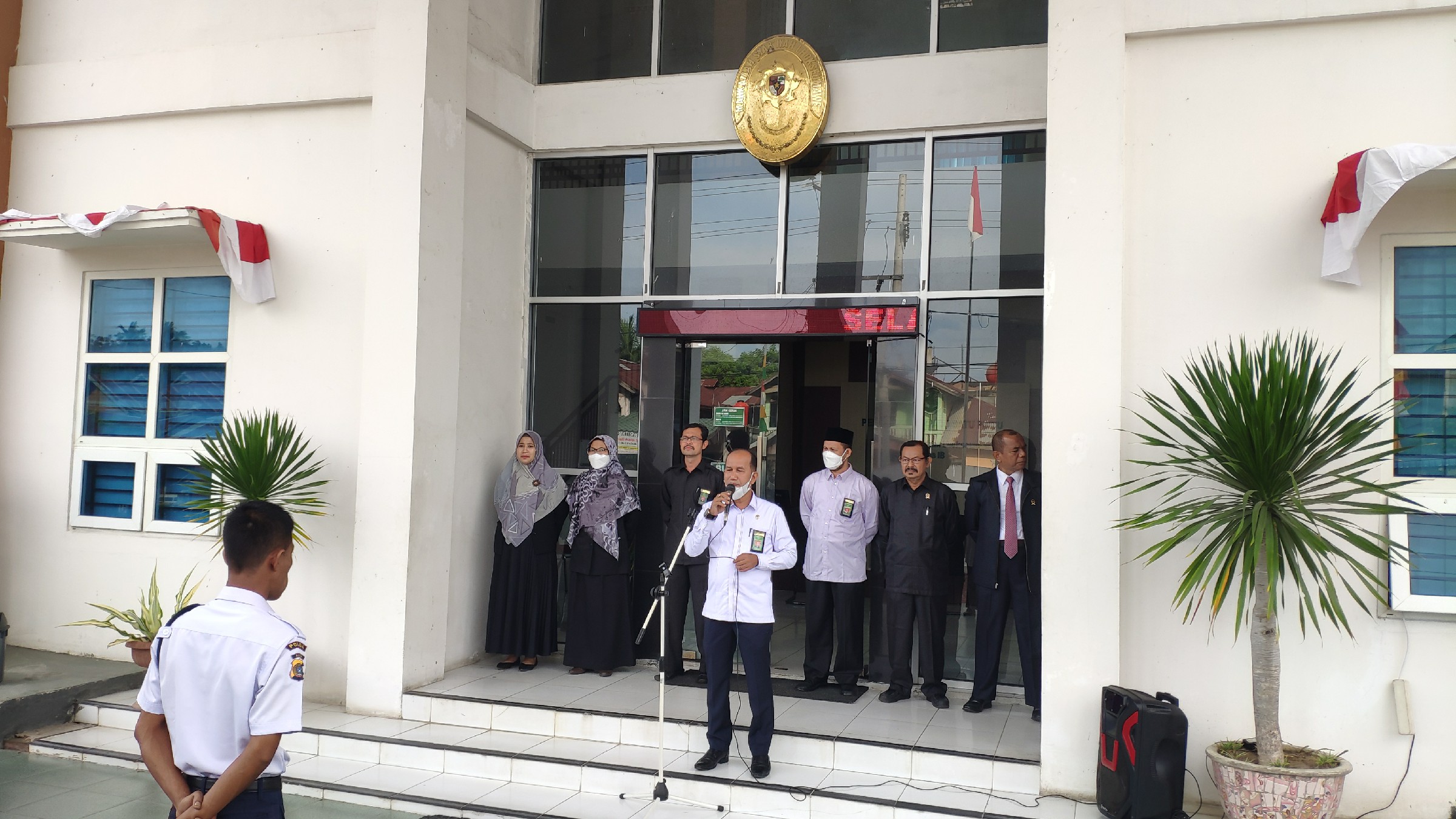 Senin, 09 Agustus 2021 – MS lhokseumawe melaksanakan kegiatan rutin apel pagi tepat pada pukul 08.00 WIB di halaman kantor. Apel pagi harini bertindak sebagai pembina apel adalah Sekretaris MS Lhokseumawe Syarbaini, S.Ag. Pembina apel dalam sambutannya berpesan kepada seluruh Aparatur MS Lhokseumawe yang dalam masa pandemi covid-19 ini agar selalu mentaati protokol kesehatan terutama pada bagian Pelayanan Sidang dan Petugas PTSP. Selain itu, dalam hal meningkatkan disiplin kerja, yang menjadi perhatian adalah seluruh aspek pekerjaan demi meningkatkan pelayanan publik. Tidak lupa Pembina apel juga mengingatkan agar dalam bekerja selalu diniatkan untuk beribadah. Dalam penutup apel, pembina apel beserta dengan seluruh peserta apel, memimpin doa bersama agar diberikan kemudahan dan kelancaran untuk kegiatan kedepan.