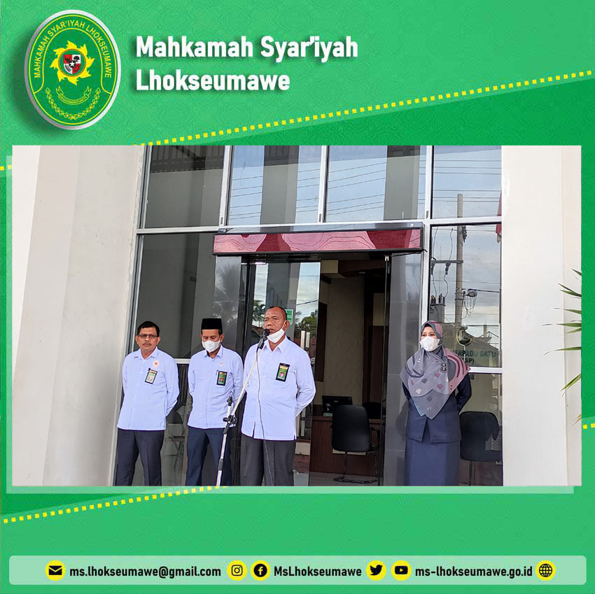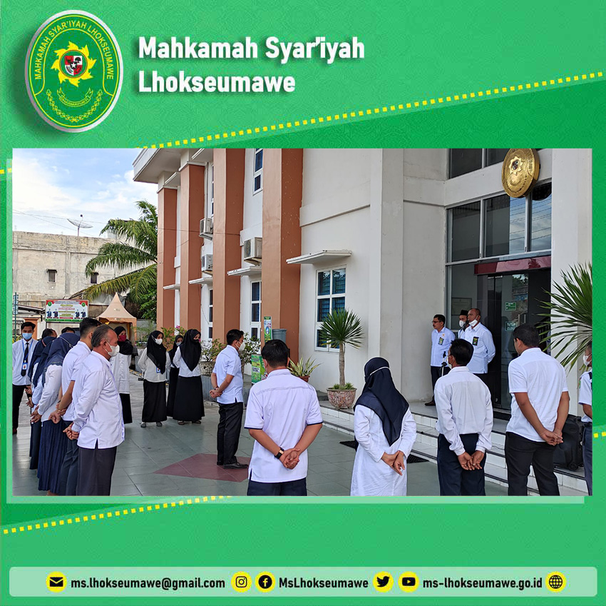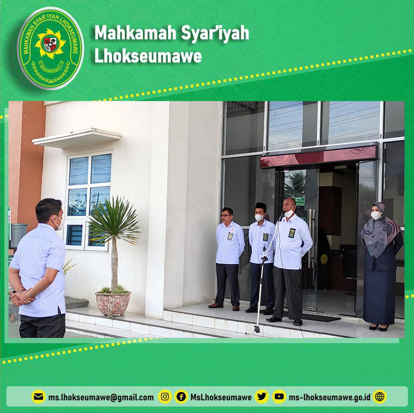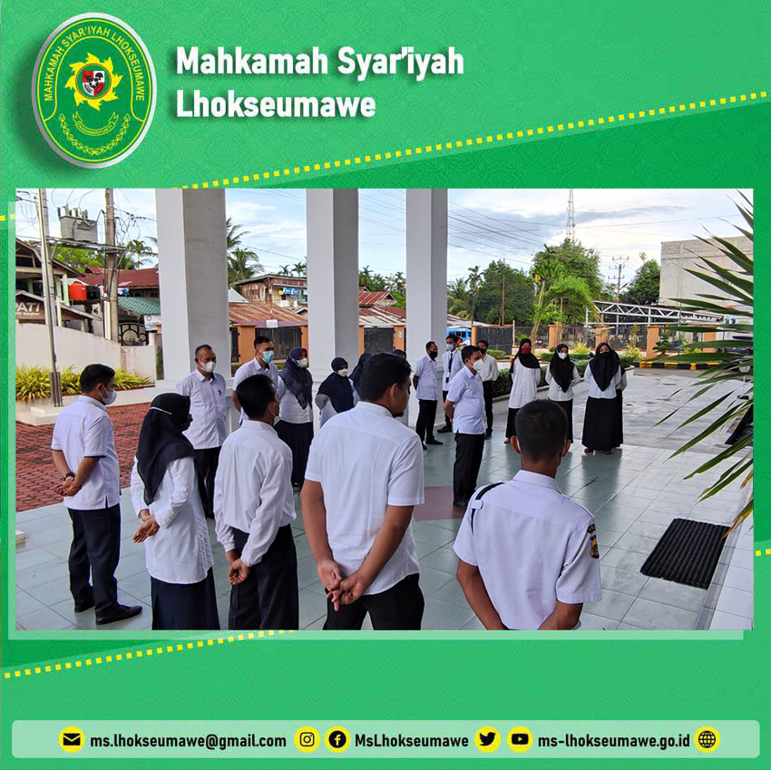 ms-lhokseumawe.go.id | Senin, 25 Oktober 2021 – Bertempat di Halaman Utama Mahkamah Syar’iyah (MS) Lhokseumawe, kegiatan rutin apel pagi tepat dilaksanakan pukul 08.00 WIB. Bertindak sebagai pembina apel adalah Hakim Drs. H. Ahmad Luthfi dan bertindak pemipin apel adalah Arief Raihandi Azka, S.H.. Dalam amanatnya, pembina apel mengajak seluruh aparatur MS Lhokseumawe untuk memulai hari senin ini dengan bismillah dan semangat, tidak luput juga terkait dengan kedisiplinan kerja yang diingatkan kembali, agar dilaksanakan dengan lebih baik lagi.