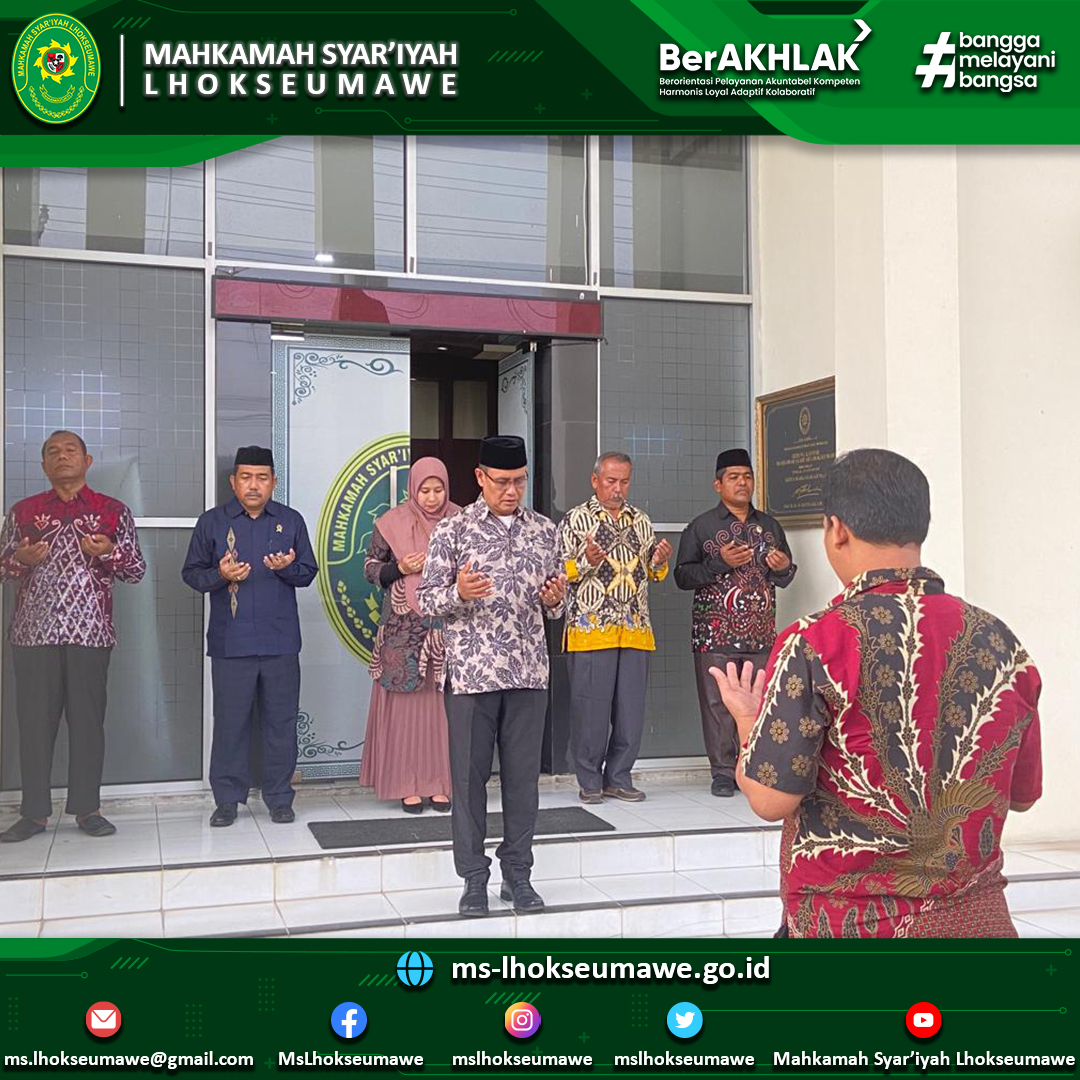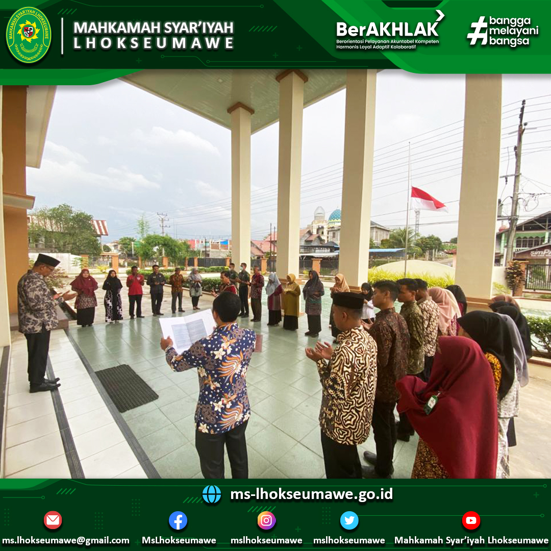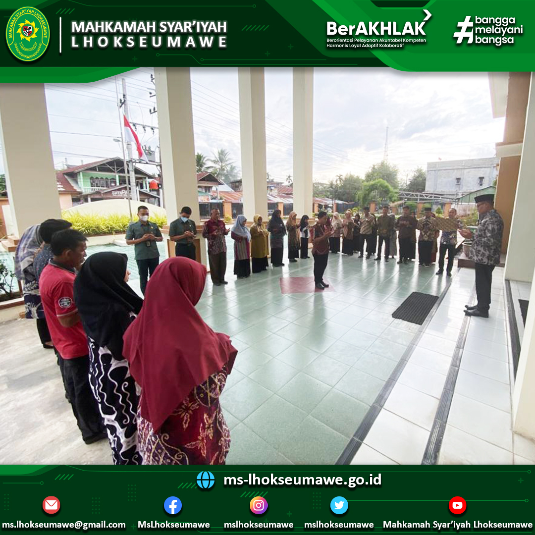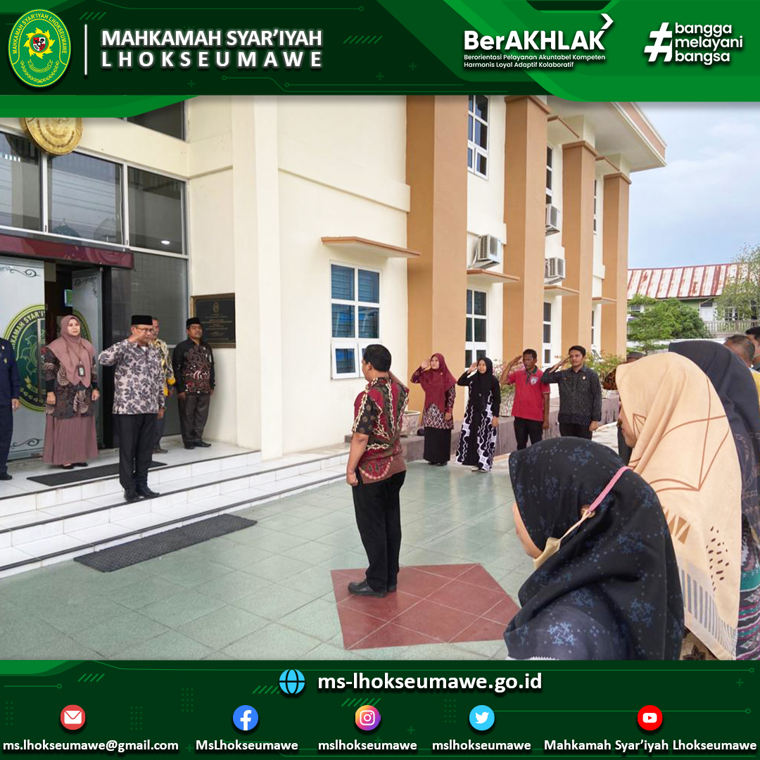 - Pembina Apel mengingatkan agar seluruh aparatur Mahkamah Syar’iyah Lhokseumawe untuk selalu menjaga harkat dan martabat Mahkamah Agung dimanapun berada, baik didalam kantor maupun didalam kantor.