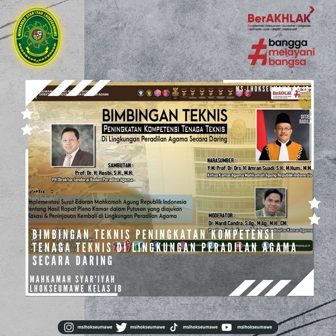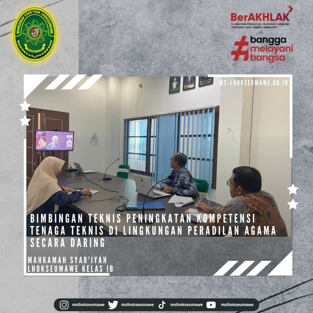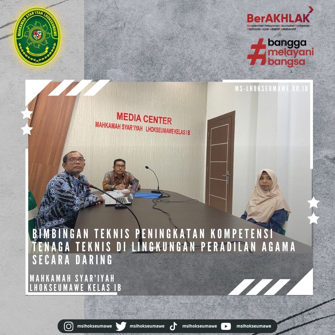 Wakil Ketua Mahkamah Syar’iyah Lhokseumawe Amrin Salim, S.Ag., M.A. mengikuti Bimbingan Teknis Peningkatan Kompetensi Tenaga Teknis di Lingkungan Peradilan Agama secara Daring pada hari Kamis, 30 Maret 2023 bertempat di Ruang Media Center MS Lhokseumawe.