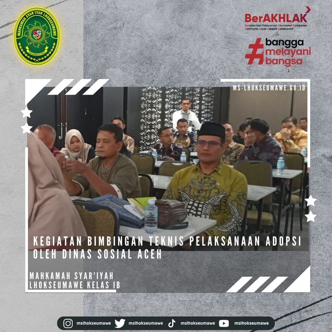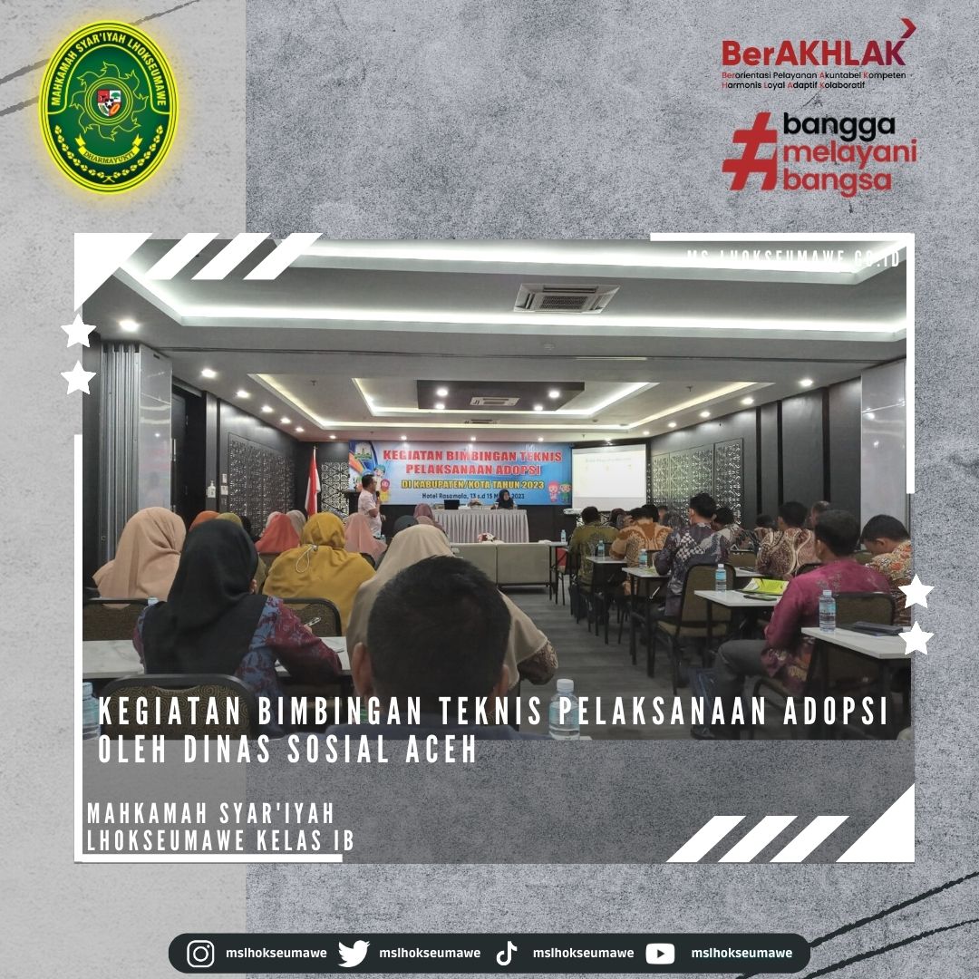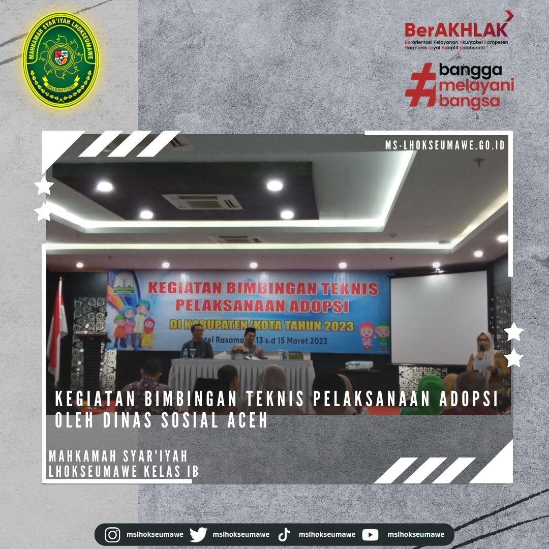 Ketua Mahkamah Syar’iyah Lhokseumawe Bapak Yedi Suparman, S.H.I, M.H. hadiri undangan Kegiatan Bimbingan Teknis Pelaksanaan Adopsi. Sesuai dengan jadwal, Bimbingan Teknis yang dilaksanakan di Banda Aceh akan dilaksanakan mulai tanggal 13 Maret s.d. 15 Maret 2023.