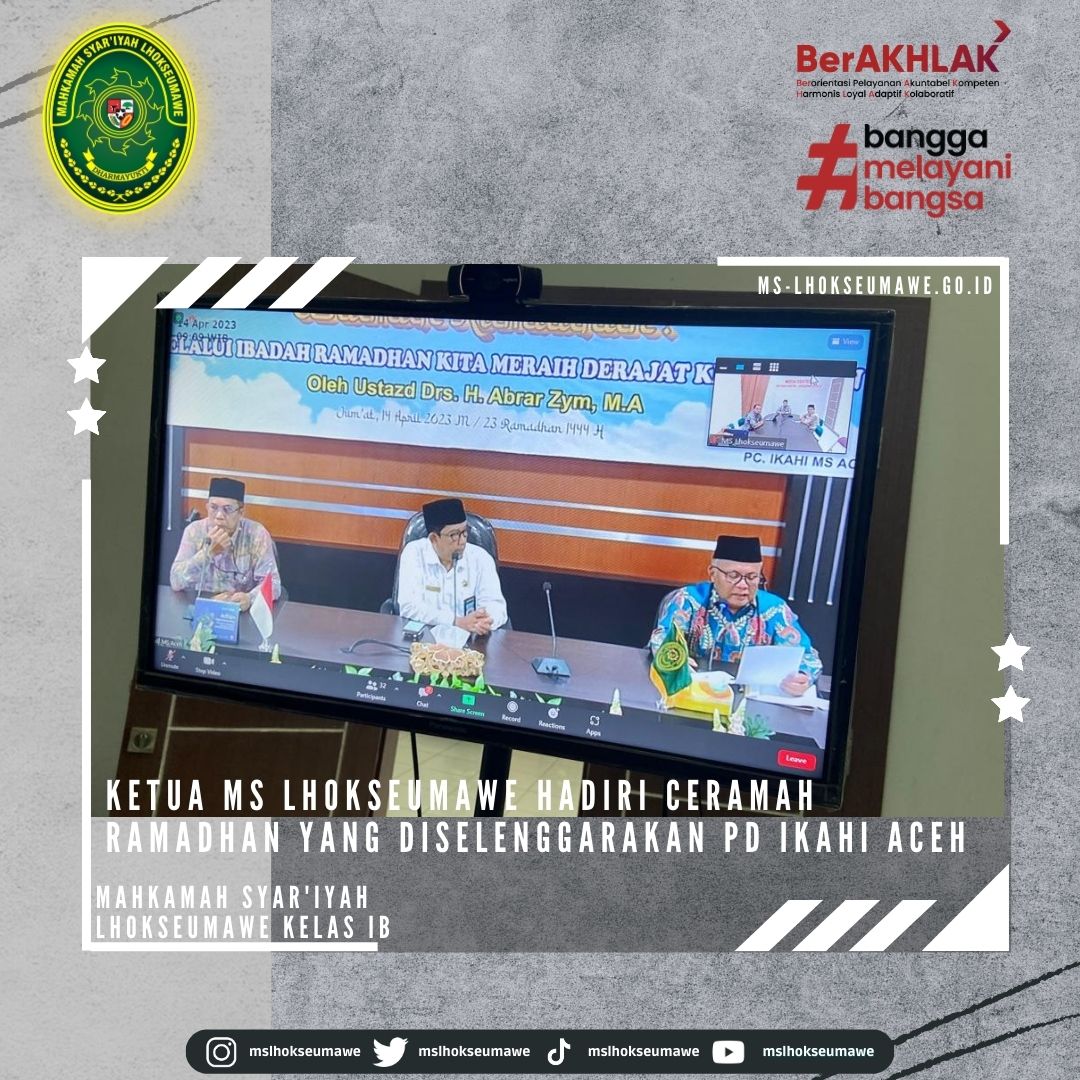 Mahkamah Syar’iyah Lhokseumawe hadiri undangan PD IKAHI Aceh dalam rangka kegiatan Ceramah Ramadhan yang berlangsung secara daring. Ceramah Ramadhan yang diikuti, berlangsung di Media Center MS LHokseumawe yang turut dihadiri oleh seluruh Pengurus dan Anggota IKAHI Daerah dan Cabang Seluruh Provinsi Aceh. Ceramah Ramadhan kali ini yang menjadi penceramah adalah Kepala Kantor Kementerian Agama Kota Banda Aceh Ustadz Drs. H. Abrar Zym, M.A.