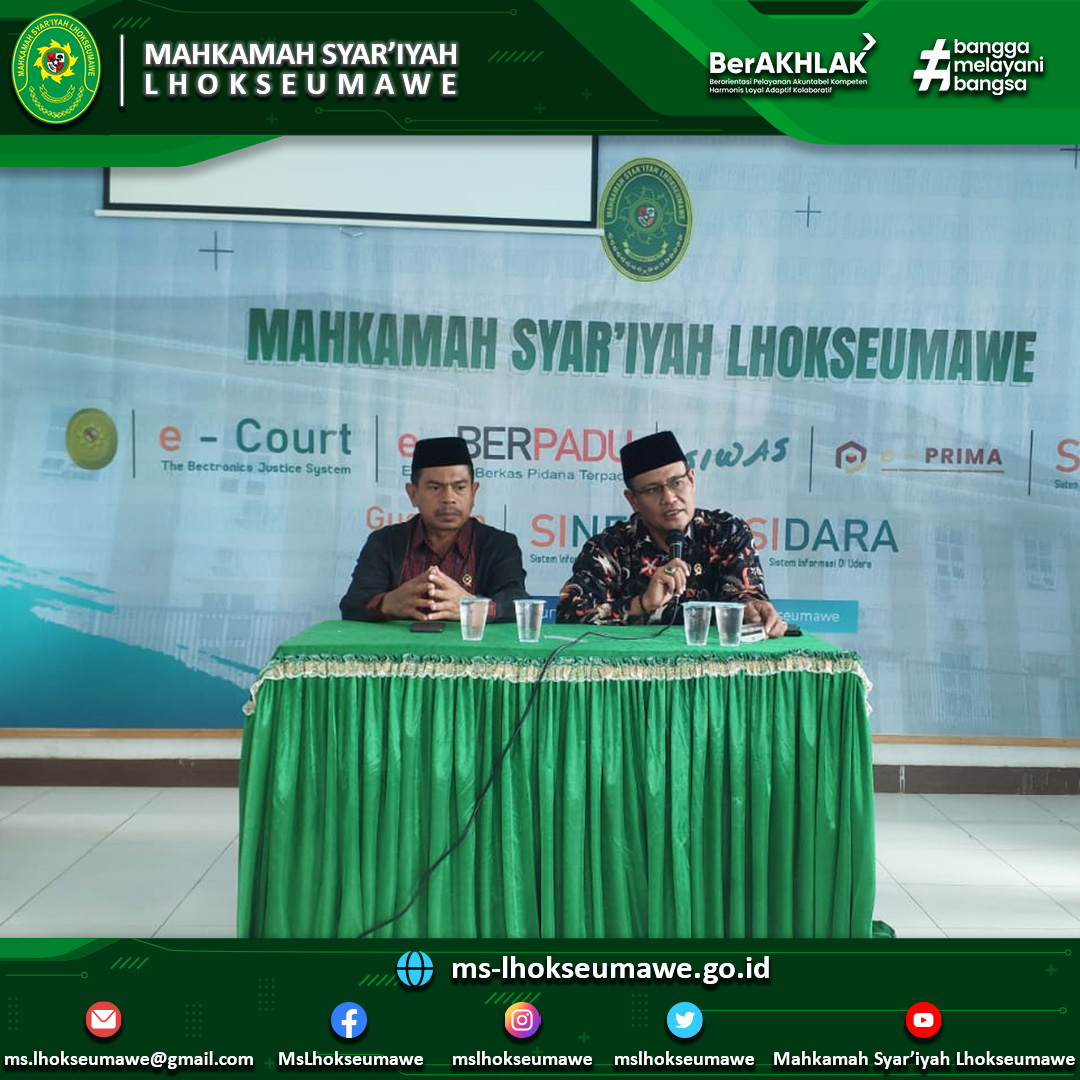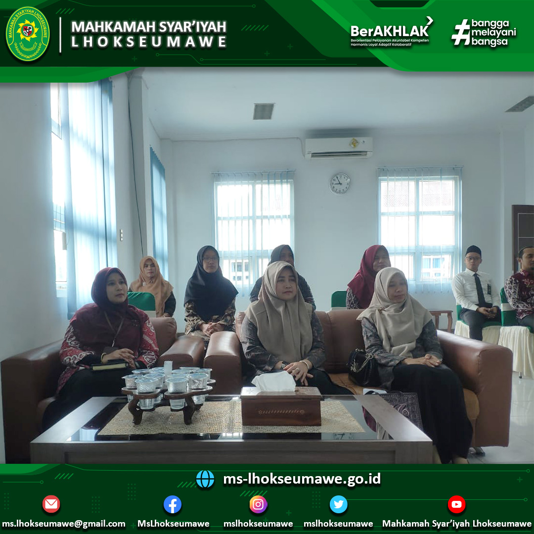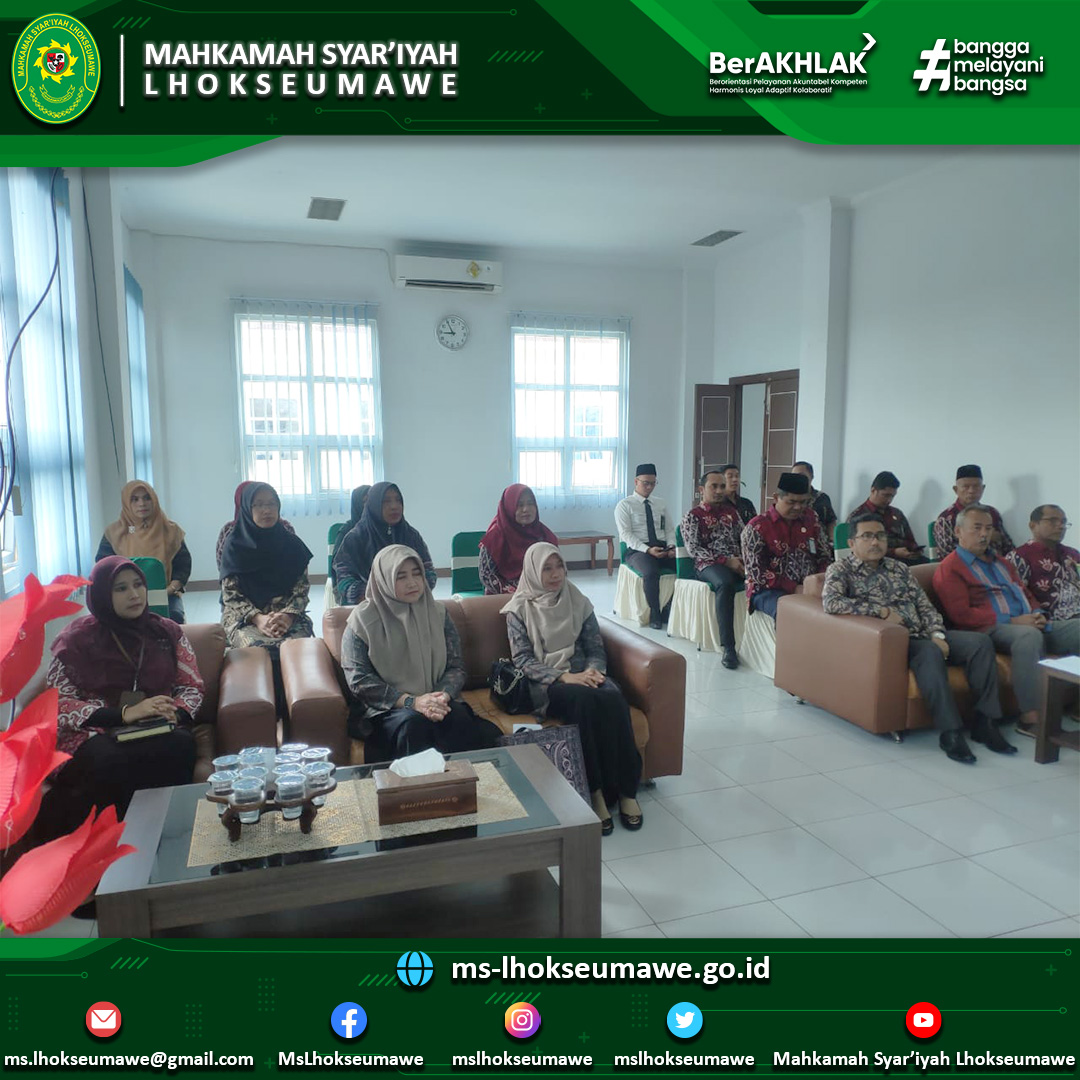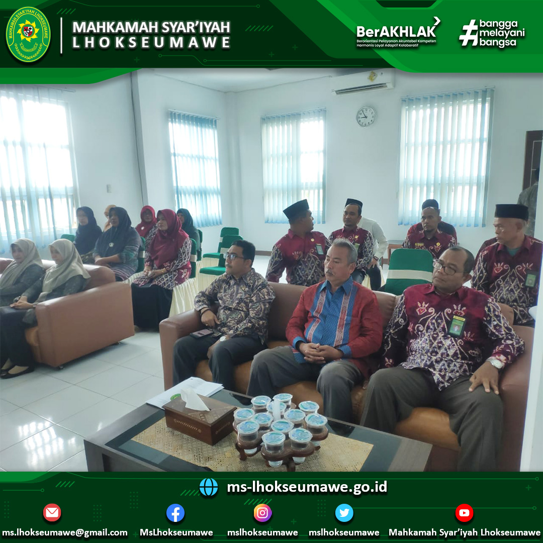 ms-lhokseuamwe.go.id | Mahkmah Syar’iyah Aceh melakukan monitoring dan evaluasi (Monev) ke Mahkamah Syar’iyah Lhokseumawe. Monitoring dan evaluasi oleh MS Aceh bertujuan untuk memonitor dan mengevaluasi secara langsung hasil tindak lanjut yang dilakukan oleh MS Lhokseumawe setelah Pembinaan dan Pengawasan Daerah Wilayah Mahkamah Syar’iyah Aceh. Tim MS Aceh yang datang disambut dengan hangat oleh keluarga besar MS LHokseumawe yang terdiri dari Hakim Tinggi MS Aceh yaitu Dr. H. Munir, S.H. M.Ag sebagai Ketua Tim, dan anggota-anggotanya yang terdiri dari Panitera Pengganti MS Aceh yaitu Ibu Hj. Murzakiah, S.H., M.H. dan Analis Perkara Peradilan Ibu Yani Susana, S.H.