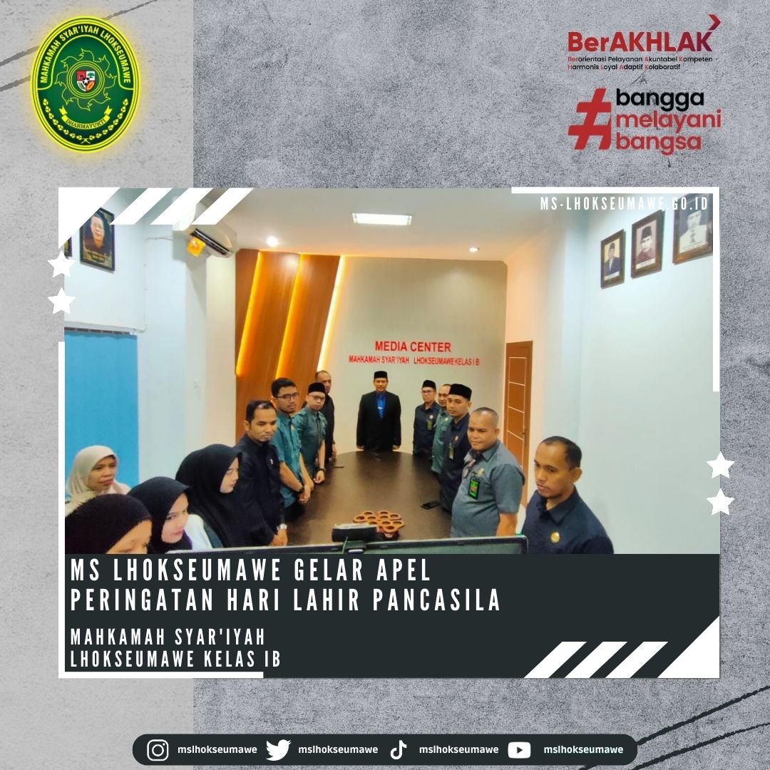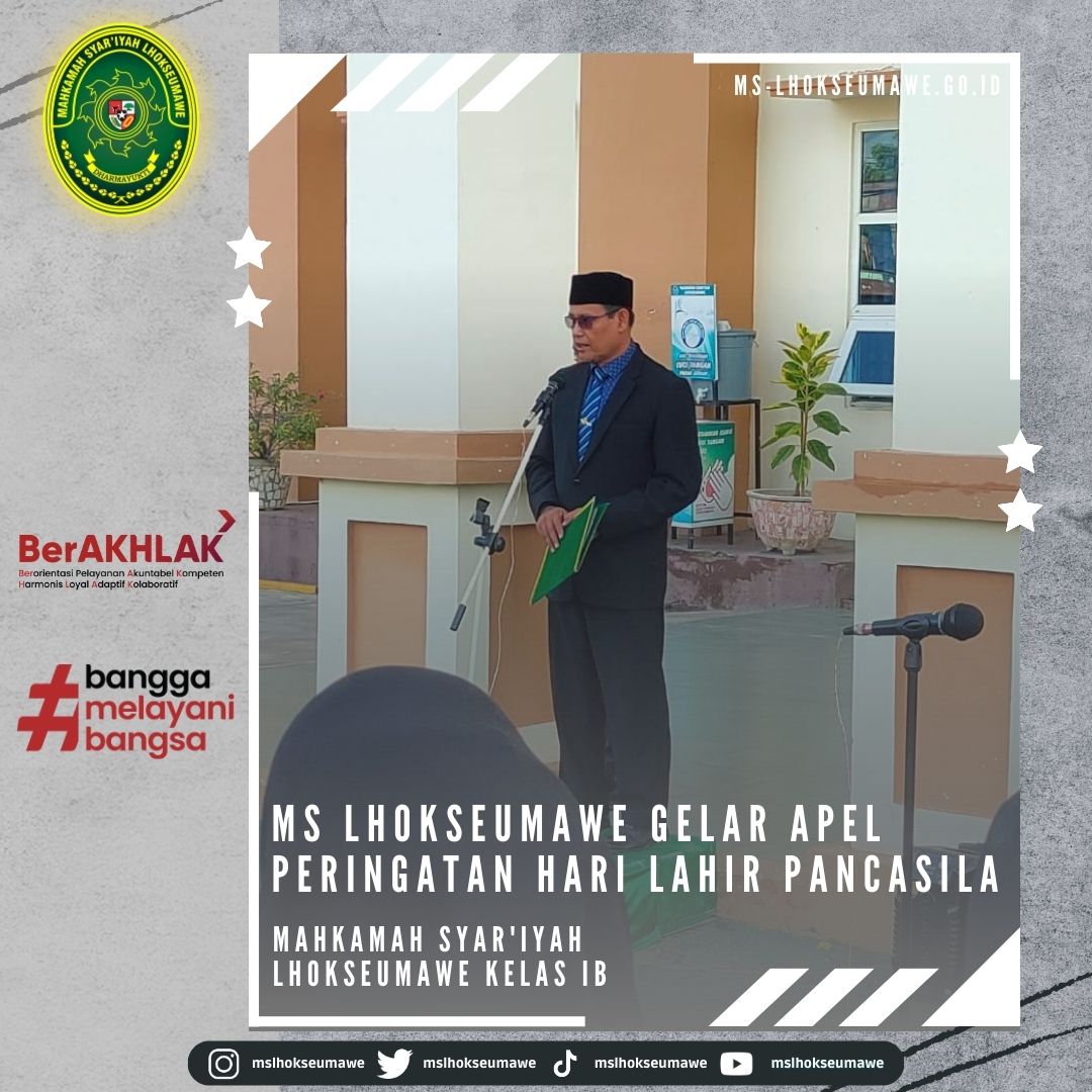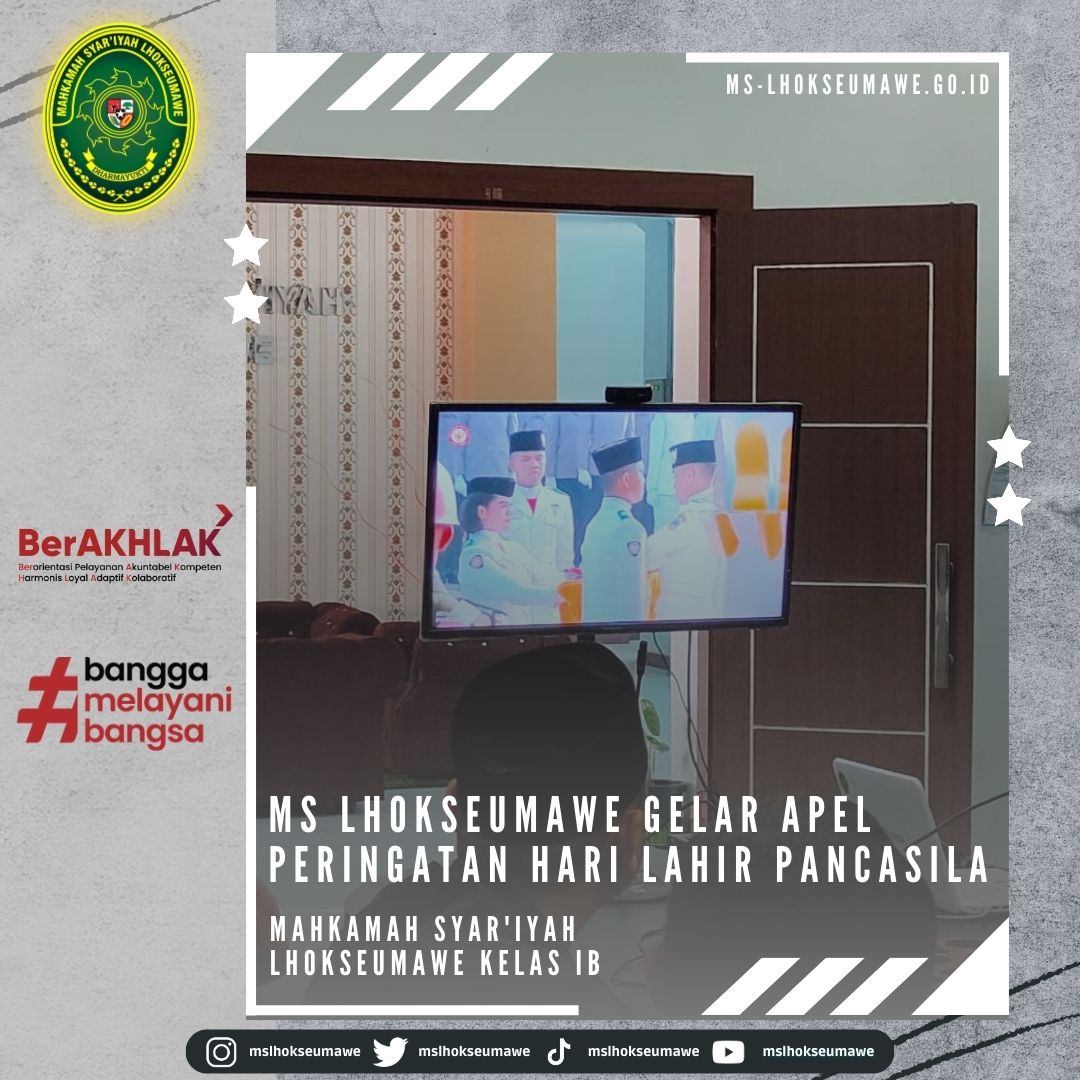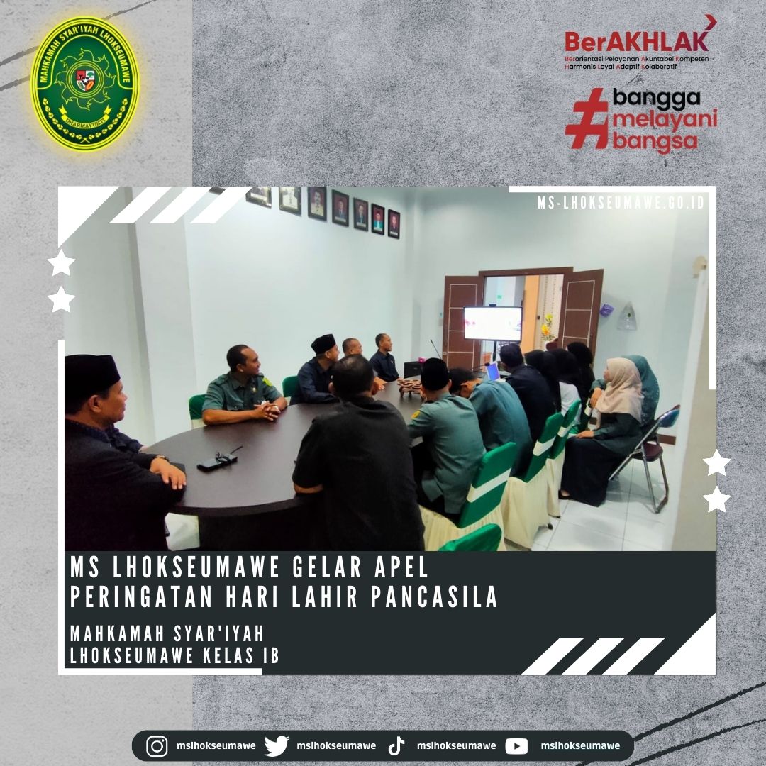 ms-lhokseumawe.go.id | Kamis, 01 Juni 2023, Mahkamah Syar’iyah Lhokseumawe menggelar apel dalam rangka memperingati Hari Lahir Pancasila. Bertindak sebagai Inspektur Upacara Ketua MS Lhokseumawe Bapak Yedi Suparman, S.H.I, M.H., komandan Apel Bapak Razali (PPNPN), dan peserta apel Para Pegawai MS Lhokseumawe beserta Mahasiswa/i OJT. Setelah pelaksanaan apel dikantor MS Lhokseumawe, kegiatan dilanjutkan di Ruang Media Center MS Lhokseumawe dengan mengikuti secara daring siaran langsung Upacara Peringatan Hari Lahir Pancasila terpusat di Lapangan Monumen Nasional.