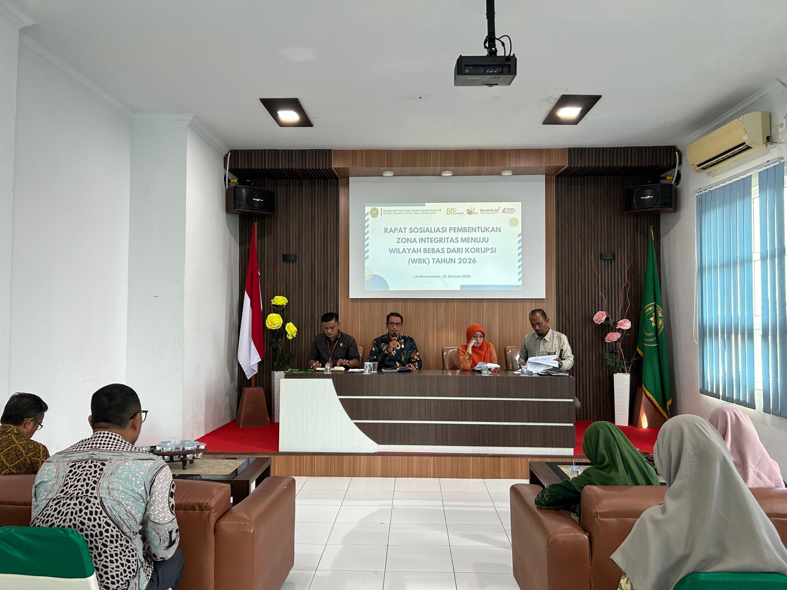 LHOKSEUMAWE – Mahkamah Syar’iyah Lhokseumawe menegaskan langkah strategis dalam mewujudkan tata kelola birokrasi yang bersih dan melayani melalui pelaksanaan Rapat Sosialisasi Pembentukan Zona Integritas (ZI) menuju Wilayah Bebas dari Korupsi (WBK) tahun 2026. Agenda krusial yang berlangsung di Aula Mahkamah Syar’iyah Lhokseumawe ini dipimpin langsung oleh Ketua Mahkamah Syar’iyah Lhokseumawe, Bapak Yedi Suparman, S.H.I., M.H., sebagai bentuk nyata penguatan komitmen pimpinan terhadap akselerasi reformasi birokrasi di lingkungan Mahkamah Syar’iyah Lhokseumawe pada hari Kamis (22/01).
