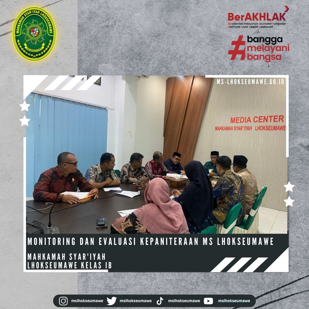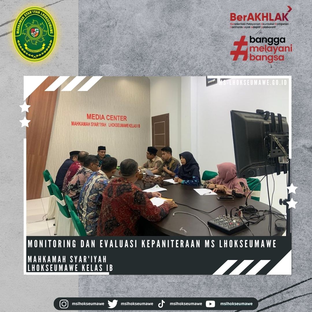 ms-lhokseumawe.go.id | Kamis, 11 Mei 2023 – Dipimpin langsung oleh Ketua MS Lhokseumawe Bapak Yedi Suparman, S.H.I, M.H. dan didampingi oleh Wakil ketua Bapak Amrin Salim, S.Ag., M.A., MS Lhokseumawe selenggarakan monev terkait dengan teknis persidangan dan pelayanan. Dihadiri oleh Bapak Ibu Hakim, Bapak Panitera dan Tim Kepaniteraan kegiatan dimulai pukul 08.15 WIB di ruang media center lantai II Mahkamah Syar’iyah Lhokseumawe.