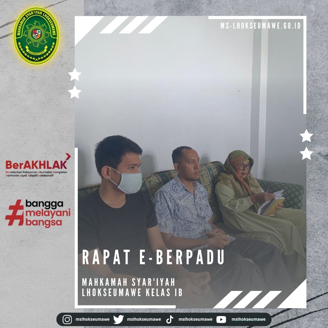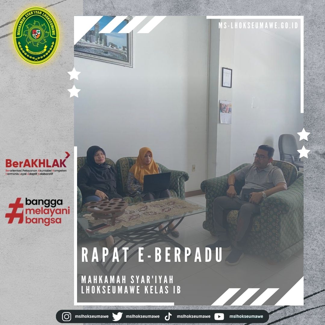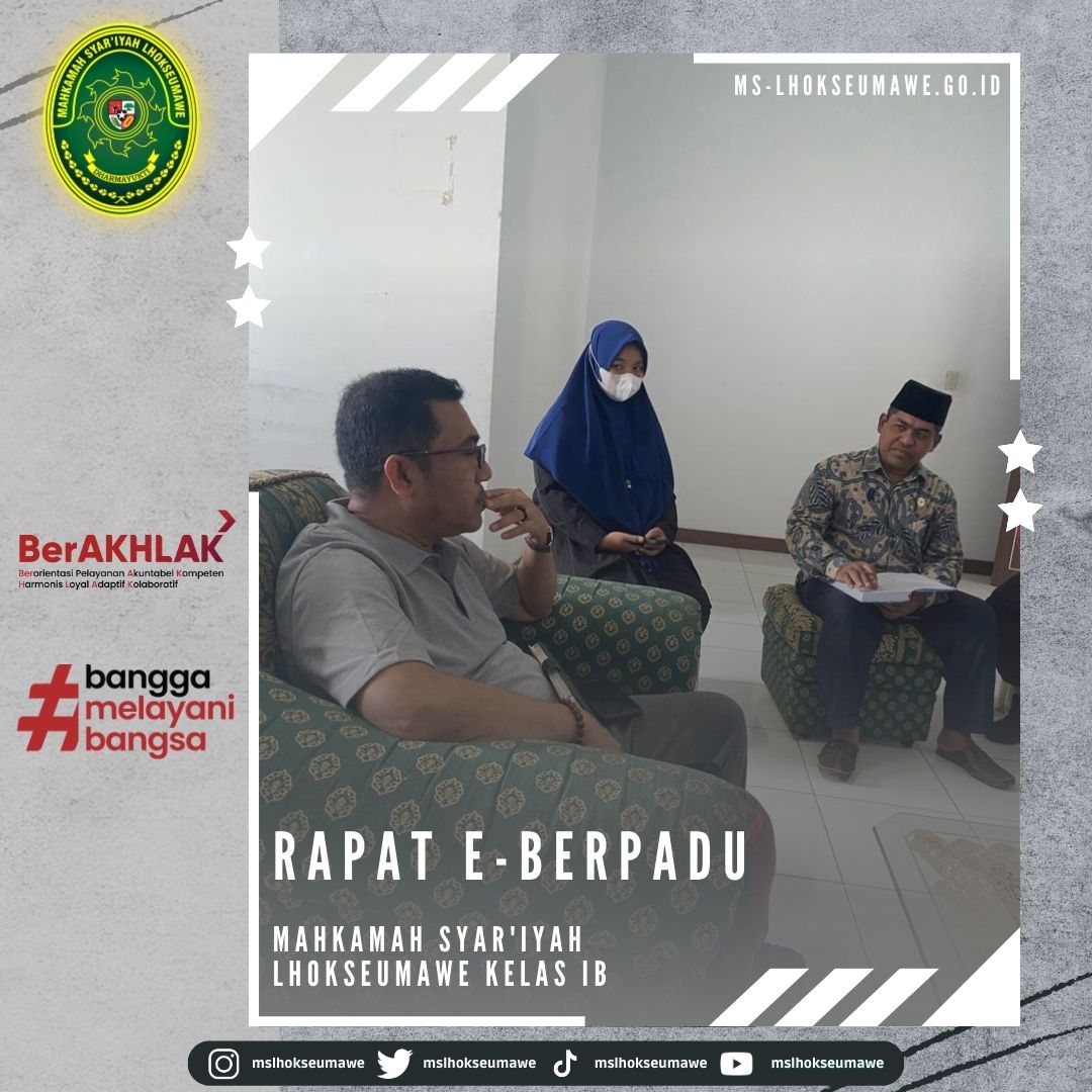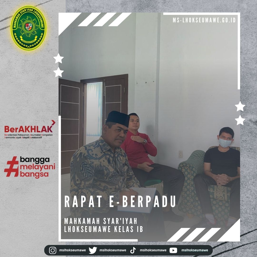 MS Lhokseumawe adakan Rapat E-Berpadu Fri, 13 January 2023 MS Lhokseumawe adakan Rapat E-Berpadu Lhokseumawe, 13 Januari 2023 #mslhokseumawe #msaceh #ditjenbadilag #humasmahkamahagung Previous Post Rapat Monev Keterbukaan Informasi Mahkamah Syar’iyah Lhokseumawe Next Post Peresmian Taman-Tamah di Lingkungan Kantor Mahkamah Syar’iyah Lhokseumawe