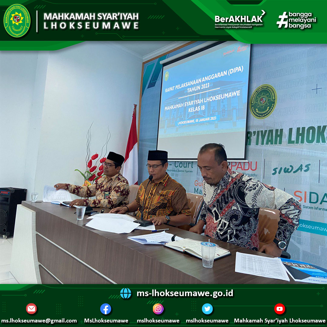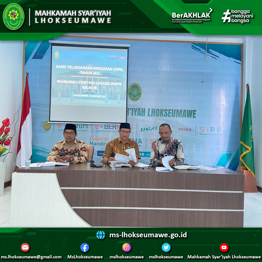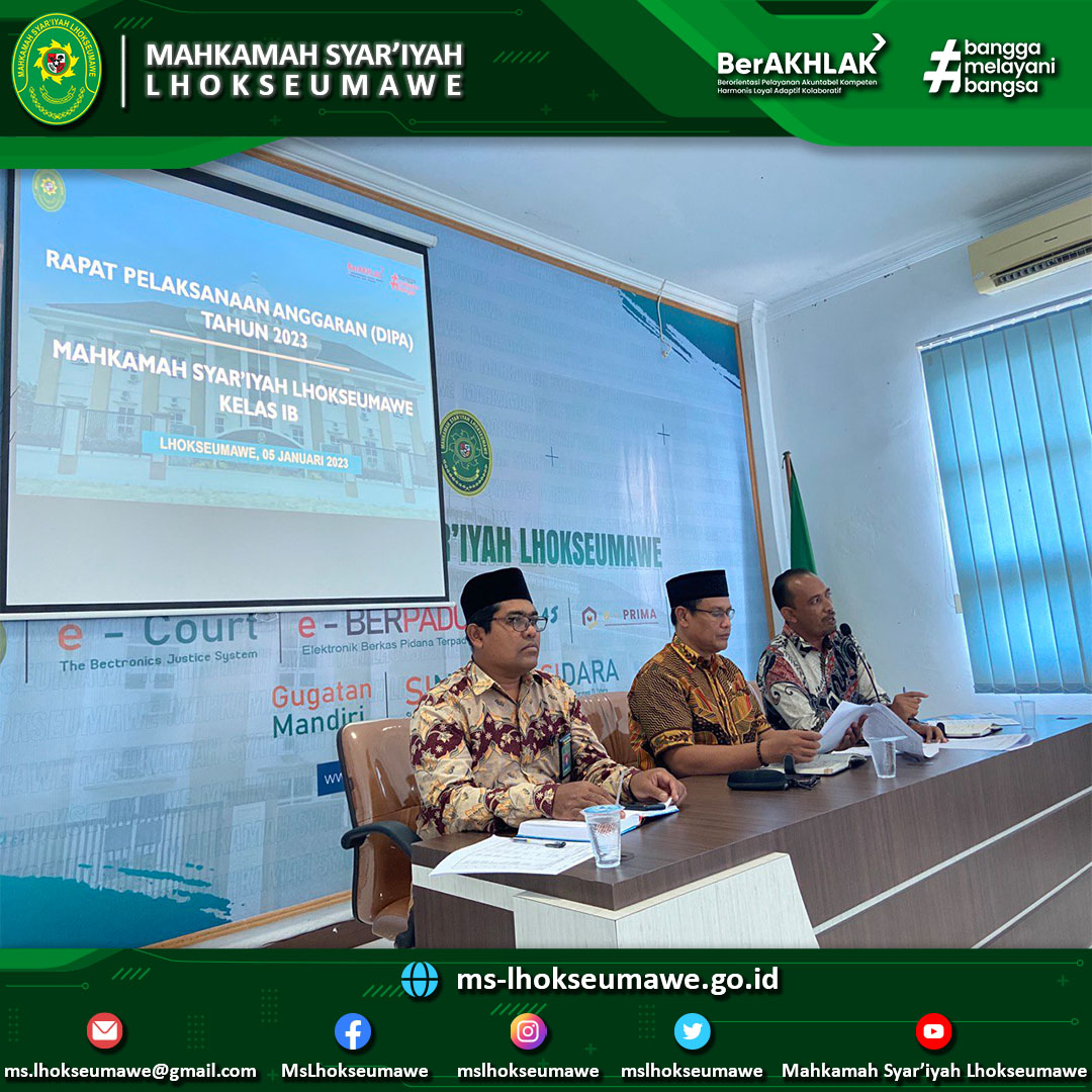 MS Lhokseumawe adakan Rapat Pelaksanaan Anggaran (DIPA) Tahun 2023 Fri, 6 January 2023 MS Lhokseumawe adakan Rapat Pelaksanaan Anggaran (DIPA) Tahun 2023 #mslhokseumawe #msaceh #ditjenbadilag #humasmahkamahagung Previous Post MS Lhokseumawe laksanakan Rapat Penyusunal RKAKL Tahun 2024 Next Post Sosialisasi E-Kinerja di Lingkungan Satuan Kerja Mahkamah Syar’iyah Lhokseumawe