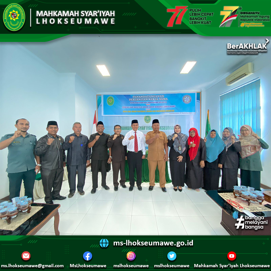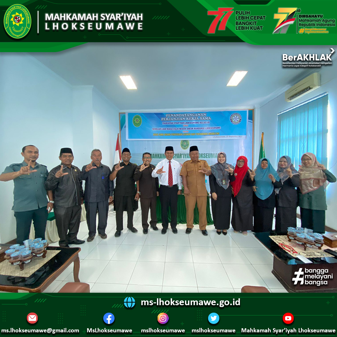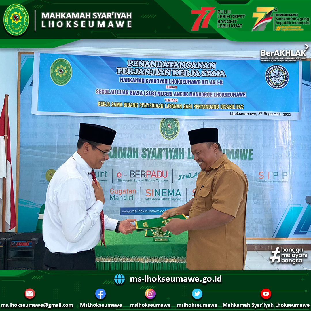 ms-lhokseumawe.go.id | Selasa, 27 September 2022 – Sesuai Surat Keputusan Direktur Jenderal Badan Peradilan Agama Nomor 206/DJA/SK/I/2021 tentang standar pelayanan bagi penyandang disabilitas di lingkungan peradilan. Bahwa perlu untuk menetapkan standar pelayanan yang dapat dijangkau secara nyaman oleh semua lapisan masyarakat terutama para penyandang disabilitas dalam rangka mewujudkan pengadilan yang inklusif. Dari pernyataan tersebut disimpulkan bahwa peningkatan kualitas terhadap kualitas pelayanan publik dalam rangka pemenuhan kebutuhan pelayanan dan membangun kepercayaan masyarakat terhadap badan peradilan perlu dilakukan. Dengan menjamin kesamaan hak-hak setiap warna negara termasuk bagi penyandang disabilitas, untuk memperoleh akses terhadap keadilan dan terbebas dari perlakuan diskriminatif. Salah satu langkah nyata yang diambil adalah dengan diadakannya Penandatanganan Perjanjian Kerjasama dengan SLB Negeri Aneuk Naggroe Lhokseumawe.