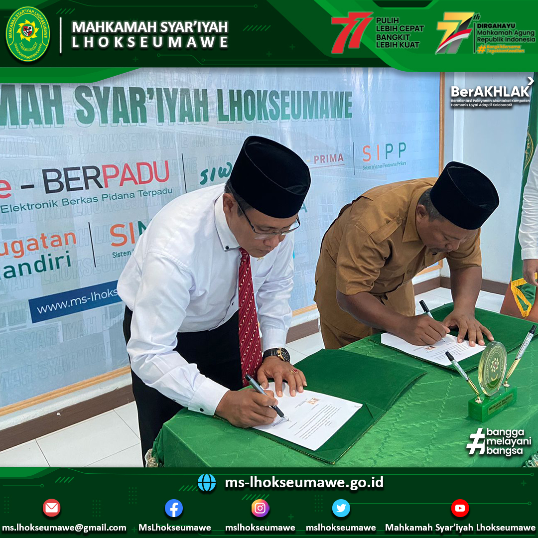 Ketua Mahkamah Syar’iyah Lhokseumawe Bapak Yedi Suparman, S.H.I, M.H. dalam sambutannya juga mengatakan “mari sama-sama kita melaksanakan perjanjian kerja sama ini dengan baik, dan bisa melaksanakan beberapa program kerja yang telah dicanangkan sebelumnya yaitu Pelayanan pendampingan atau juru bahasa isyarat, Pelatihan peningkatan sumber daya manusia dalam pemberian layanan kepada penyandang disabilitas dan Menyediakan fasilitas penyandang disabilitas.”