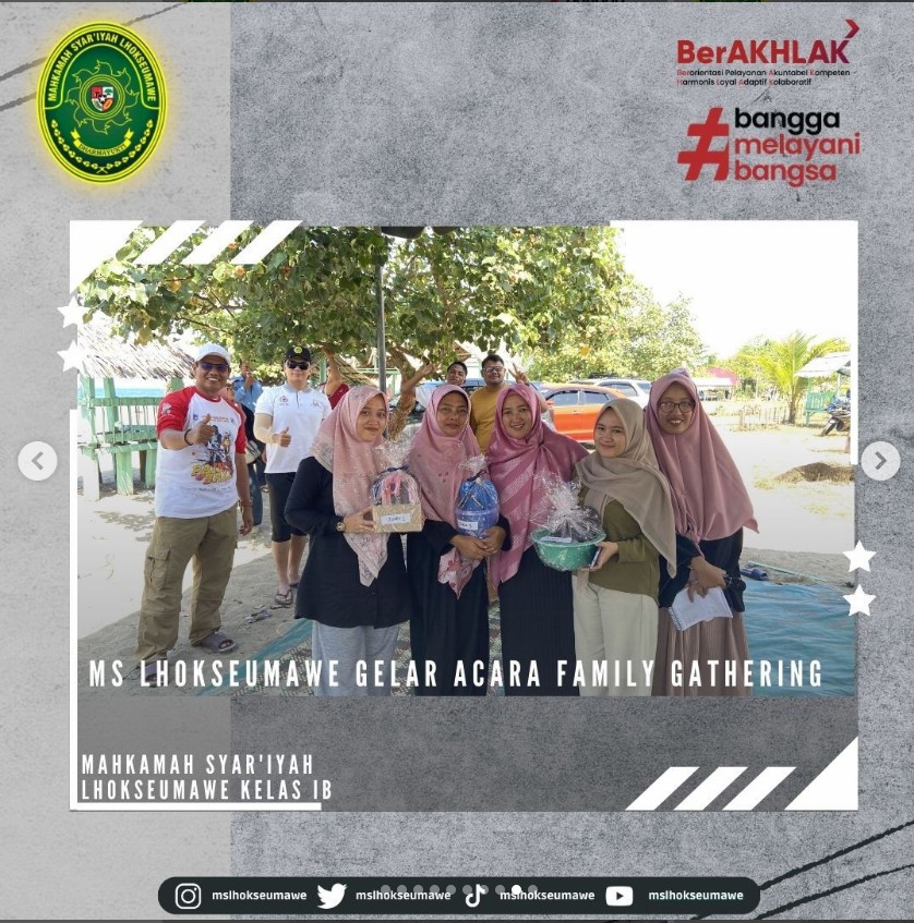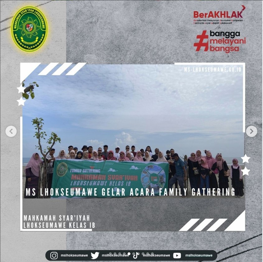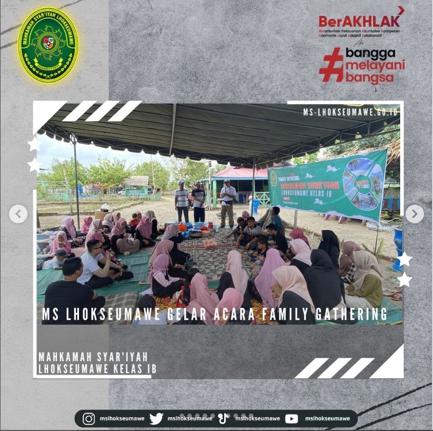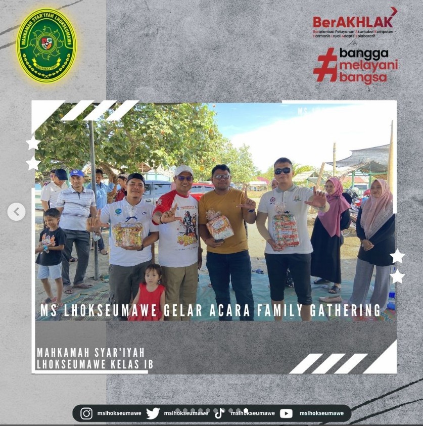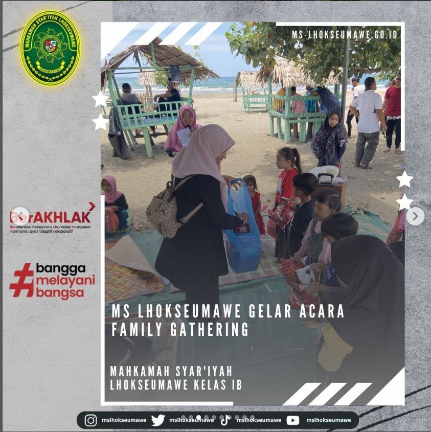 ms-lhokseumawe.go.id | Mahkamah Sya’iyah Lhokseumawe gelar acara Family Gathering yang bertempat di Pantai Bangka Jaya, Aceh Utara. Family Gathering ini diadakan dalam rangka syukuran, silaturahmi, dan kebersamaan dalam sebuah keluarga besar MS Lhokseumawe. Diikuti oleh Seluruh ASN MS Lhokseumawe beserta keluarga dan turut diikuti oleh mahasiswa magang, kegiatan dimulai dengan pembacaan doa dan sholawat, sambutan oleh Ketua MS Lhokseumawe Bapak Yedi Suparman, S.H.I, M.H. pada pukul 10.00 WIB. Kegiatan dilanjutkan dengan perlombaan untuk anak-anak dan para peserta family gathering. Family Gathring diakhiri dengan pembagian hadian perlombaan untuk pemenang dan makan bersama.