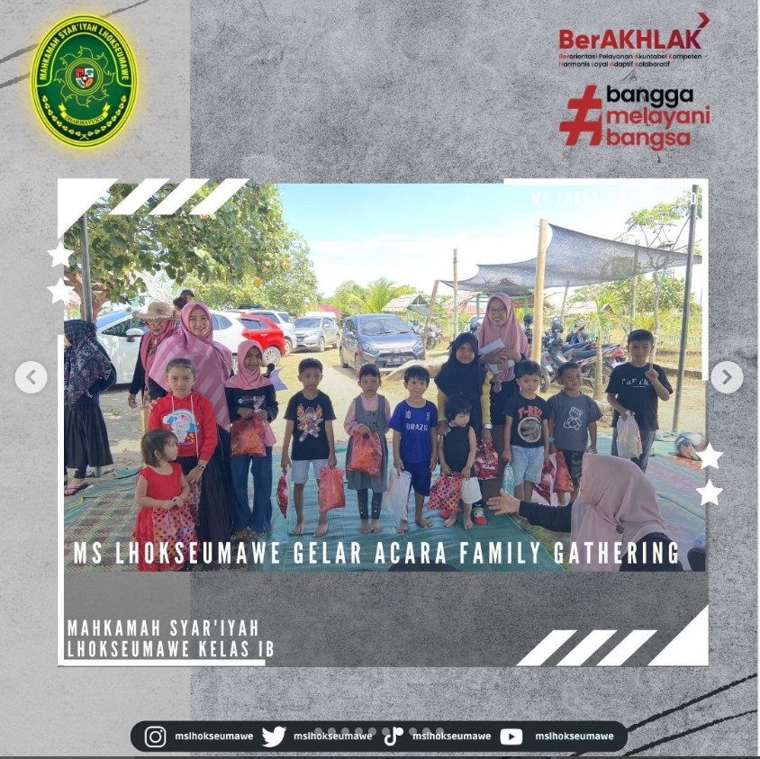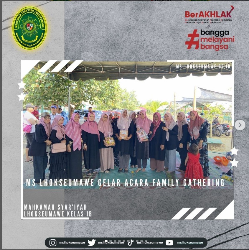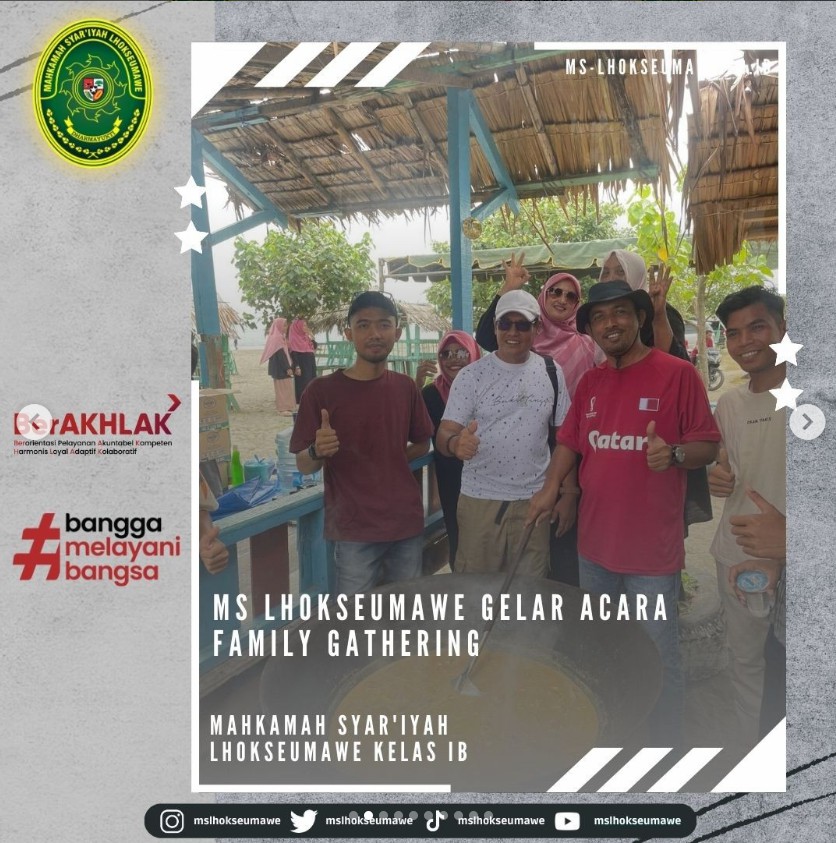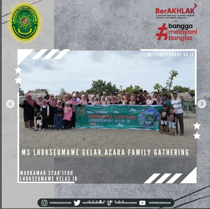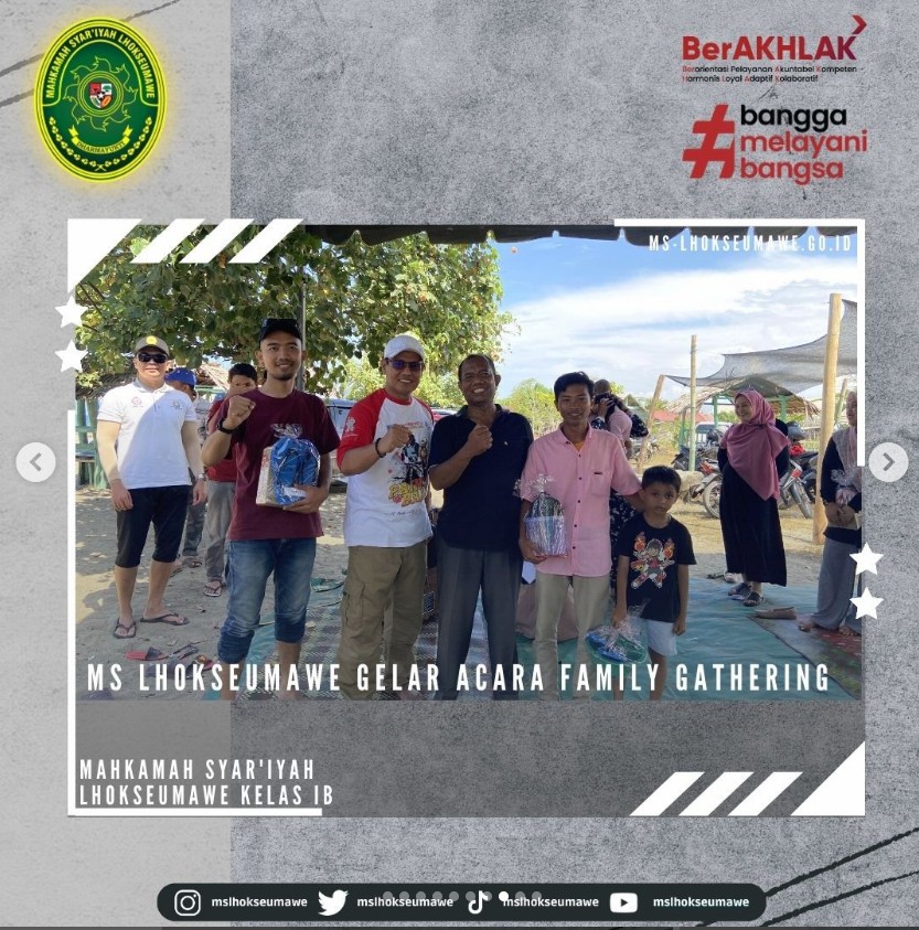 ms-lhokseumawe.go.id | Mahkamah Sya’iyah Lhokseumawe gelar acara Family Gathering yang bertempat di Pantai Bangka Jaya, Aceh Utara. Family Gathering ini diadakan dalam rangka syukuran, silaturahmi, dan kebersamaan dalam sebuah keluarga besar MS Lhokseumawe. Diikuti oleh Seluruh ASN MS Lhokseumawe beserta keluarga dan turut diikuti oleh mahasiswa magang, kegiatan dimulai dengan pembacaan doa dan sholawat, sambutan oleh Ketua MS Lhokseumawe Bapak Yedi Suparman, S.H.I, M.H. pada pukul 10.00 WIB. Kegiatan dilanjutkan dengan perlombaan untuk anak-anak dan para peserta family gathering. Family Gathring diakhiri dengan pembagian hadian perlombaan untuk pemenang dan makan bersama.