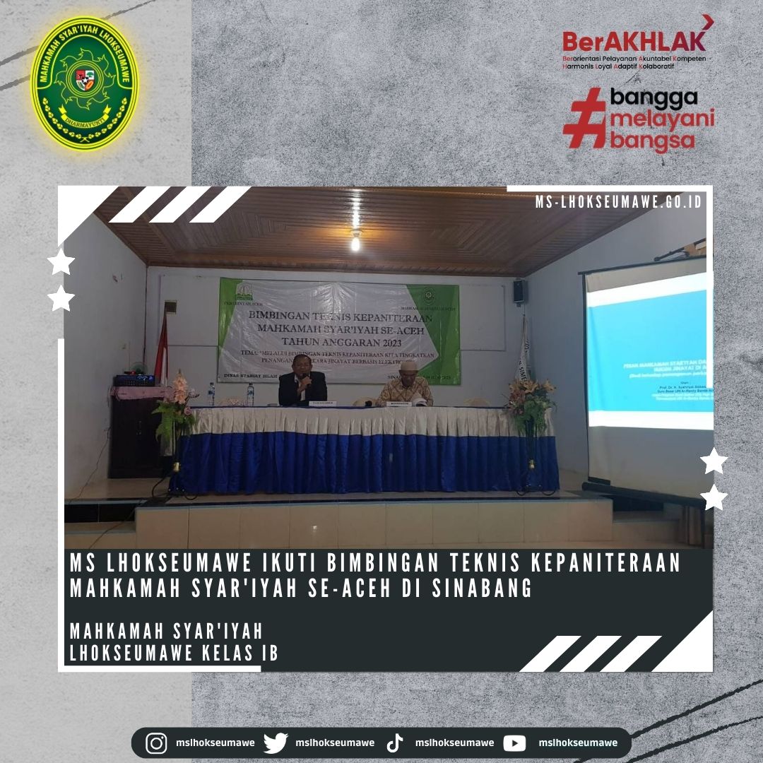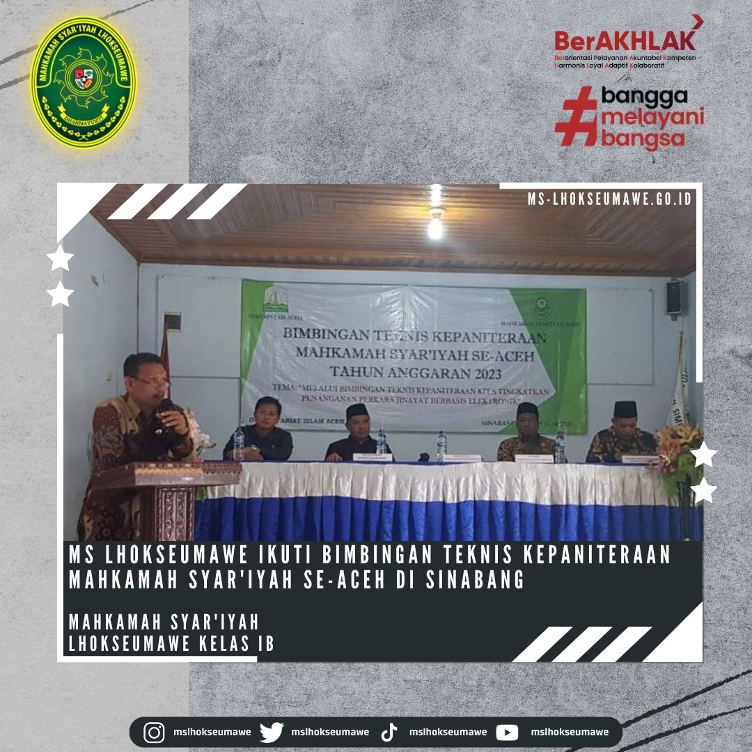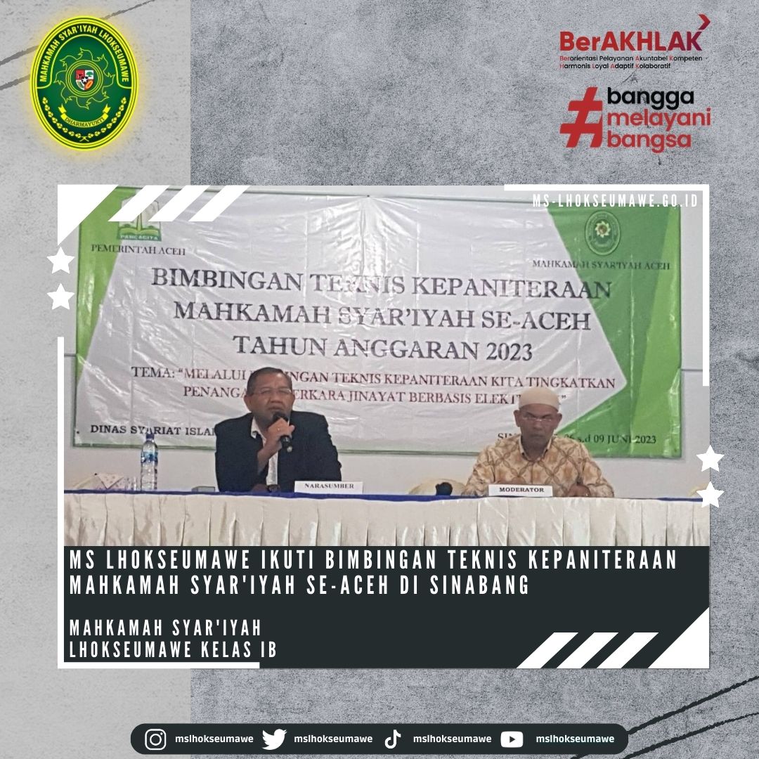 ms-lhokseumawe.go.id | Rabu, 07 Juni 2023 – MS Lhokseumawe ikuti Bimbingan Teknis Kepaniteraan Mahkamah Syar’iyah Se-Aceh di Sinabang. Dihadiri oleh Panitera Bapak Surya Darma, S.Ag, M.H., dan Analis Perkara Peradilan Bapak Dr. Fauzan Prasetya, S.H., M.Kn, kegiatan dimulai dengan registrasi peserta pukul 15.00 WIB dan diskusi “Peran Mahkamah Syar’iyah dalam Penegakan Hukum Syariat di Aceh”. Bimtek tersebut rencananya akan digelar mulai hari Rabu, 07 Juni 2023 sampai dengan Jum’at 09 Juni 2023, ditutup dengan diskusi terkait E-Berpadu dan Permasalahannya serta Pengumuman Hasil Pre Test dan Post Test.