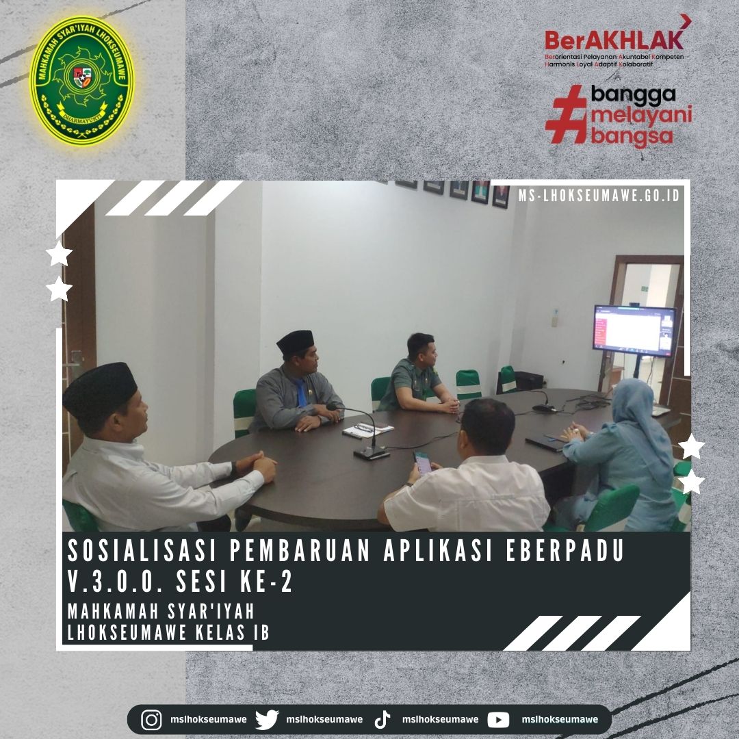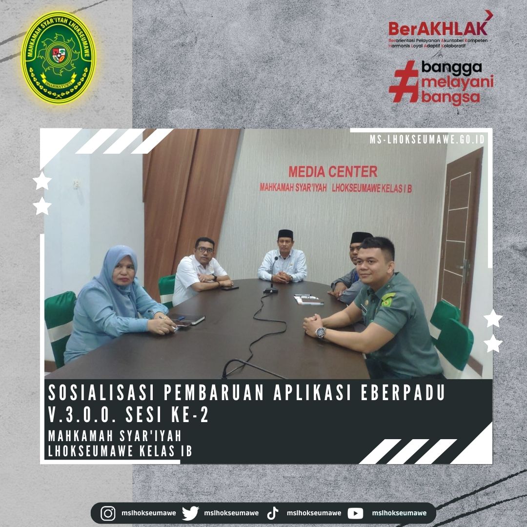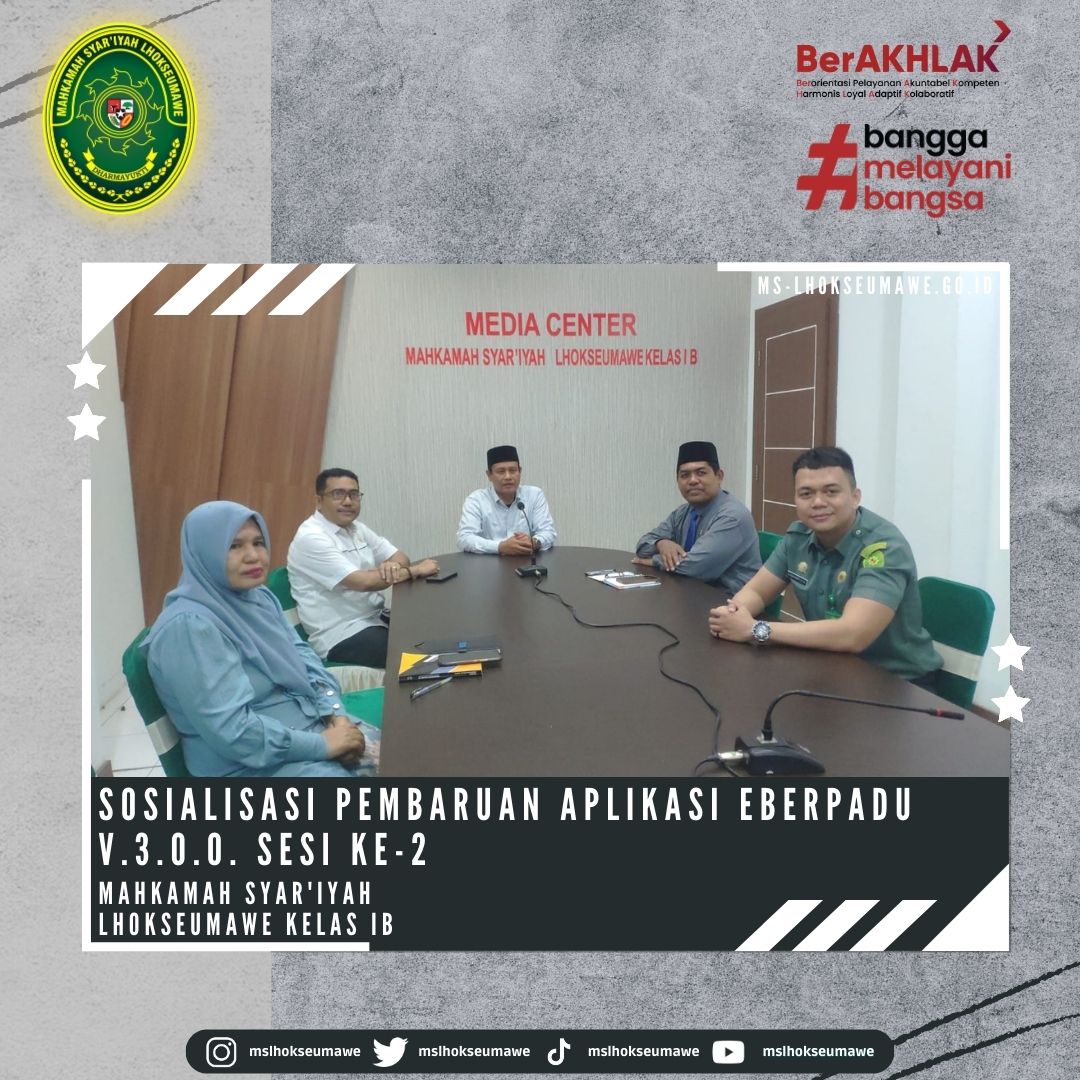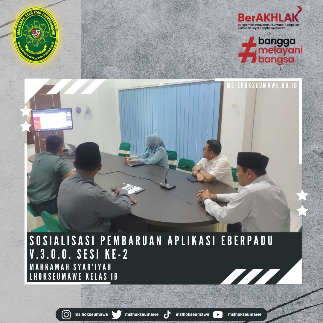 ms-lhokseumawe.go.id | Rabu, 14 Juni 2023 – Mahkamah Syar’iyah Lhokseumawe ikuti Sesi Ke-2 Sosialisasi Pembaruan Aplikasi eBERPADU v. 3.0.0 secara daring. Bertempat di ruang Command Center, Ketua Mahkamah Syar’iyah Lhokseuamwe Bapak Yedi Suparman, S.H.I, M.H., Wakil Ketua Bapak Amrin Salim, S.Ag, M.A. beserta Panitera Bapak Surya Darma, S.Ag., M.A, Panitera Muda, dan Jurusita serta Jurusita Pengganti mengikuti sosialisasi yang diselenggarakan secara daring.