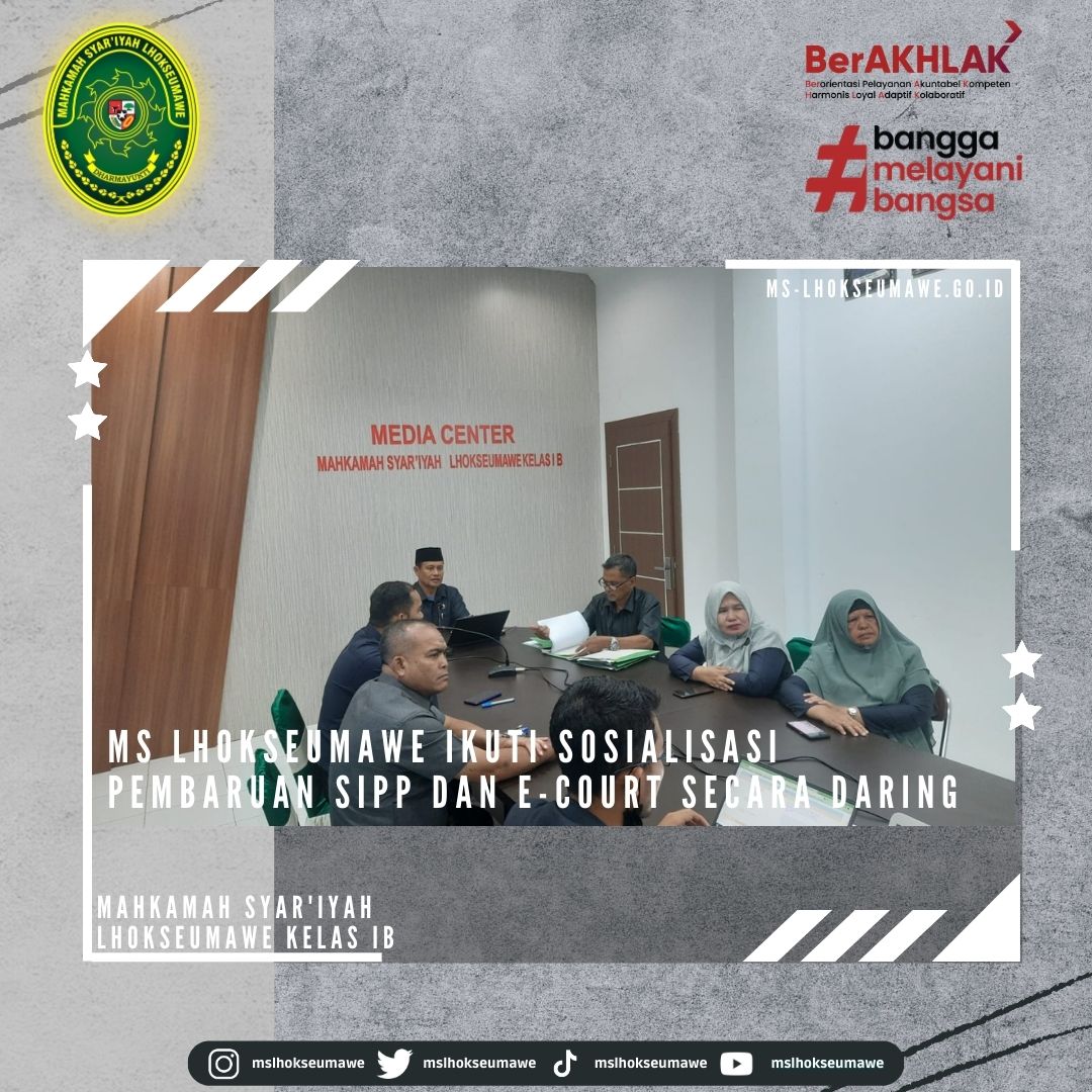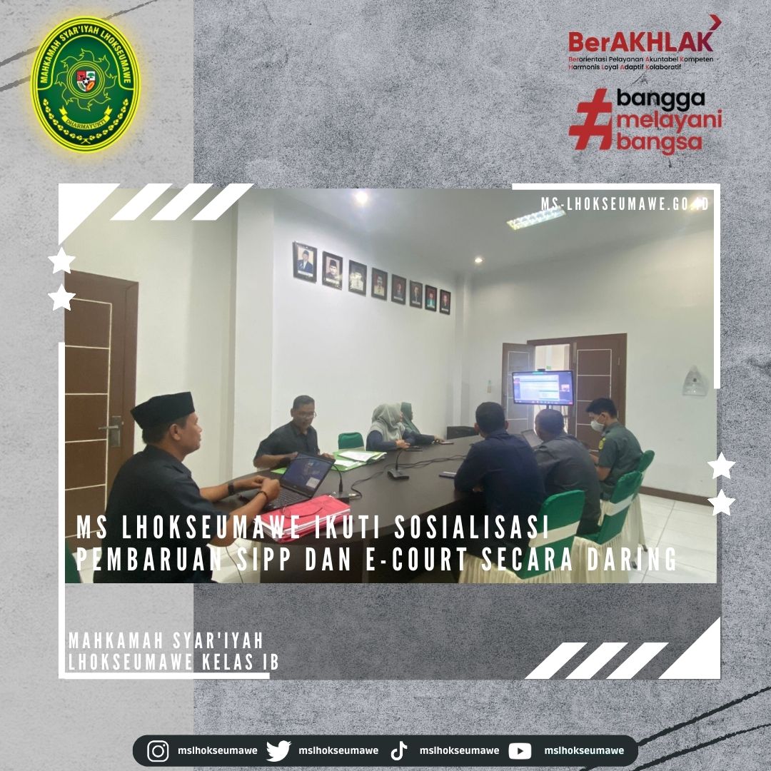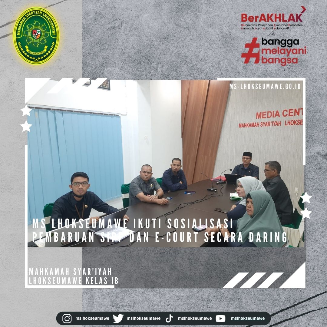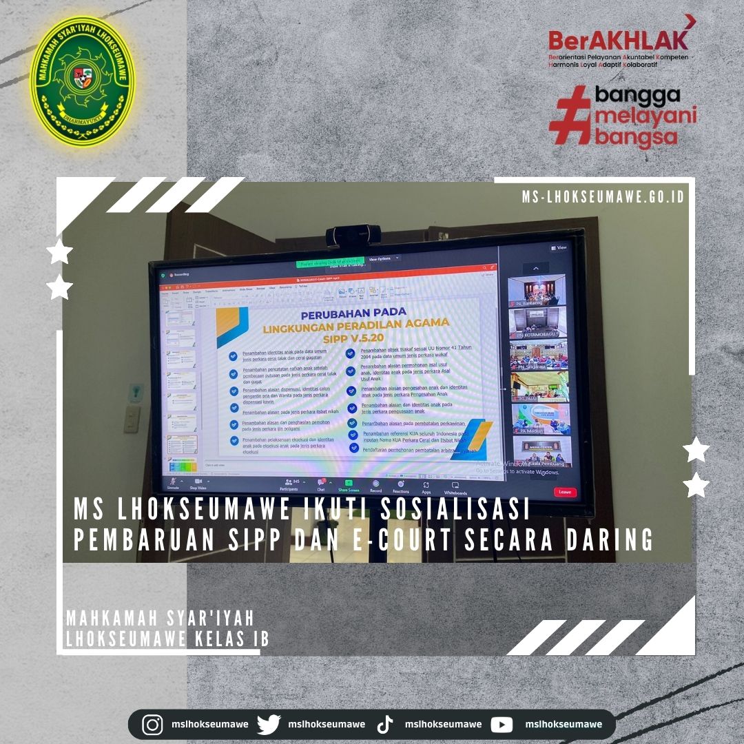 ms-lhokseumawe.go.id | Selasa 04 April 2023 – Menindaklanjuti Surat Sekretaris Mahkamah Agung RI Nomor 670/SEK/HM.02.3/3/2023 tanggal 31 Maret 2023 perihal Pemberitahuan Pembaruan Aplikasi SIPP Tingkat Pertama Versi 5.2.0 dan Aplikasi E-court Versi 5.0.0, Mahkamah Syar’iyah Lhokseumawe turut serta dalam Sosialisasi tentang pembaruan kedua aplikasi tersebut. Kepala Biro Hukum dan Humas MA RI Dr. H. Sobandi, S.H., M.H., membuka kegiatan sosialisasi tersebut yang dilakukan secara daring. Sosialisasi diikuti oleh Ketua MS Lhokseumawe Yedi Suparman, S.H.I, M.H., Panitera Surya Darma, S.Ag., M.H., Para Panitera Muda MS Lhokseumawe, Staff Kepaniteraan dan Pranata Komputer.