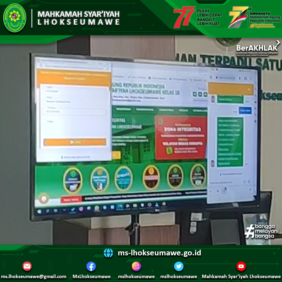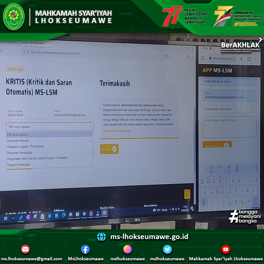 Rabu, 07 September 2022 adalah hari bersejarah untuk Mahkamah Syar’iyah Lhokseumawe dimana Bapak Wakil Ketua Mahkamah Syar’iyah Lhokseumawe me-launching aplikasi berbasis web KRITIS (Kritik Saran Otomatis) dan SI DARA (Sistem Informasi di Udara). Acara launching yang bertempat di Ruang PTSP ini dihadiri juga oleh Bapak Panitera Surya Darma S.Ag, M.H, Bapak Sekretaris Yarvis Luthfi, S.H., Para Panitera Muda, Para Kasubbag dan Para Pegawai.