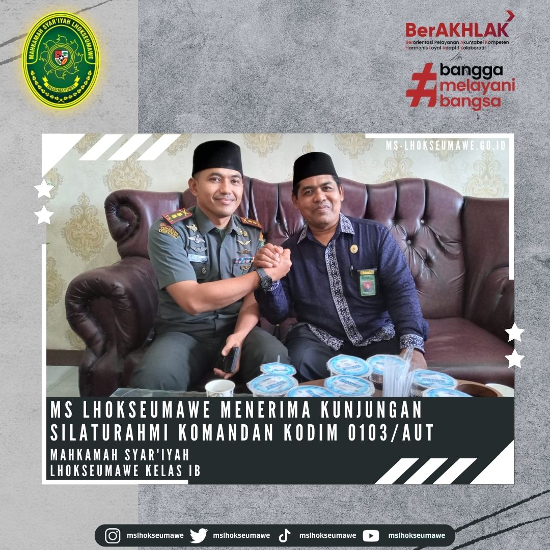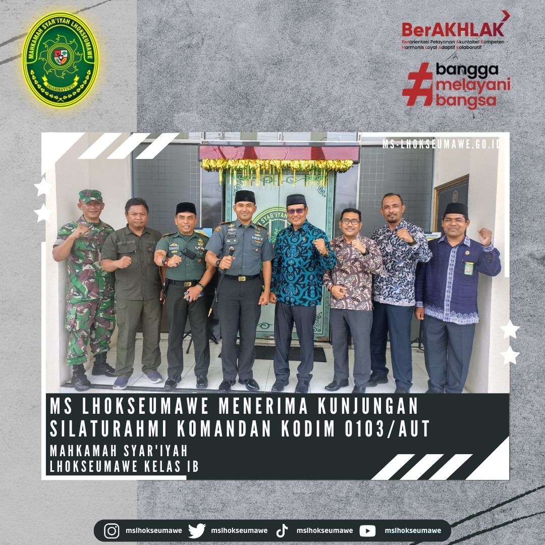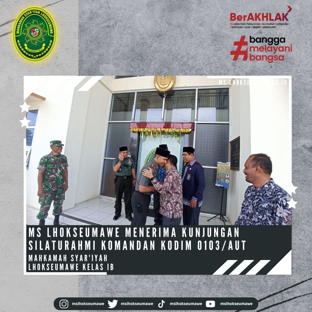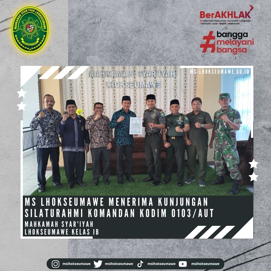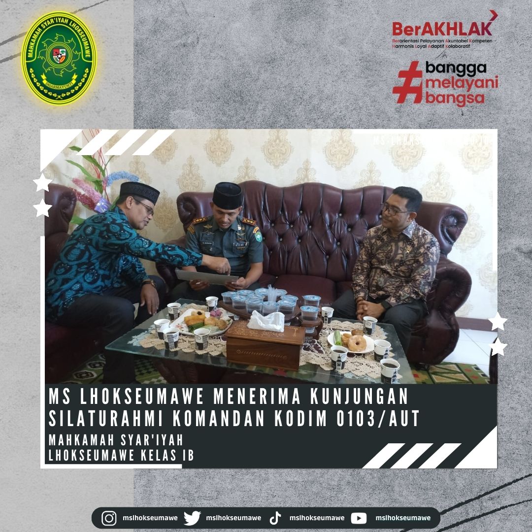 ms-lhoseumawe.go.id | Kamis, 15 Juni 2023 – Mahkamah Syar’iyah Lhokseumawe menerima Kunjungan Silaturahmi Komandan Distrik Militer (Dandim) 0103/Aceh Utara, Letkol Inf Hendrasari Nurhono S.I.P.,M.I.P., beserta rombongan yang diterima langsung oleh Ketua Mahkamah Syar’iyah Lhokseumawe Bapak Yedi Suparman, S.H.I, M.H. dan Wakil Ketua Bapak Amrin Salim, S.Ag., M.A beserta para Panitera dan Sekretaris di Ruang Ketua MS Lhokseumawe. Kunjungan ini dalam rangka koordinasi dan rencana dalam kerjasama (MoU) dalam hal pertukaran informasi dan kegiatan sosial.
