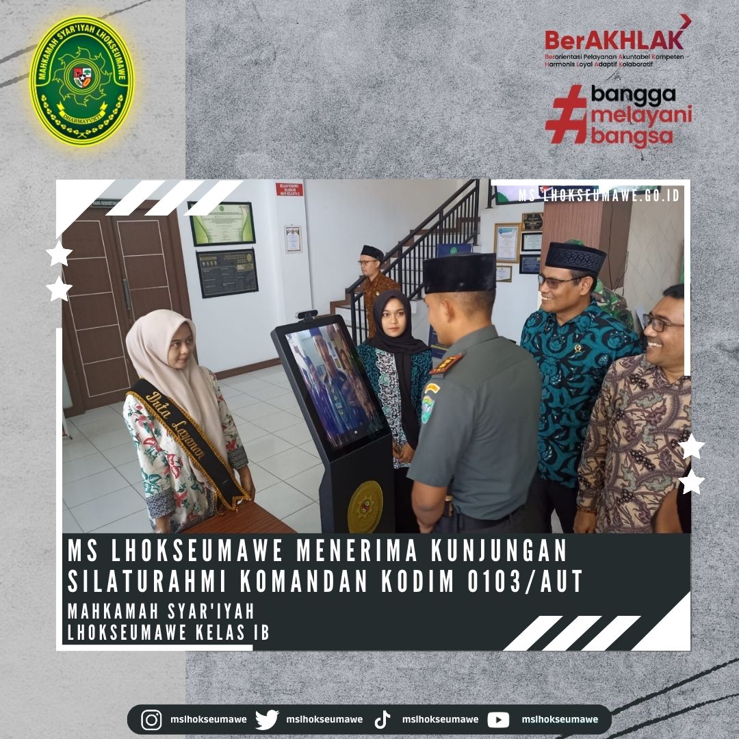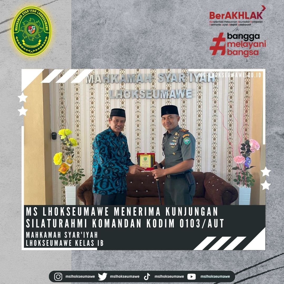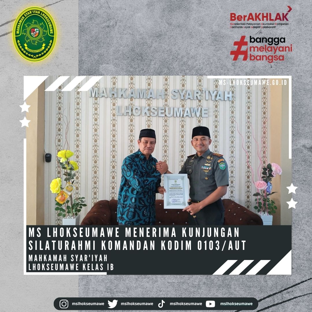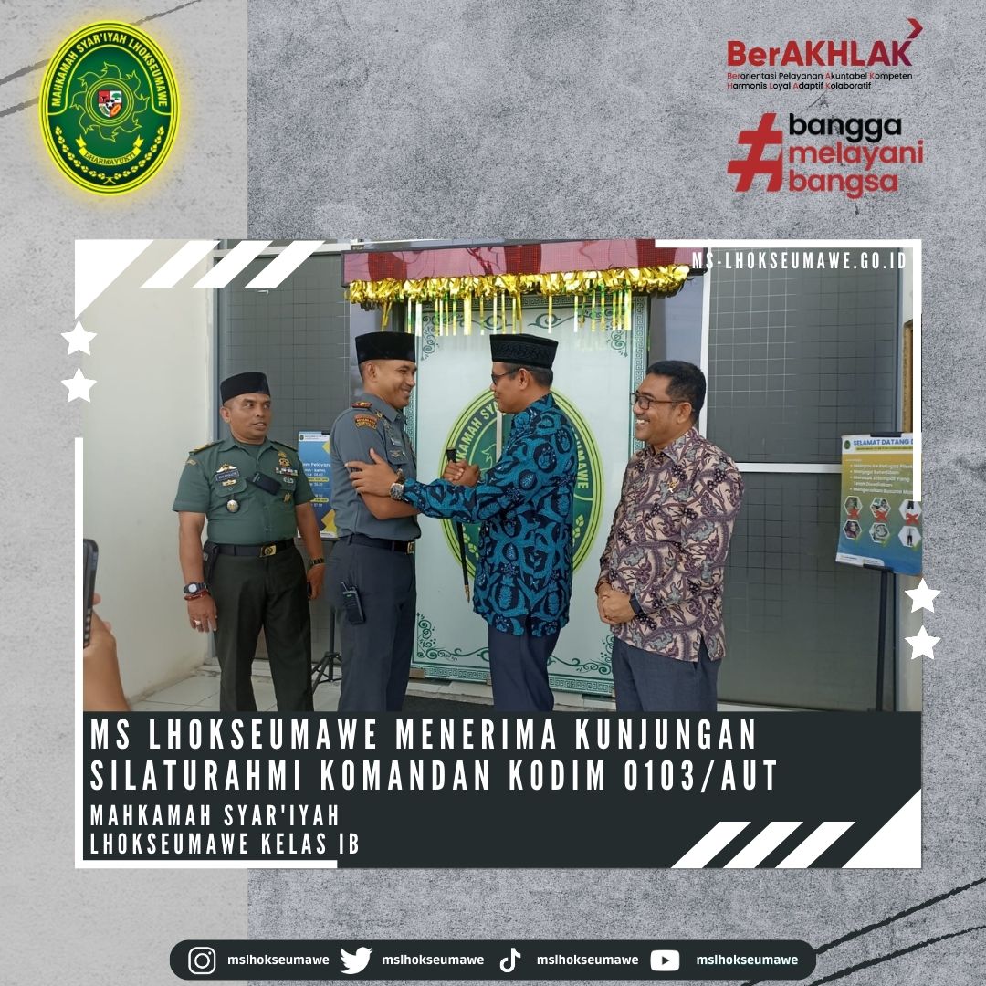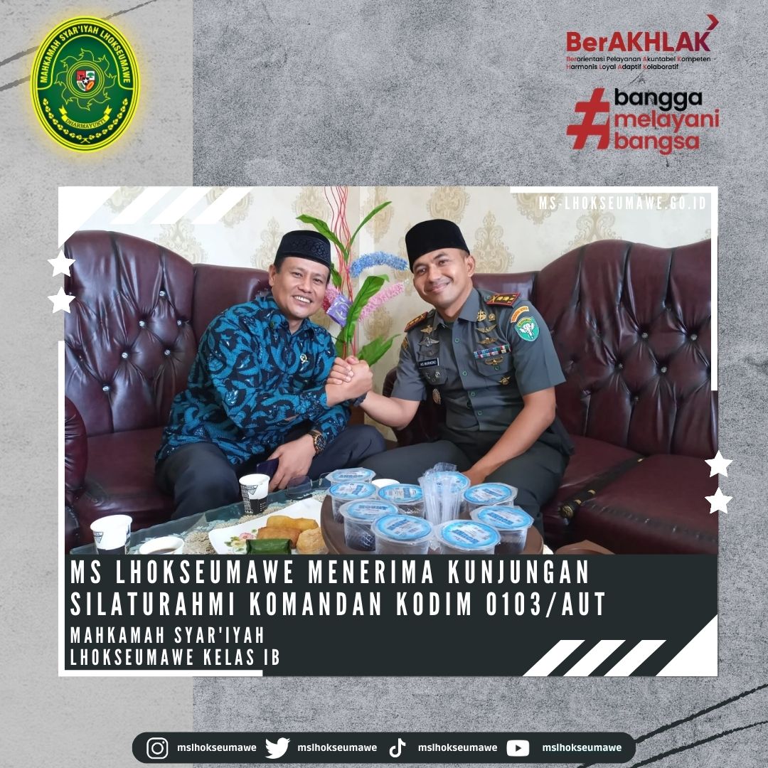 ms-lhoseumawe.go.id | Kamis, 15 Juni 2023 – Mahkamah Syar’iyah Lhokseumawe menerima Kunjungan Silaturahmi Komandan Distrik Militer (Dandim) 0103/Aceh Utara, Letkol Inf Hendrasari Nurhono S.I.P.,M.I.P., beserta rombongan yang diterima langsung oleh Ketua Mahkamah Syar’iyah Lhokseumawe Bapak Yedi Suparman, S.H.I, M.H. dan Wakil Ketua Bapak Amrin Salim, S.Ag., M.A beserta para Panitera dan Sekretaris di Ruang Ketua MS Lhokseumawe. Kunjungan ini dalam rangka koordinasi dan rencana dalam kerjasama (MoU) dalam hal pertukaran informasi dan kegiatan sosial.