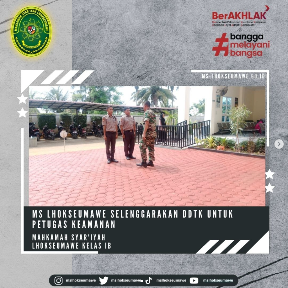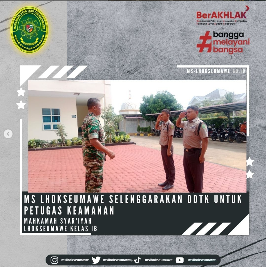 ms-lhokseumawe.go.id | Jum’at, 23 Juni 2023 – Bertempat di halaman belakang Mahkamah Syar’iyah Lhokseumawe diselenggarakan DDTK (Diklat Di Tempat Kerja) oleh perwakilan dari Dandim 0103/Aceh Utara, Babinsa Pos Ramil Muara Dua Serda Doni Hariadi Panjaitan menjadi Pembina/Trainer yang memberikan pelatihan dan bimbingan standar pelayanan dalam segi kemanan kepada petugas keamanan (Security).