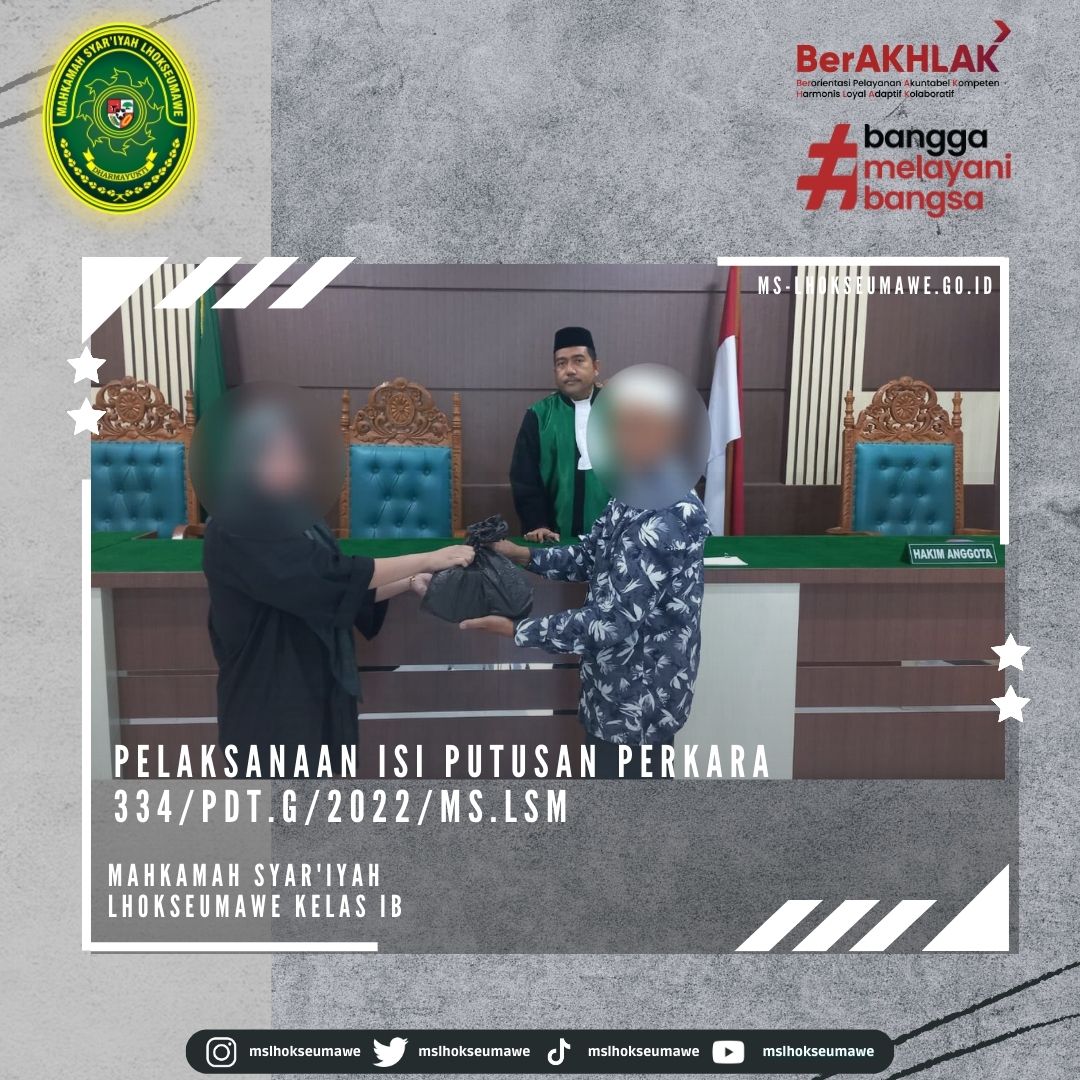 ms-lhokseumawe.go.id | Selasa, 31 Januari 2023 Pelaksanaan isi putusan oleh Mahkamah Syar’iyah Lhokseumawe terhadap putusan Nomor: 334/Pdt.G/2022/MS.Lsm dalam perkara Cerai Talak. Pelaksanaan isi putusan dipimpin langsung oleh Ketua Majelis Bapak Amrin Salim, S.Ag., M.A (Wakil Ketua) yang bertempat di Ruang Sidang Utama MS Lhokseumawe. Meskipun para pihak memilih untuk berpisah (bercerai) dan ikrar talak telah selesai dilaksanakan, Pemohon dan Termohon tidak mengenyampingkan kewajiban serta menyepakati bersama kesepakatan berhasil sebagian dengan nilai kewajiban sekitar 500 Juta rupiah terkait pembagian harta bersama, pembagian hasil penjualan mobil dan rumah, nafkah iddah dan mut’ah serta harta bawaan.