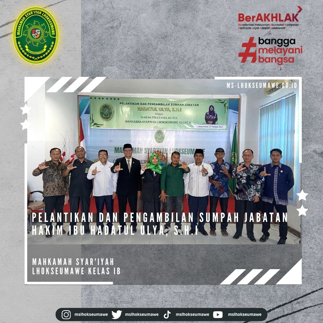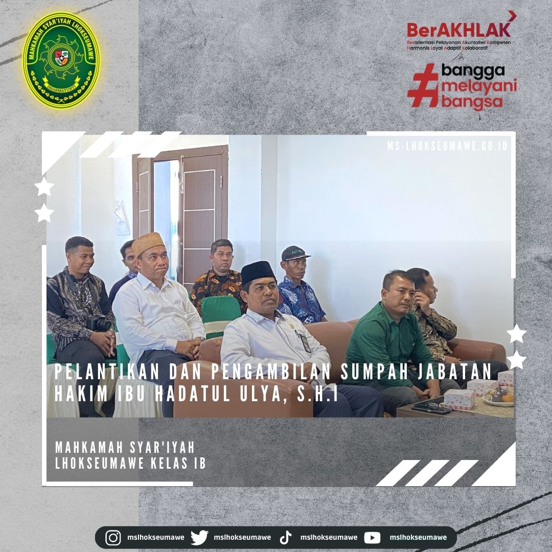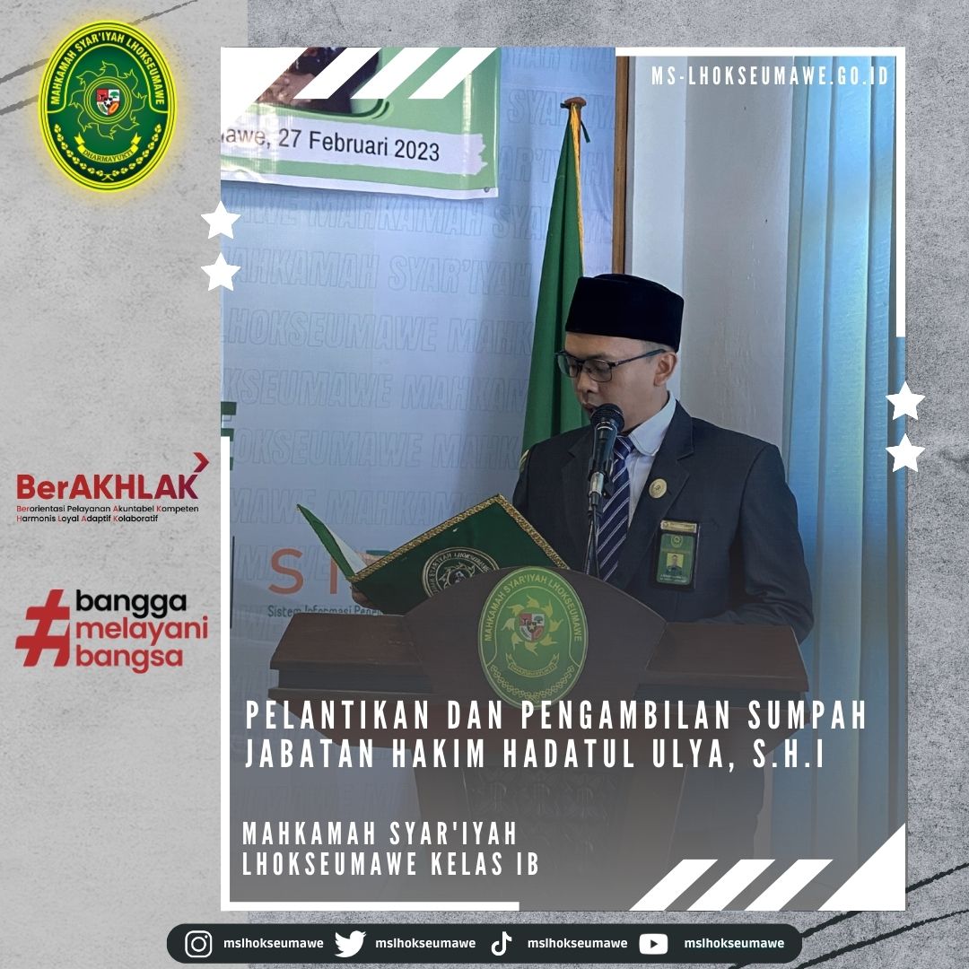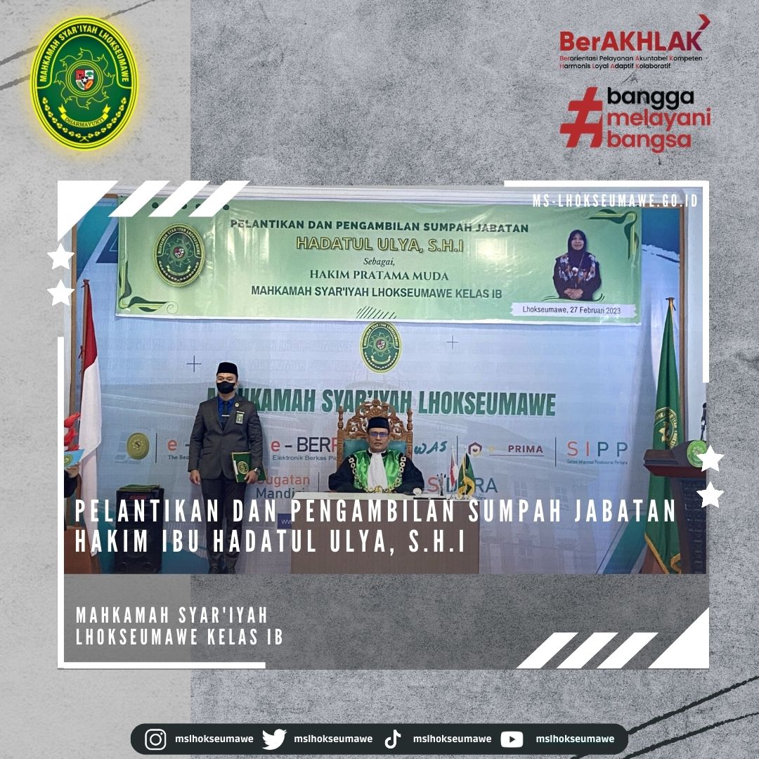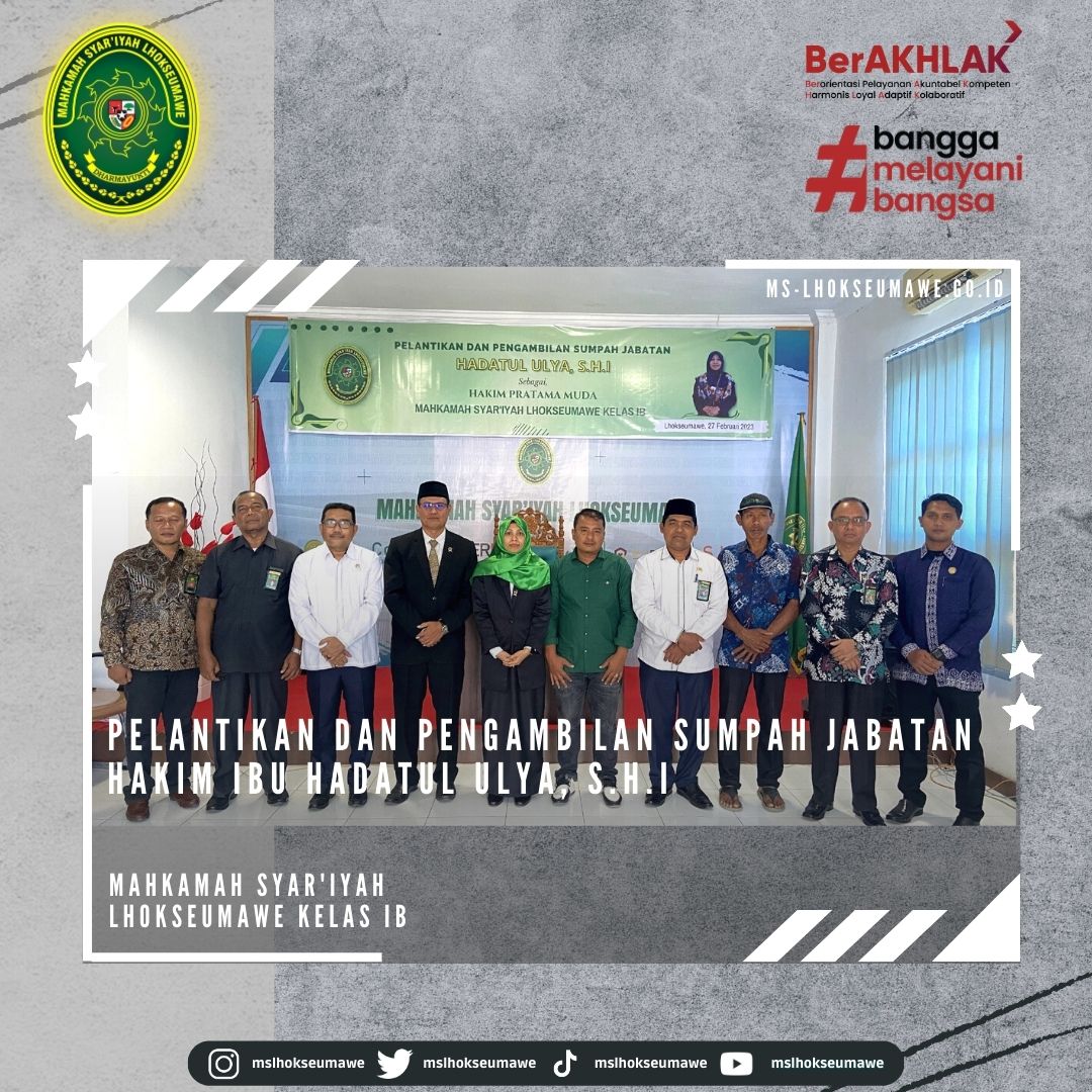 ms-lhokseumawe.go.id | Senin, 27 Februari 2023 – Bertempat diruang Aula lantai II Mahkamah Syar’iyah Lhokseumawe. Acara dimulai tepat pukul 14.00 WIB Ketua Mahkamah Syar’iyah Lhokseumawe Yedi Suparman, S.H.I.,M.H. melantik dan mengambil sumpah jabatan Hakim Mahkamah Syar’iyah Lhokseumawe kelas IB Ibu Hadatul Ulya, S.H.I. Sebelumnya beliau menjabat sebagai Hakim Mahkamah Syar’iyah Calang kelas II. Acara pelantikan tersebut dihadiri oleh seluruh pegawai MS Lhokseumawe, Keluarga besar MS Calang, Keluarga besar MS Banda Aceh, beserta keluarga Ibu Hadatul Ulya, S.H.I.