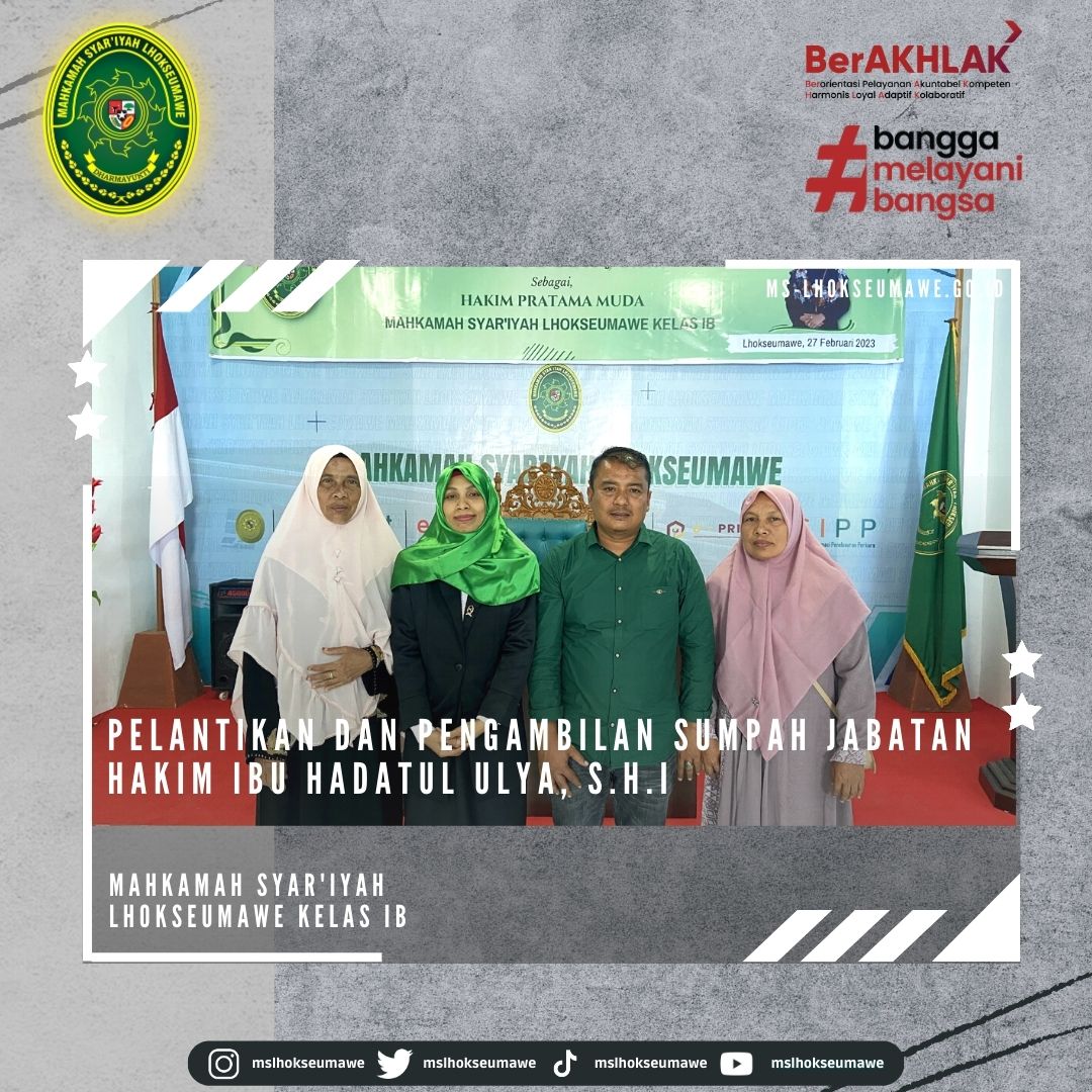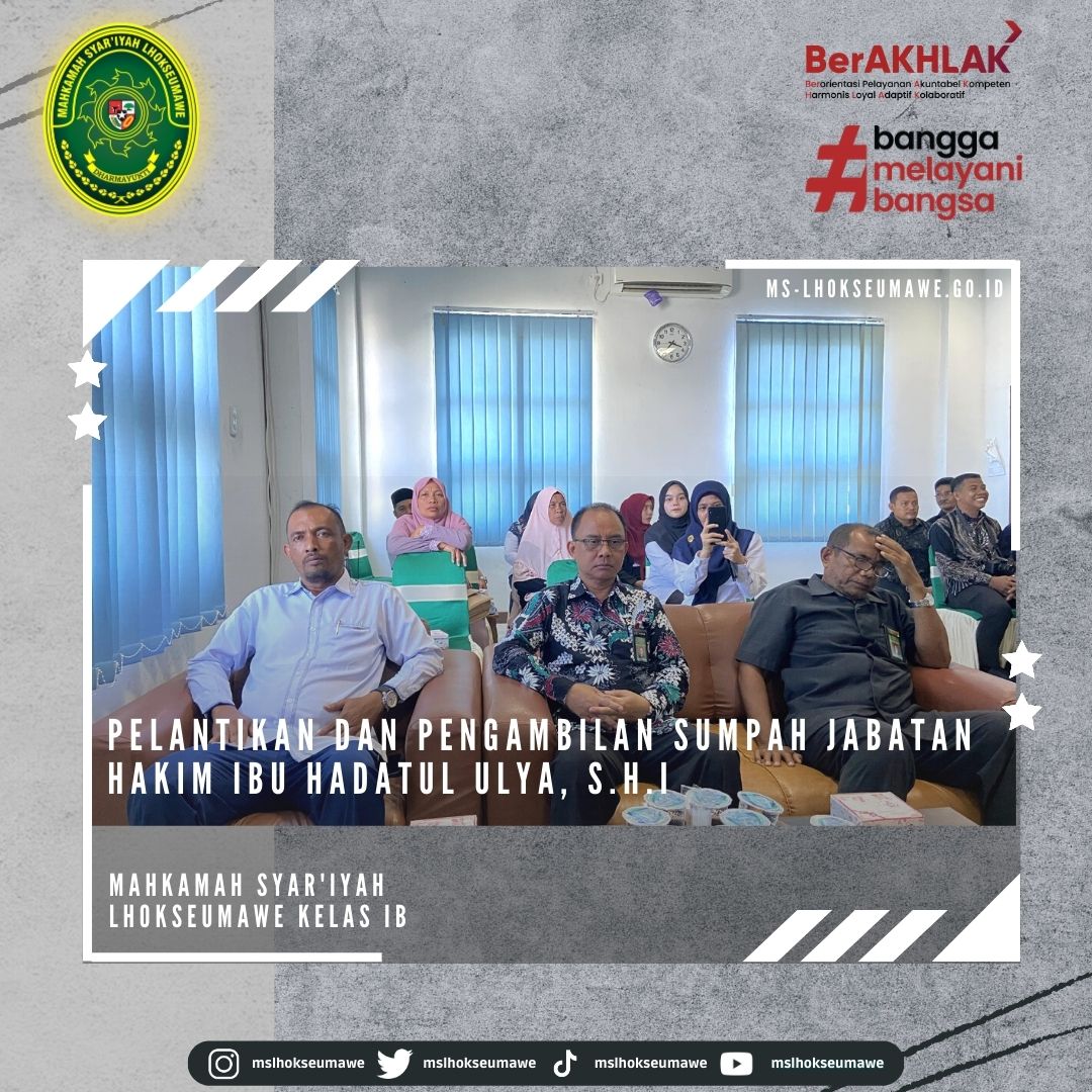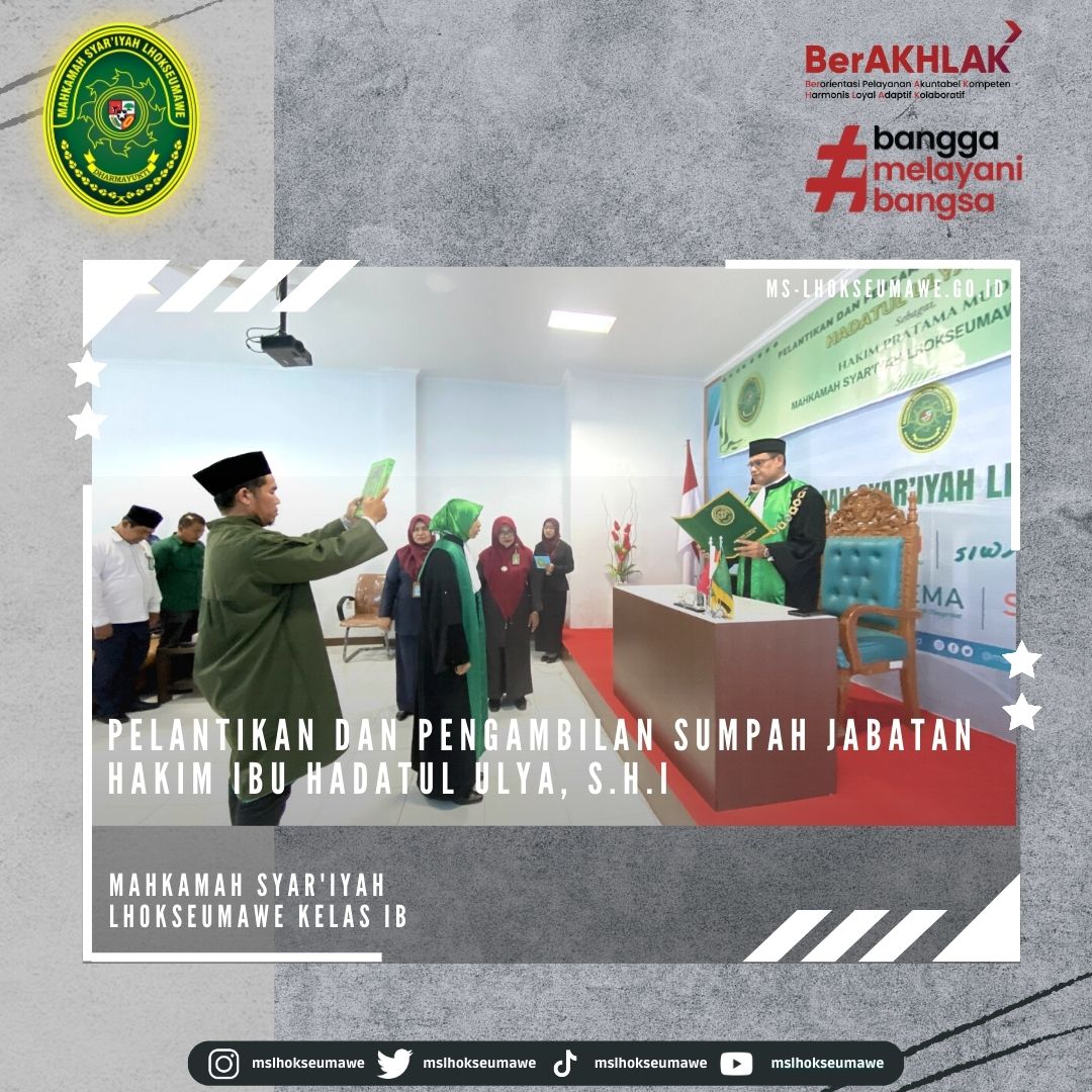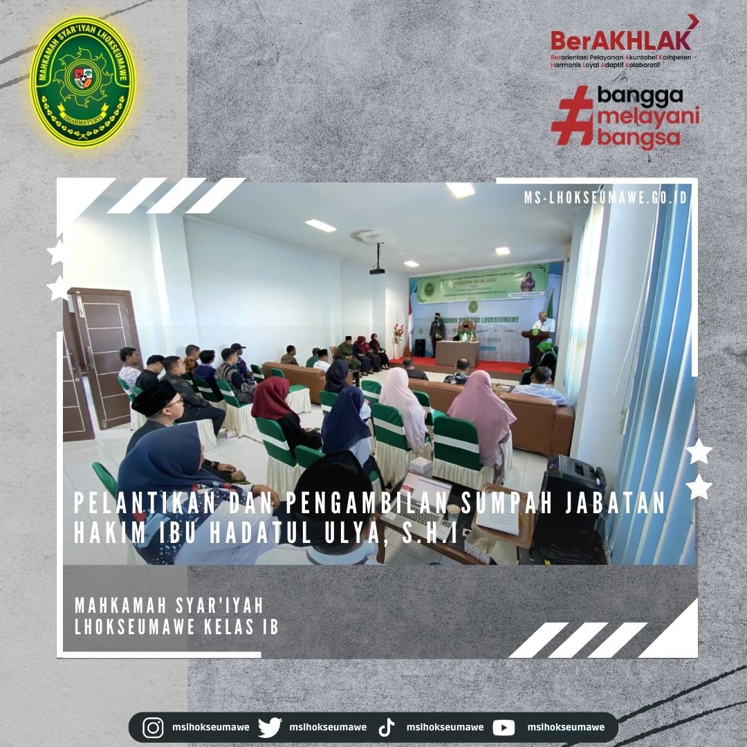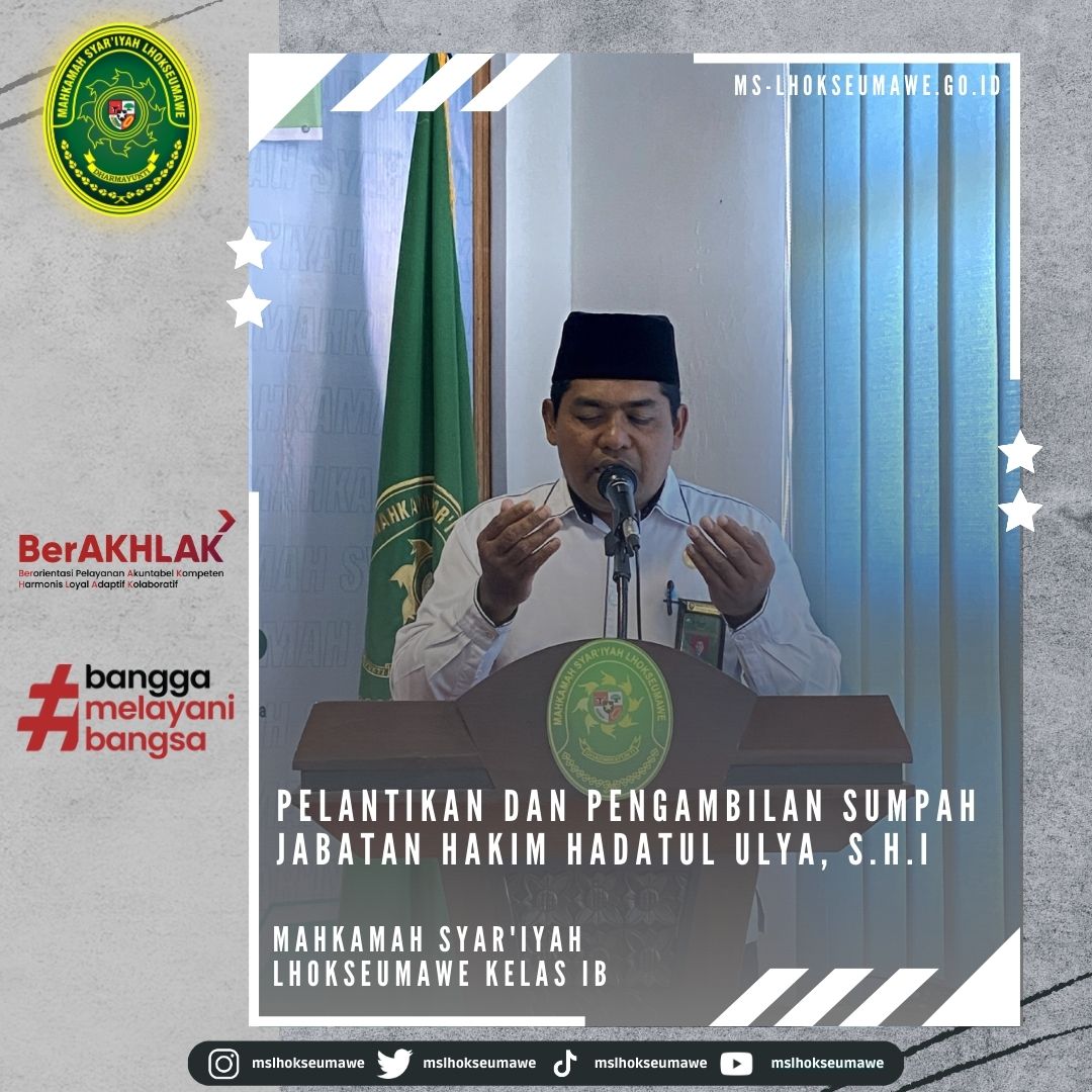 ms-lhokseumawe.go.id | Senin, 27 Februari 2023 – Bertempat diruang Aula lantai II Mahkamah Syar’iyah Lhokseumawe. Acara dimulai tepat pukul 14.00 WIB Ketua Mahkamah Syar’iyah Lhokseumawe Yedi Suparman, S.H.I.,M.H. melantik dan mengambil sumpah jabatan Hakim Mahkamah Syar’iyah Lhokseumawe kelas IB Ibu Hadatul Ulya, S.H.I. Sebelumnya beliau menjabat sebagai Hakim Mahkamah Syar’iyah Calang kelas II. Acara pelantikan tersebut dihadiri oleh seluruh pegawai MS Lhokseumawe, Keluarga besar MS Calang, Keluarga besar MS Banda Aceh, beserta keluarga Ibu Hadatul Ulya, S.H.I.