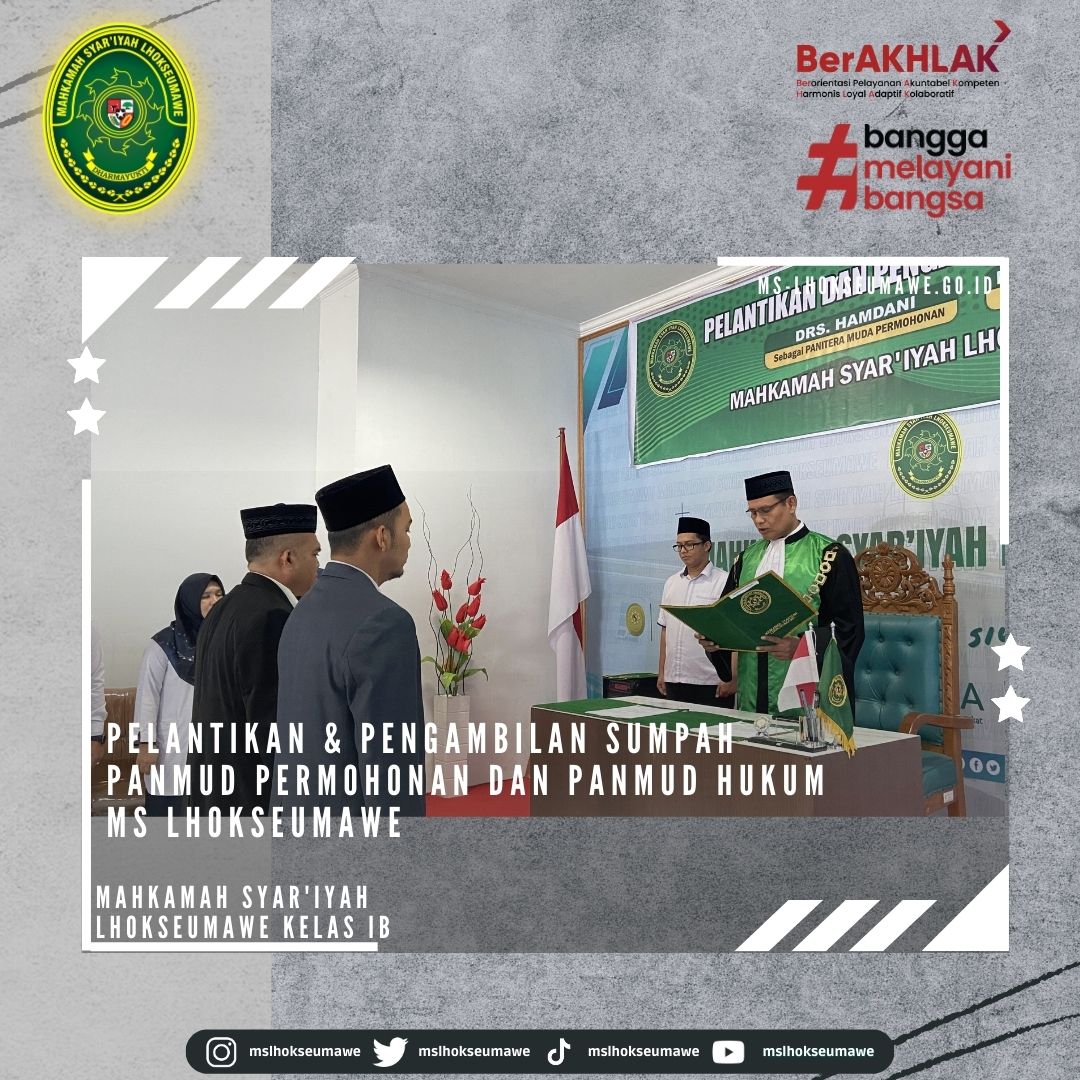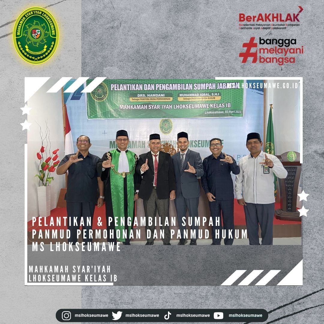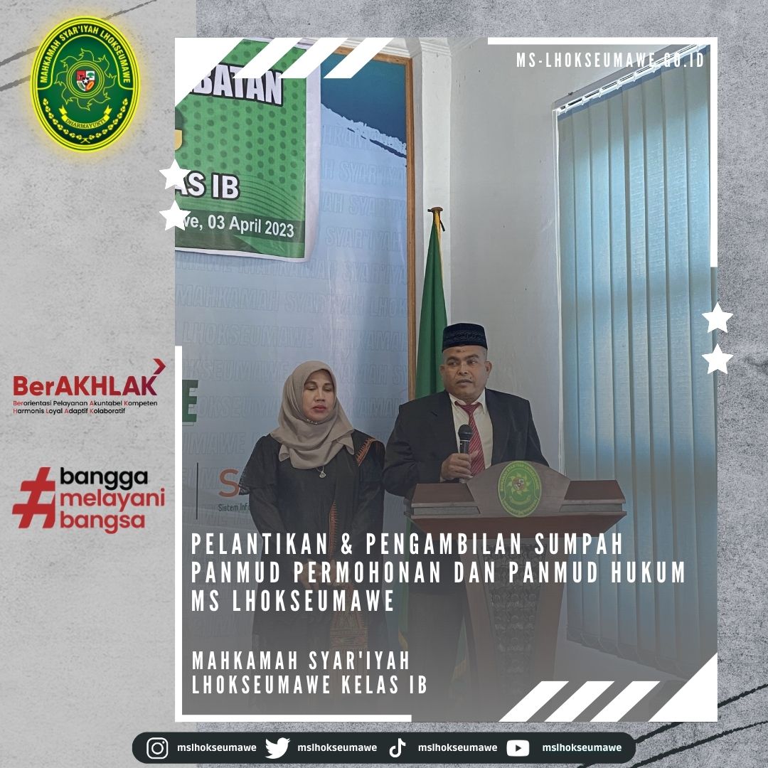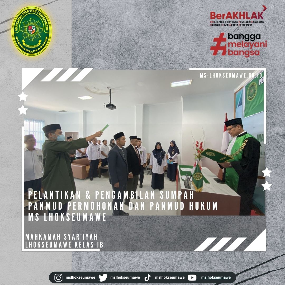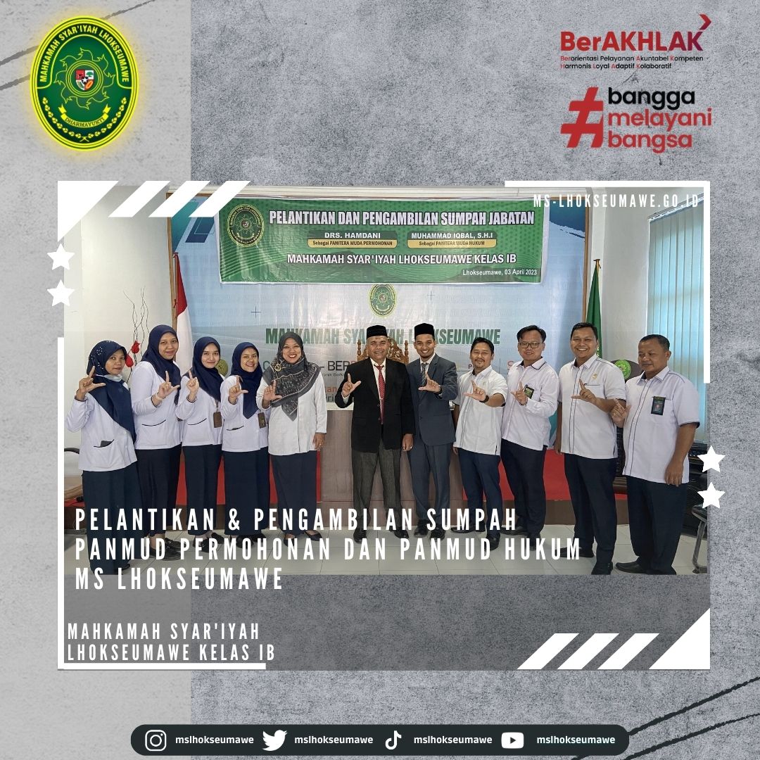 ms-lhokseumawe.go.id | Senin, 03 April 2023 – Pelantikan dan Pengambilan Sumpah Jabatan Panitera Muda Permohonan dan Panitera Muda Hukum MS Lhokseumawe. Bertempat diruang Aula lantai II Mahkamah Syar’iyah Lhokseumawe, acara dimulai tepat pukul 14.30 WIB. Ketua Mahkamah Syar’iyah Lhokseumawe Yedi Suparman, S.H.I.,M.H. melantik dan mengambil sumpah jabatan Panmud Permohonan Bapak Drs. Hamdani, yang Sebelumnya beliau menjabat sebagai Panmud Jinayah MS Takengon Kelas IB dan Panmud Hukum Bapak M. Iqbal, S.H.I yang sebelumnya menjabat sebagai Panmud Gugatan MS Lhoksukon Kelas II. Acara pelantikan tersebut dihadiri oleh seluruh pegawai MS Lhokseumawe, Keluarga besar MS Lhoksukon, beserta keluarga dari pejabat yang dilantik.