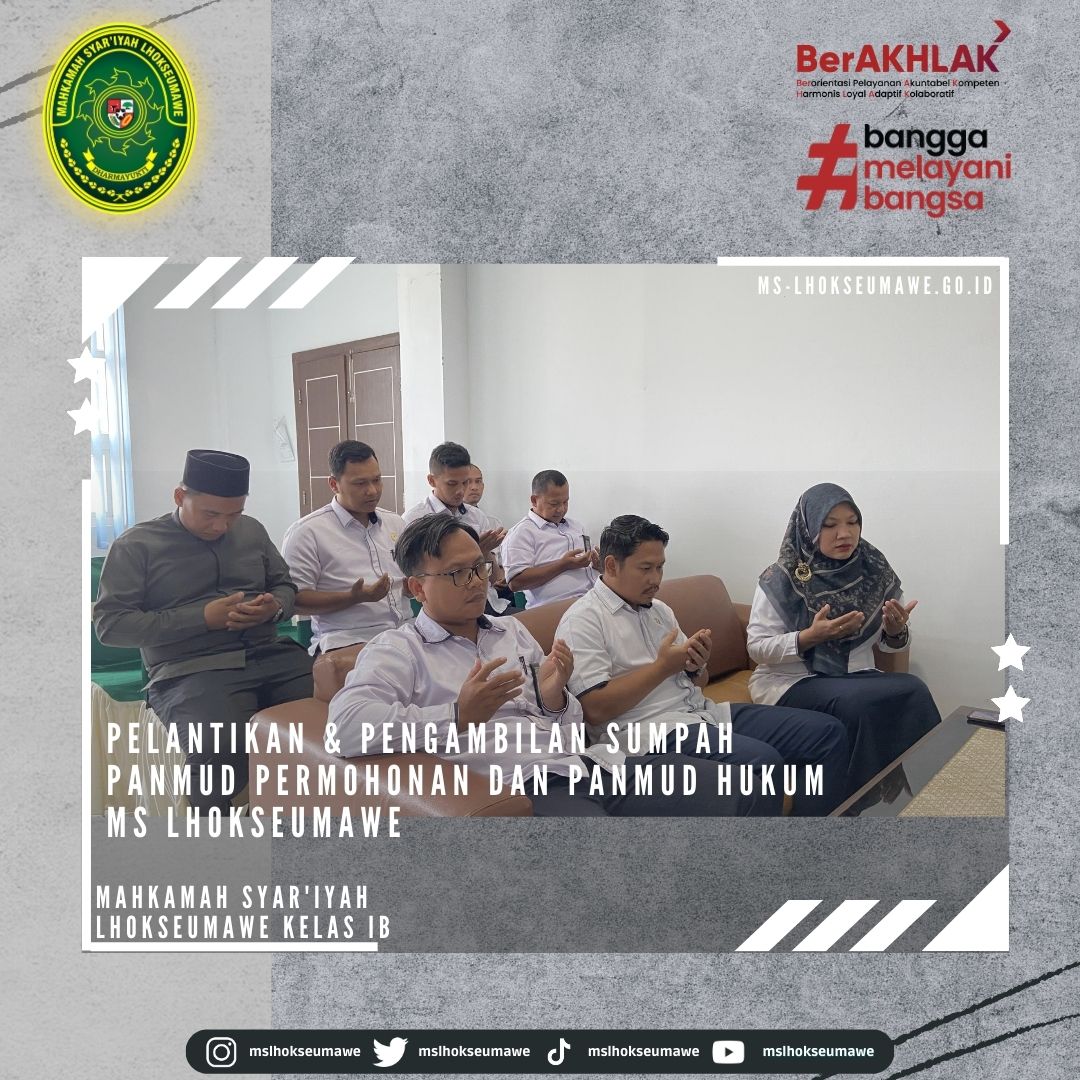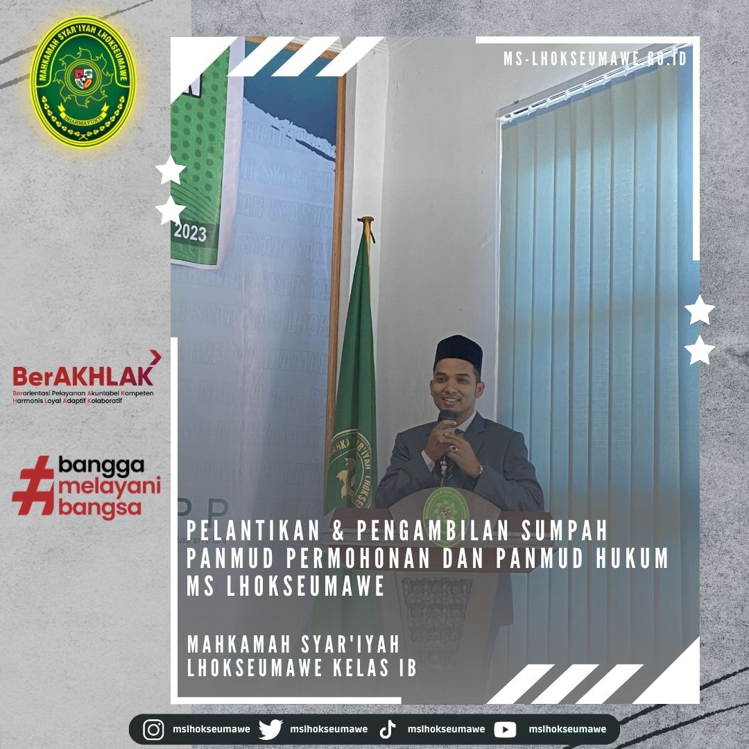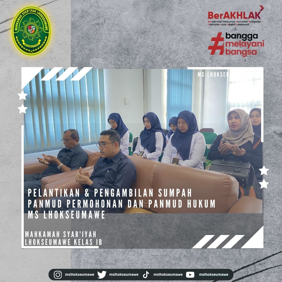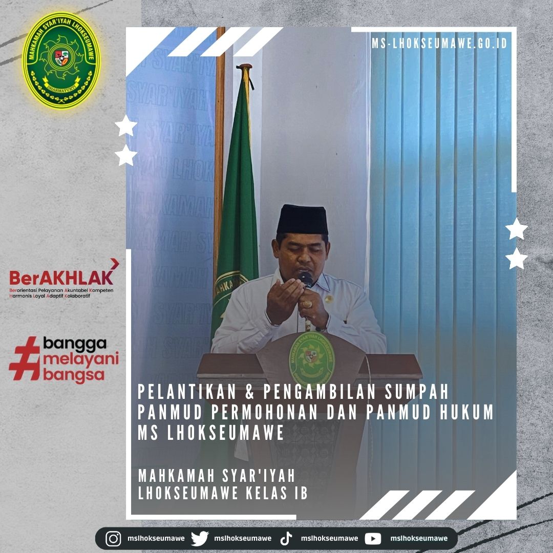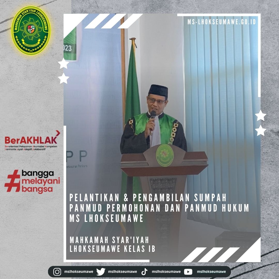 ms-lhokseumawe.go.id | Senin, 03 April 2023 – Pelantikan dan Pengambilan Sumpah Jabatan Panitera Muda Permohonan dan Panitera Muda Hukum MS Lhokseumawe. Bertempat diruang Aula lantai II Mahkamah Syar’iyah Lhokseumawe, acara dimulai tepat pukul 14.30 WIB. Ketua Mahkamah Syar’iyah Lhokseumawe Yedi Suparman, S.H.I.,M.H. melantik dan mengambil sumpah jabatan Panmud Permohonan Bapak Drs. Hamdani, yang Sebelumnya beliau menjabat sebagai Panmud Jinayah MS Takengon Kelas IB dan Panmud Hukum Bapak M. Iqbal, S.H.I yang sebelumnya menjabat sebagai Panmud Gugatan MS Lhoksukon Kelas II. Acara pelantikan tersebut dihadiri oleh seluruh pegawai MS Lhokseumawe, Keluarga besar MS Lhoksukon, beserta keluarga dari pejabat yang dilantik.