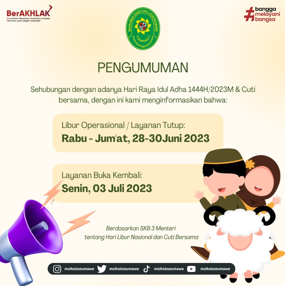 PENGUMUMAN CUTI BERSAMA HARI RAYA IDUL ADHA 1444H/2023M Tue, 27 June 2023 PENGUMUMAN CUTI BERSAMA HARI RAYA IDUL FITRI 1444H/2023M Previous Post MS Lhokseumawe dan Dukcapil Kota Lhokseumawe pembahasan lanjutan terkait kerjasama. Next Post PENDAMPINGAN ZONA INTEGRITAS OLEH MS ACEH SECARA DARING