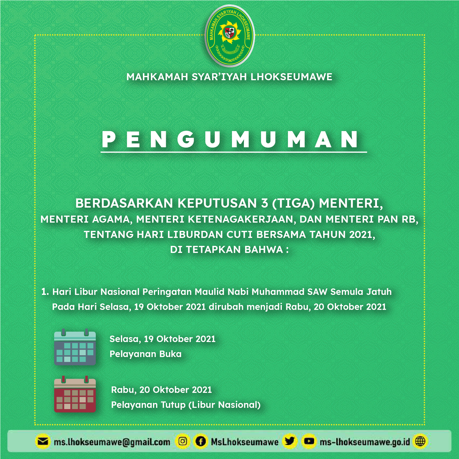 PENGUMUMAN – PELAYANAN SAAT CUTI BERSAMA DALAM MEMPERINGATI MAULID NABI MUHAMMAD SAW Mon, 18 October 2021 PENGUMUMAN PELAYANAN DALAM RANGKA MEMPERINGATI MAULID NABI MUHAMMAD SAW Previous Post APEL SORE JUM’AT 15 OKTOBER 2021 Next Post Apel Pagi Senin 18 Oktober 2021