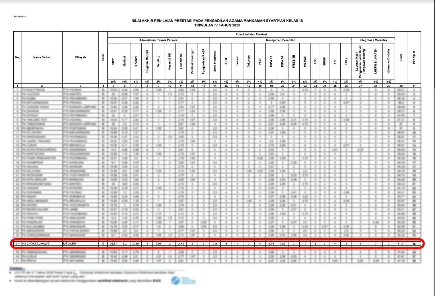 Berdasarkan Surat Direktur Jenderal Badan Peradilan Agama Nomor : 500/DJA/OT.01.2/2/2023, tanggal 3 Februari 2023, perihal “Nilai Akhir Penilaian Prestasi Kinerja Satuan Kerja di Lingkungan Peradilan Agama Triwulan IV Tahun 2022”, Alhamdulillah Mahkamah Syar’iyah Lhokseumawe Kelas IB berada di Peringkat ke-1 Se-Aceh dan Peringkat Nasional urutan ke-35 dengan Nilai Akhir 81,97.