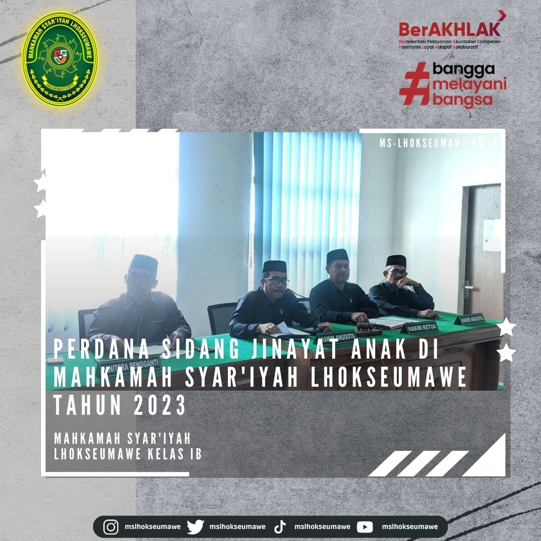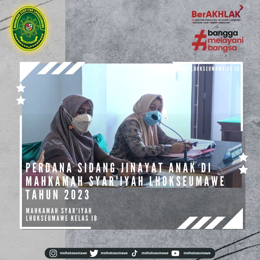 ms-lhokseumawe.go.id | Selasa, 07 Februari 2023. Perdana, Sidang perkara jinayat anak disidangkan di Mahkamah Syar’iyah Lhokseumawe Tahun 2023. Bertempat di Ruang Sidang Anak, Perkara anak yang tercatat pada nomor register 1/JN-Anak/2023/MS.Lsm ini didakwa primer melanggar 47 Qanun aceh nomor 6 tahun 2014 tentang Hukum Jinayat jo Undang-undang nomor 11 tahun 2012 tentang Sistem Peradilan Pidana Anak. Dalam gelar sidang perdana hari ini selain Jaksa Penuntut Umum dan Penasihat Hukum turut dihadiri anak saksi dan orangtuanya, pendamping anak (Pekerja Sosial) dan Balai Pemasyarakatan serta dihadiri secara daring oleh pelaku anak. Sidang perkara jinayat anak ini ditunda besok untuk pembacaan eksepsi.