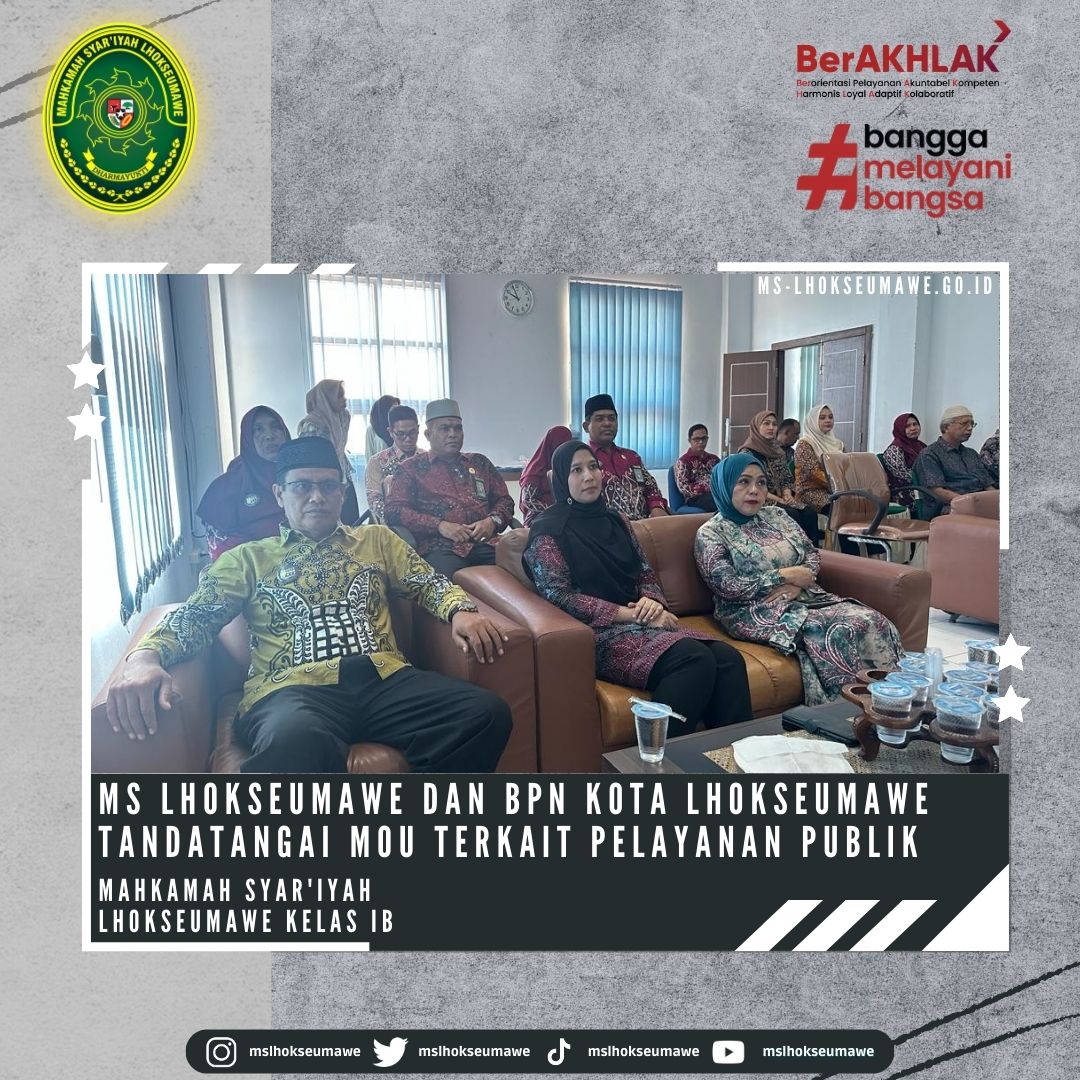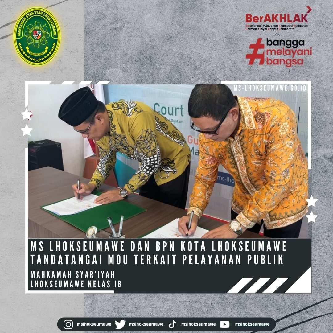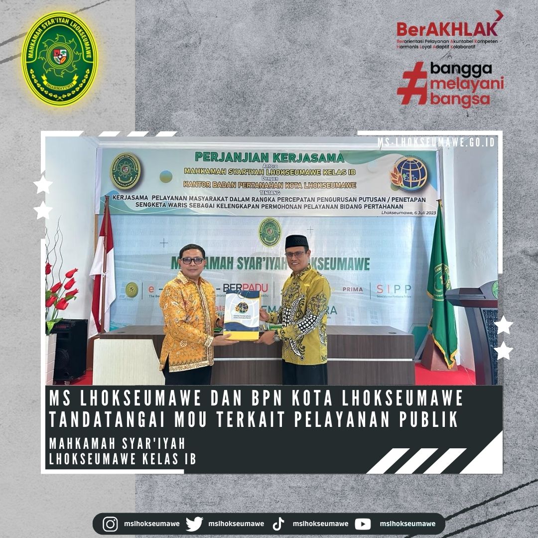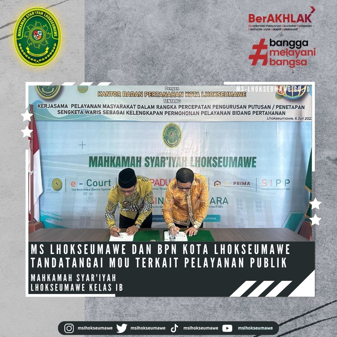 Mahkamah Syar’iyah Lhokseumawe dan Badan Pertanahan Kota Lhokseumawe tandatangani Perjanjian Kersama terkait dengan Pelayanan Masyarakat dalam rangka percepatan pengurusan putusan/penetapan.