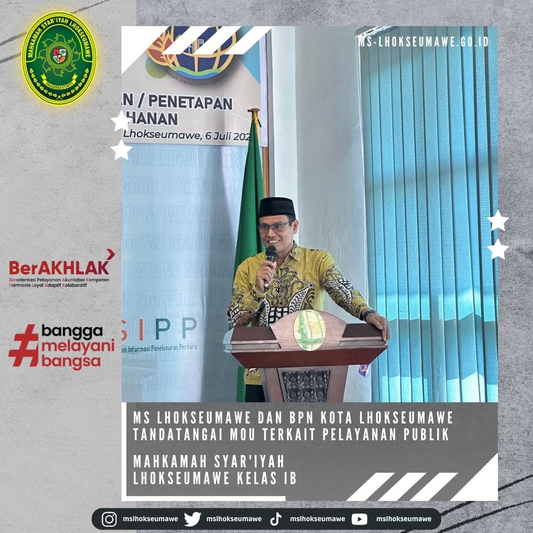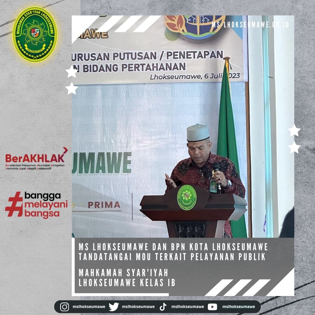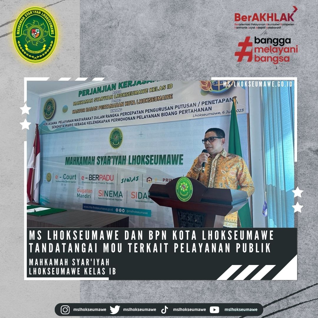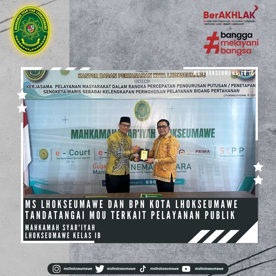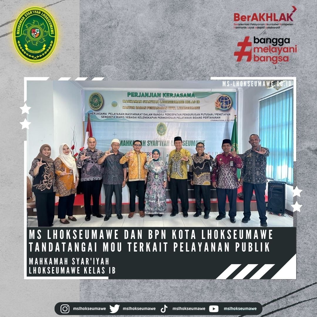 Mahkamah Syar’iyah Lhokseumawe dan Badan Pertanahan Kota Lhokseumawe tandatangani Perjanjian Kersama terkait dengan Pelayanan Masyarakat dalam rangka percepatan pengurusan putusan/penetapan.