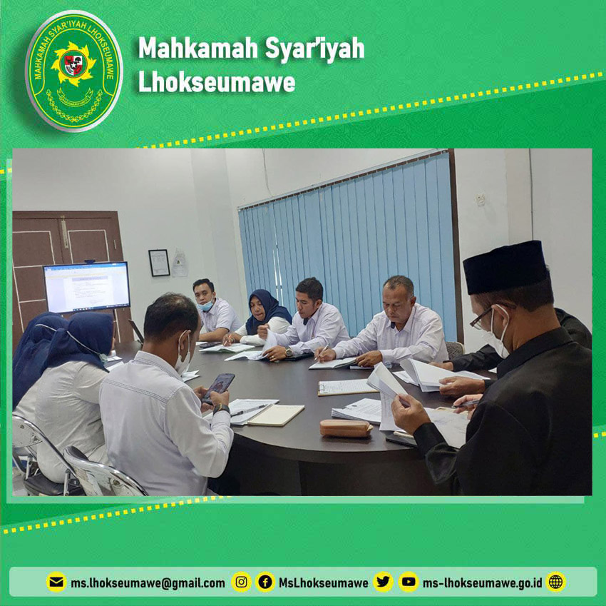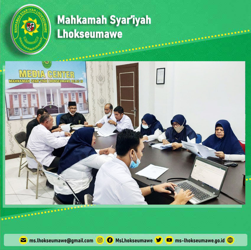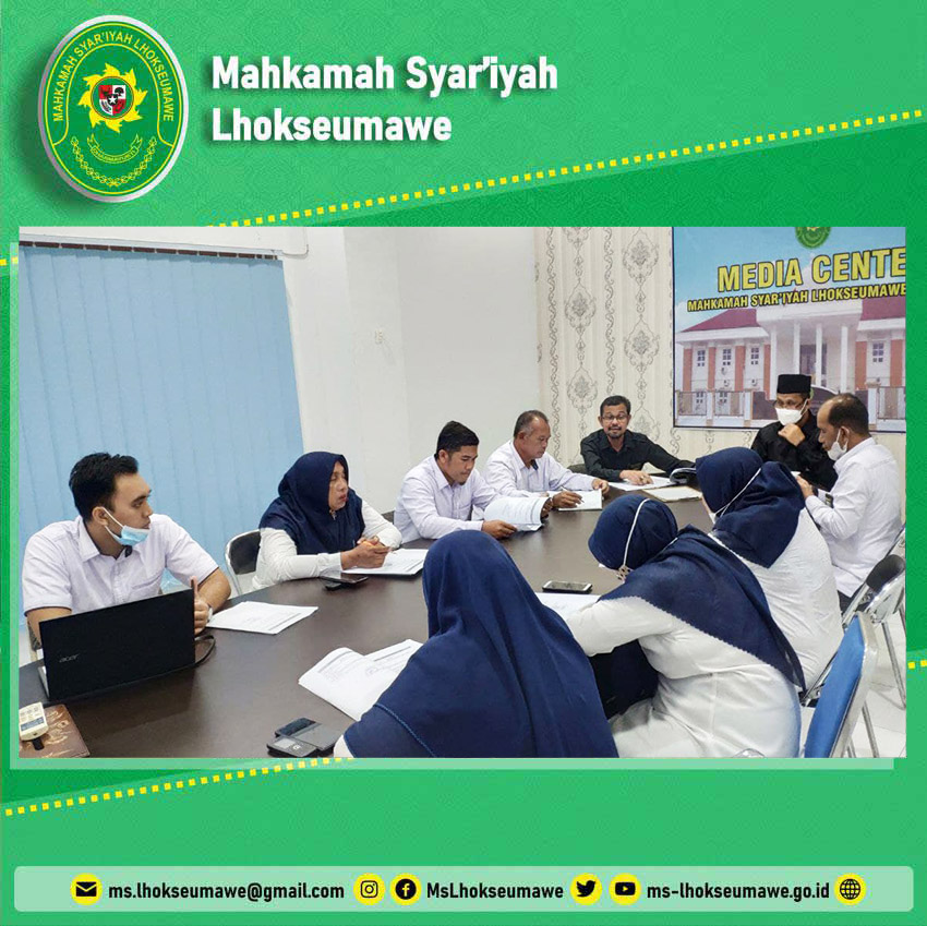 ms-lhokseumawe.go.id | Senin 13 September 2021 – Bertempat di Ruang Media Center Mahkamah Syar’iyah Lhokseumawe, telah dilaksanakan Rapat Evaluasi Job Description PPNPN. Dipimpin oleh Wakil Ketua MS Lhokseumawe Dr. Amir Khalis dan dihadiri oleh Hakim Drs. Iskandar, M.H., Sekretaris Syarbaini, S.Ag, Plt. Panitera Drs. Syamsul Bahri, Para Panitera Muda, dan Para kasubbag rapat ini membahas Job-Desc PPNPN dengan harapan lebih menyesuaikan dengan kondisi dilapangan saat ini. Rencananya, rapat lanjutan hasil follow-up akan dilaksanakan kembali pada senin 20 september 2021.