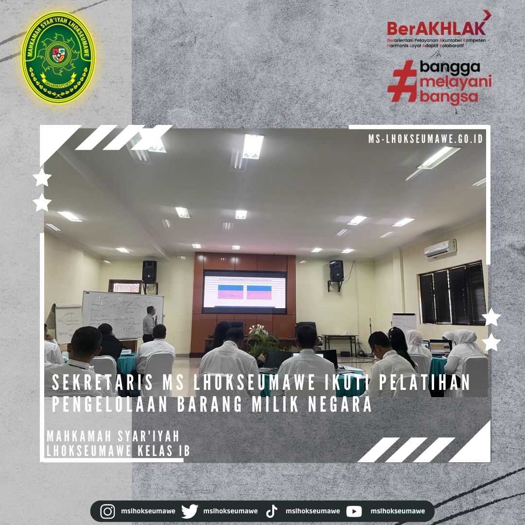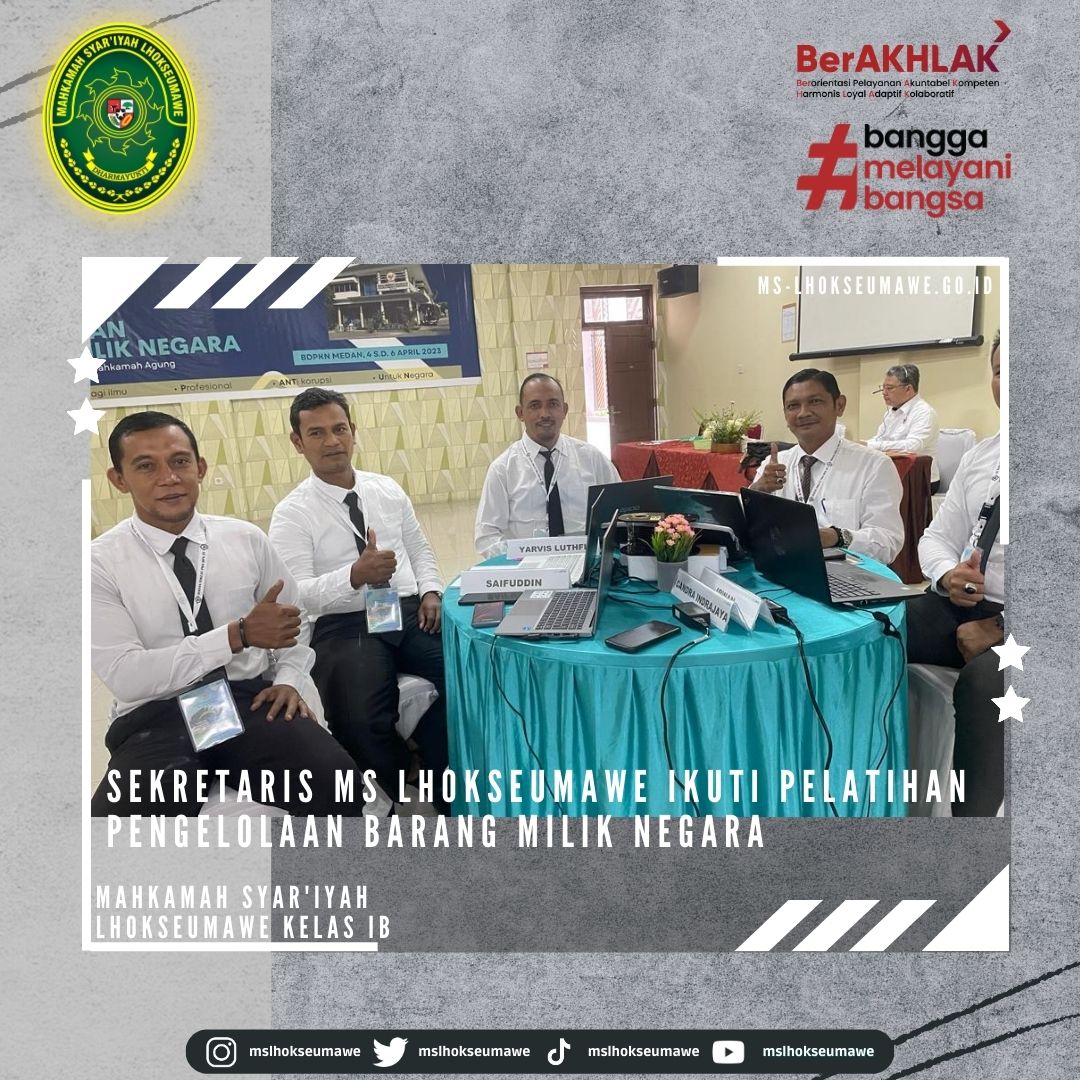 ms-lhokseumawe.go.id | Kamis, 06 April 2023 – Sekretaris Mahkamah Syar’iyah Lhokseumawe (MS LHoksuemawe) Bapak Yarvis Luthfi, S.H. ikuti Pelatihan Pengelolaan Barang Milik Negara (BMN) yang diselenggarakan oleh Badan Penelitian dan Pengembangan dan Pendidikan dan Pelatihan Hukum dan Peradilan Mahkamah Agung Republik Indonesia (Pusdiklat Menpim MA-RI). “Dukungan Sekretaris Pengadilan Dalam Pengelolaan BMN untuk Mewujudkan Kerangka Kerja Internasional Bagi Peradilan Unggul (IFCE)” menjadi fokus materi pembelajaran pada Pelatihan Pengelolaan BMN yang diselenggarakan di Balai Diklat PKN BPK Medan. Pelatihan Pengelolaan BMN ini dilaksanakan selama 3 (tiga) hari mulai dari tanggal 04 April 2023 sampai dengan 06 April 2023.
