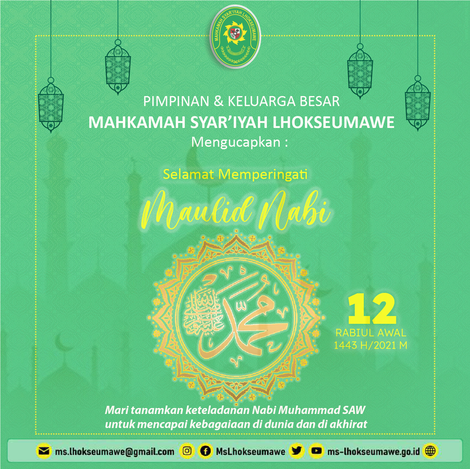 Selamat Memperingati Maulid Nabi Muhammad SAW Tue, 19 October 2021 Pimpinan & Keluarga Besar Mahkamah Syar’iyah Lhokseumawe mengucapkan : Selamat Memperingati Maulid Nabi Muhammad SAW 12 Rabiul Awal 1443 H Previous Post Tindak Lanjut MoU Mahkamah Syar’iyah Lhokseumawe dan Bank Indonesia Next Post Dharmayukti Karini Cabang Lhokseumawe lakukan Kegiatan Anjangsana ke Pantiasuhan