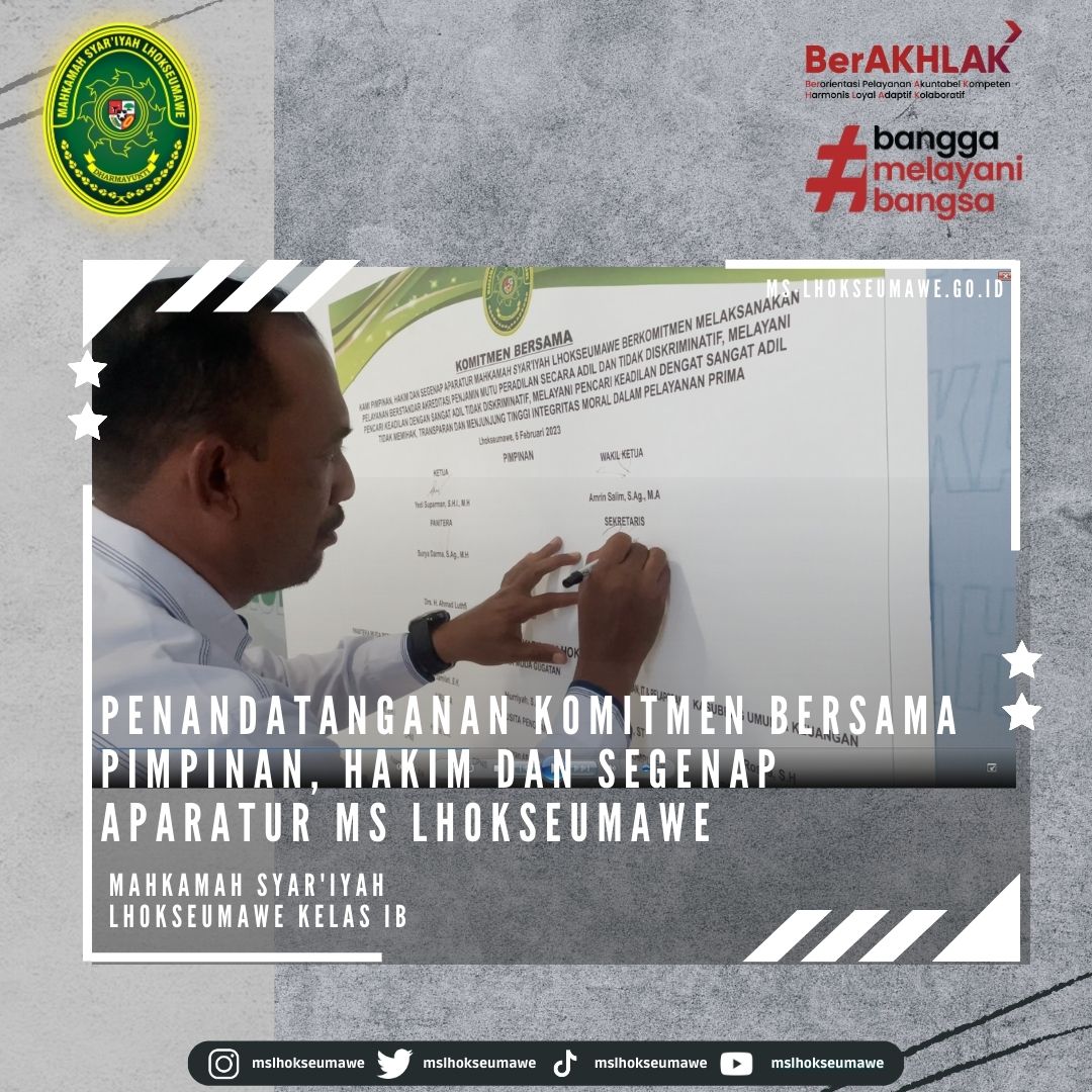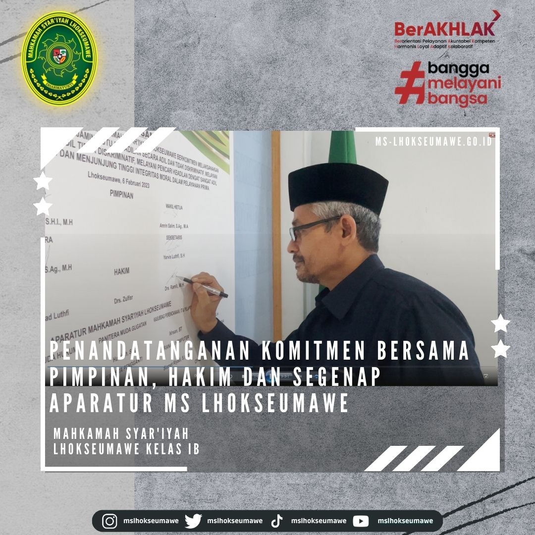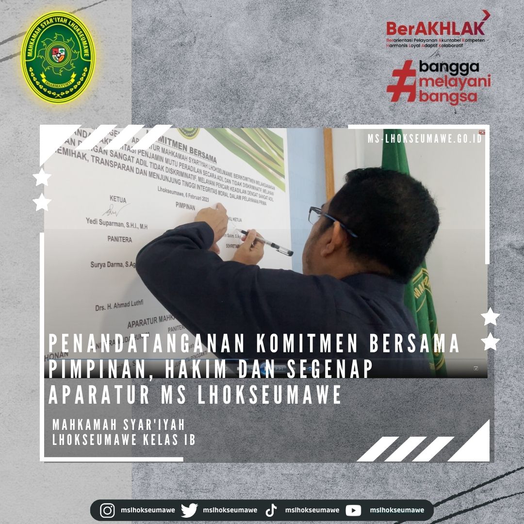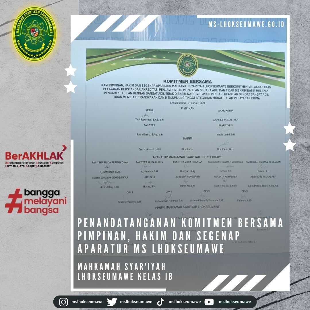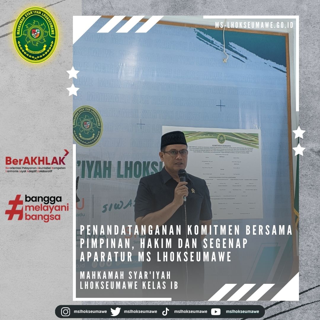 Senin, 06 Februari 2023, Ketua Mahkamah Syar’iyah Lhokseumawe Bapak Yedi Suparman, S.H.I., M.H. didampingi Sekretaris Mahkamah Syar’iyah Lhokseumawe Bapak Yarvis Luthfi, S.H. melakukan serah terima Mahasiswa Magang UNIKI. Turut hadir Dosen Pembimbing dan Para Mahasiswa UNIKI Lhokseumawe. Ketua MS Lhokseumawe Hakim Bapak Yedi Suparman, S.H.I., M.H. menyambut baik adanya kegiatan praktikum ini dan beliau berharap para mahasiswa agar berperan aktif selama magang di MS Lhokseuamawe.