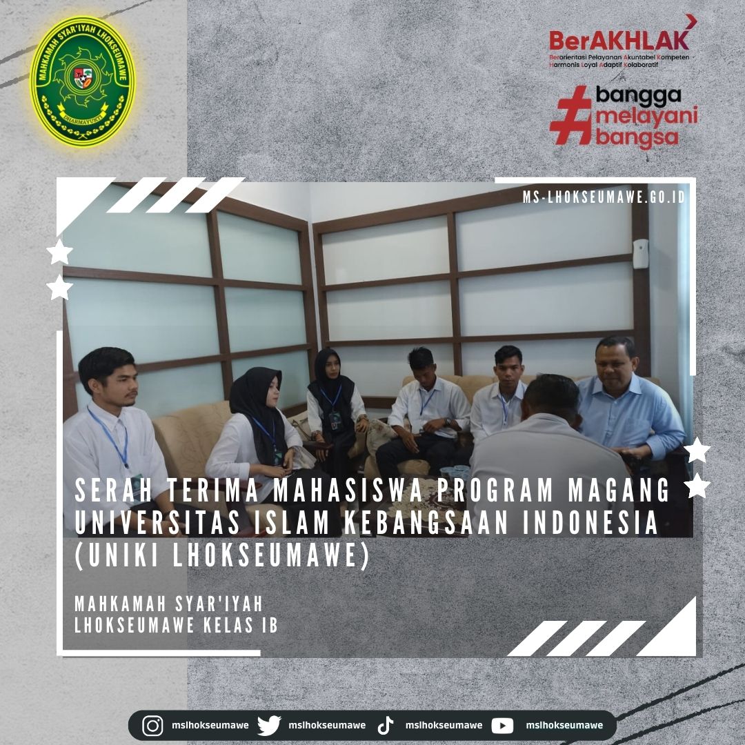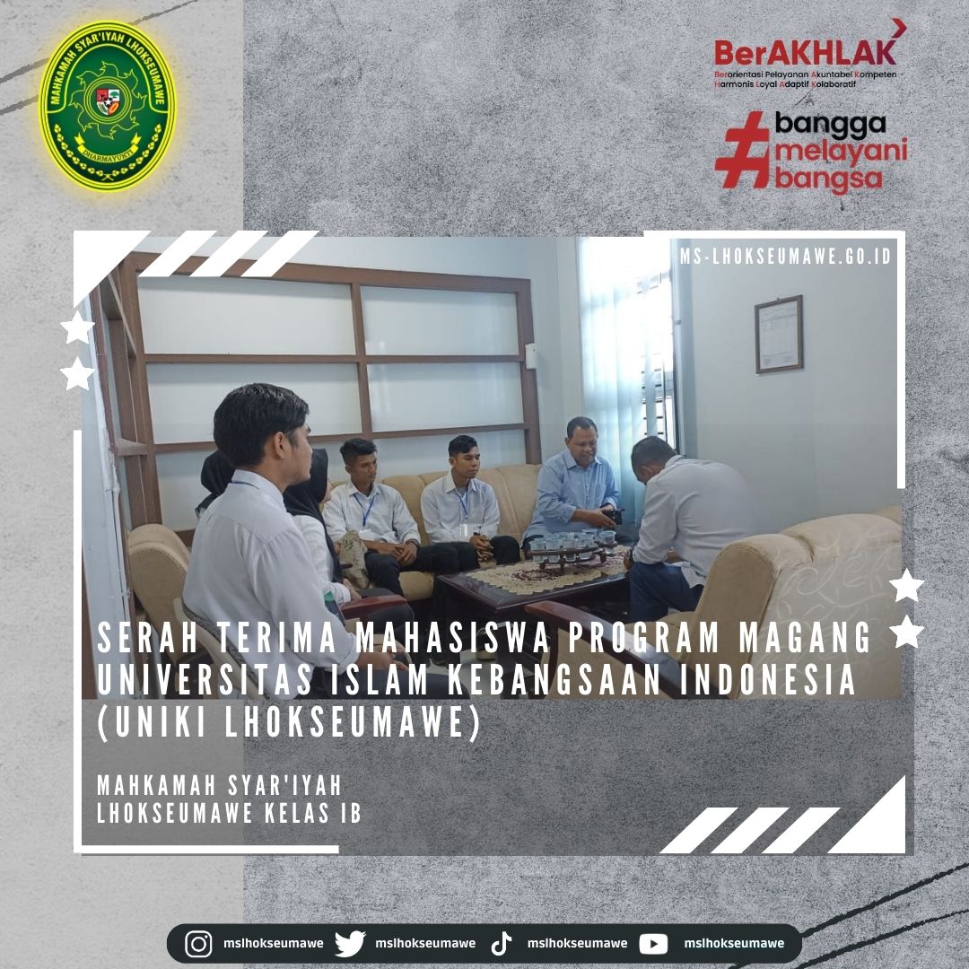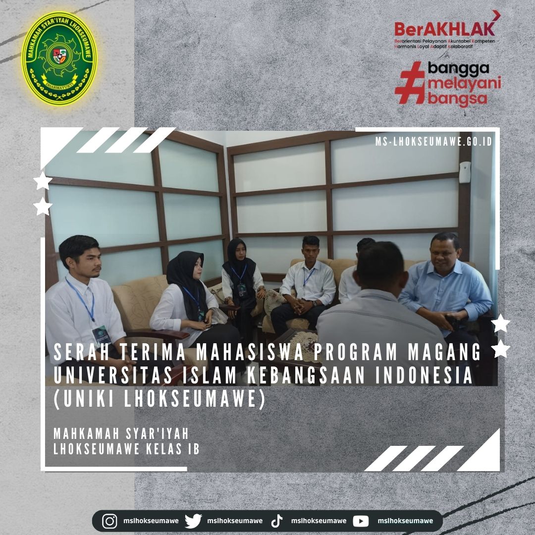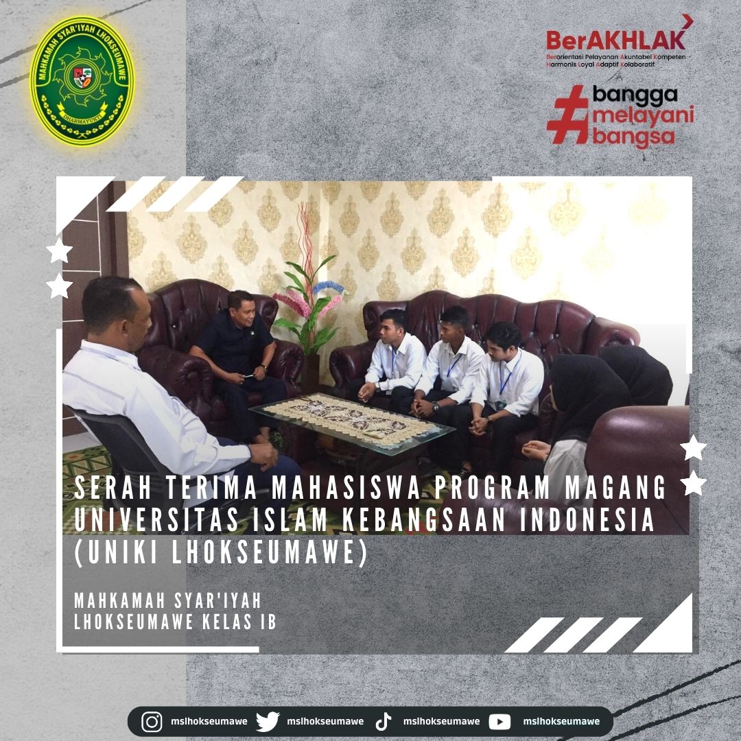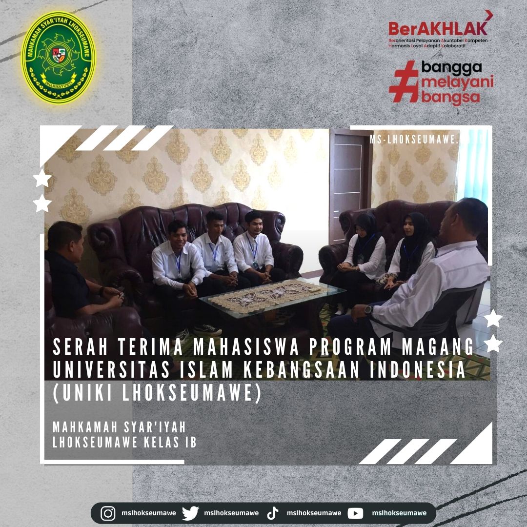 Dalam rangka pemantapan kemampuan mahasiswa mahasiswi Fakultas Komputer dan Multimedia (FKOM) Program Studi Strata Satu (S-1) yang berdasarkan surat nomor 30/FKOM-UNIKI/KN.2023 dari Univesitas Islam Kebangsaan Indonesia (UNIKI) tentang Permohonan Tempat Magang, Mahkamah Syar’iyah Lhokseumawe menerima dan memberi kesempatan Program Magang kepada UNIKI untuk melaksanakan Praktik Magang selama 6 (enam) bulan yang dilaksanakan tanggal 06 Februari 2023 s/d 04 Agustus 2023.