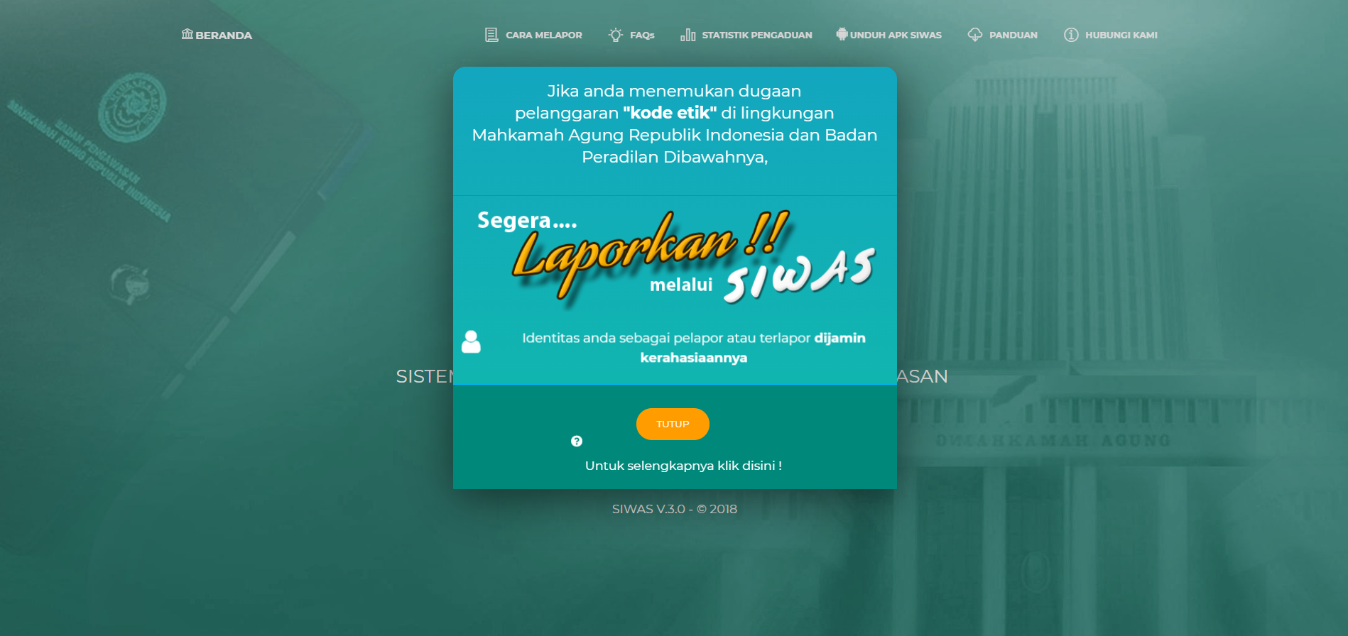 Sistem Informasi Pengawasan Mahkamah Agung Republik Indonesia disingkat SIWAS adalah aplikasi Pengaduan yang disediakan oleh Badan Pengawasan Mahkamah Agung. Siwas ditujukan untuk anda yang memiliki informasi dan ingin melaporkan suatu perbuatan berindikasi pelanggaran yang terjadi di Lingkungan Mahkamah Agung Republik Indonesia atau Peradilan di bawahnya.