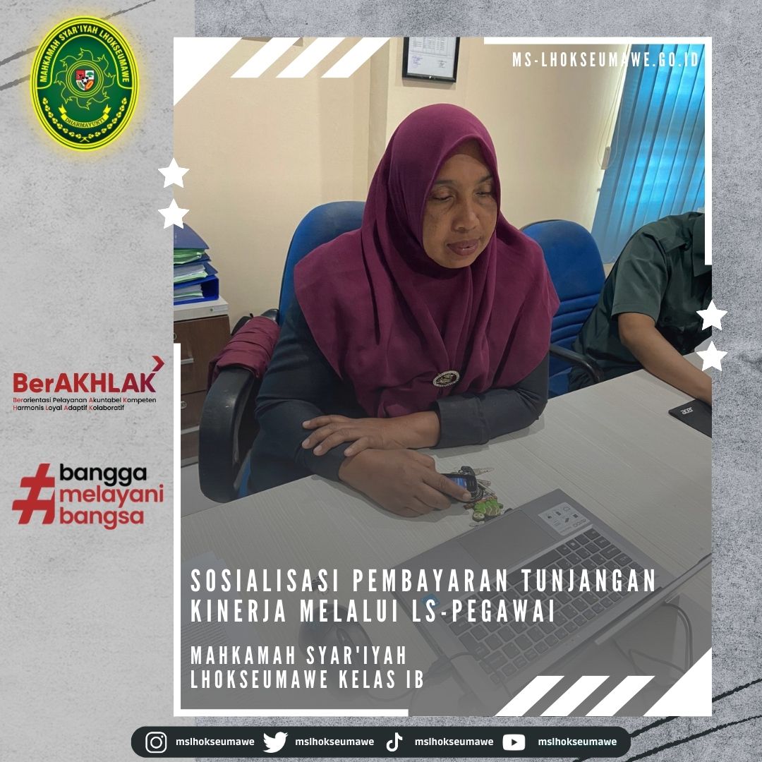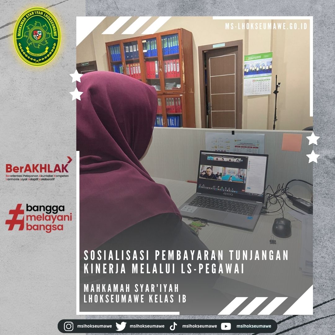 Kasubbag Umum dan Keuangan MS Lhokseumawe Ibu Roslia, S.H. ikuti sosialisasi secara daring. Sosialisasi dilakukan dalam rangka pembayaran tunjangan kinerja melalui LS-Pegawai.